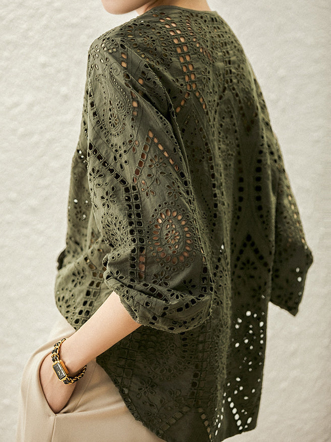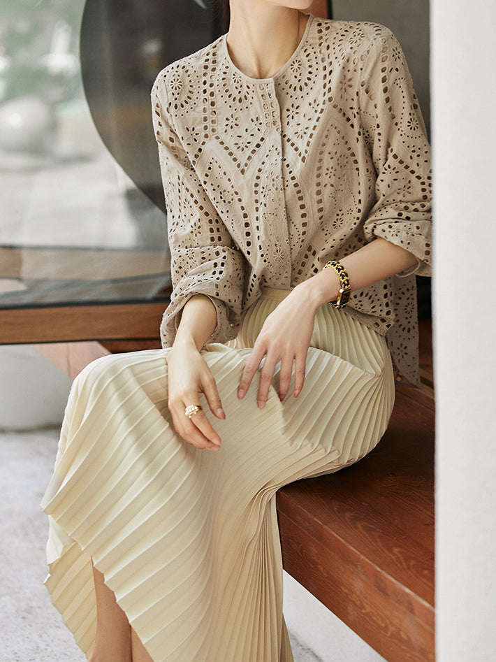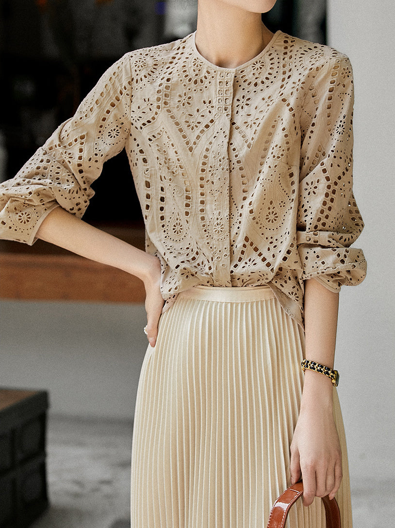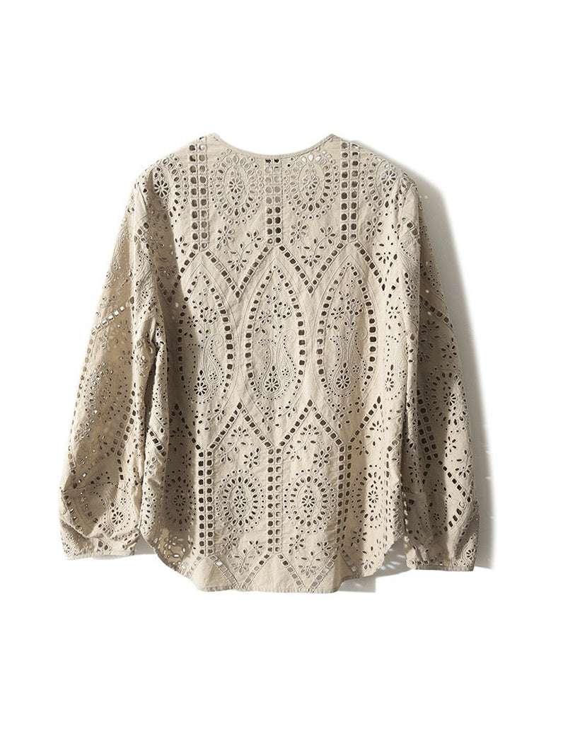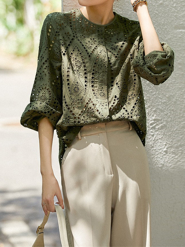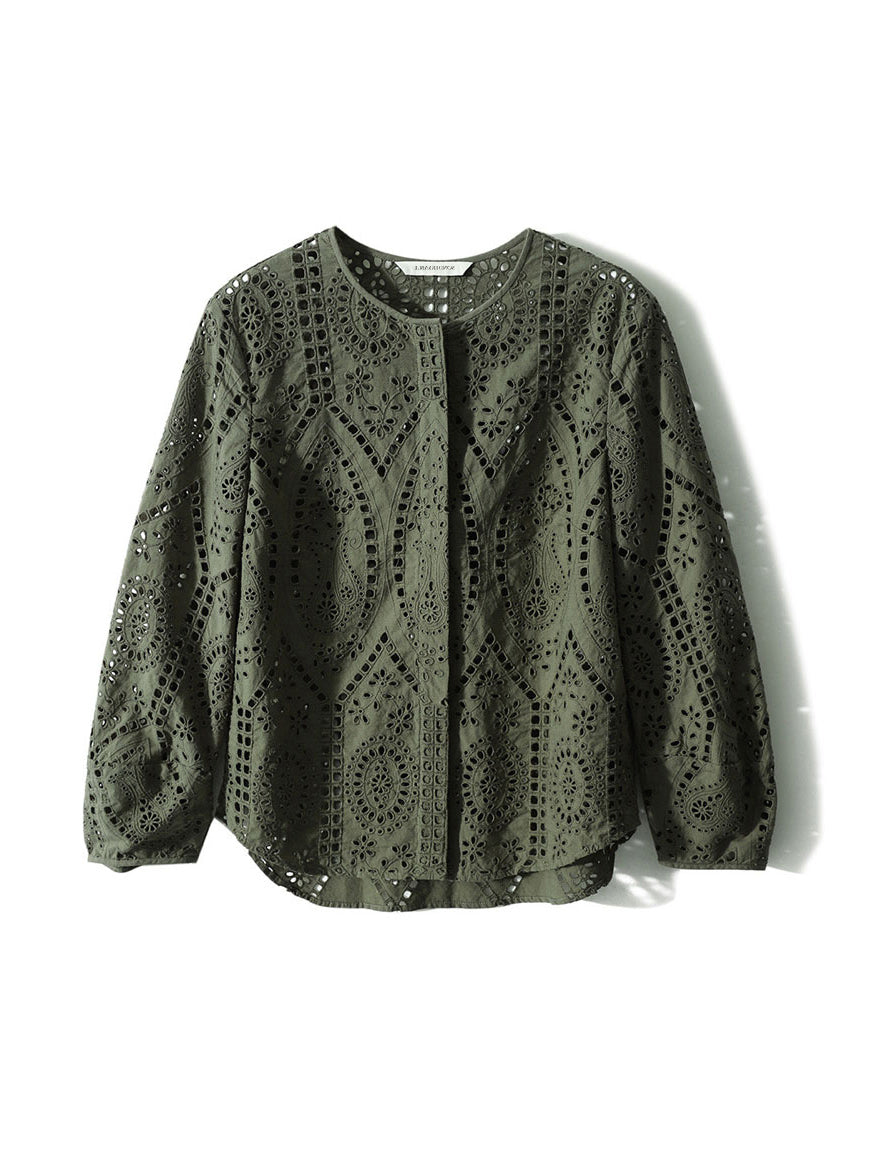 一枚でも、ジャケットのインナーとしても着られるカットワークレースブラウス。