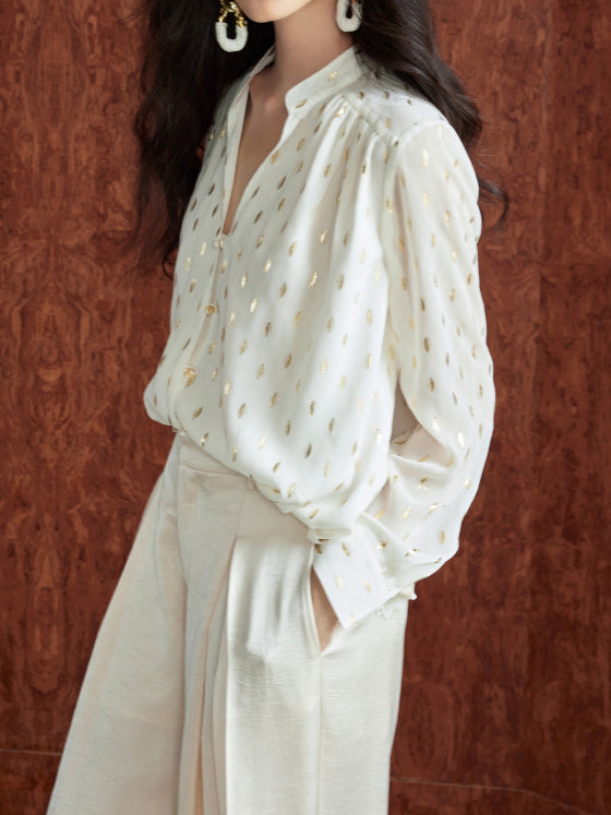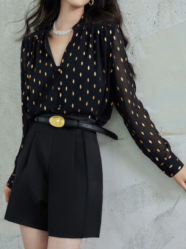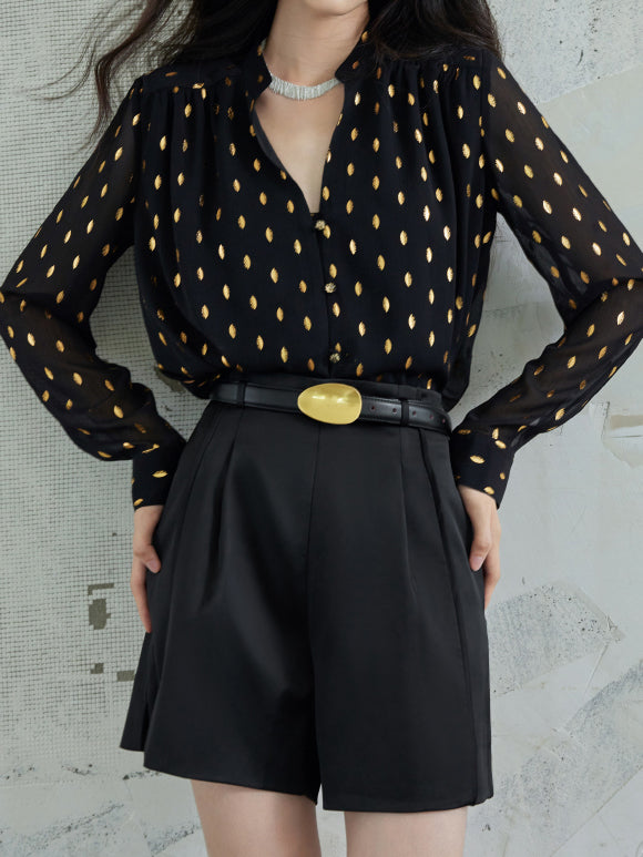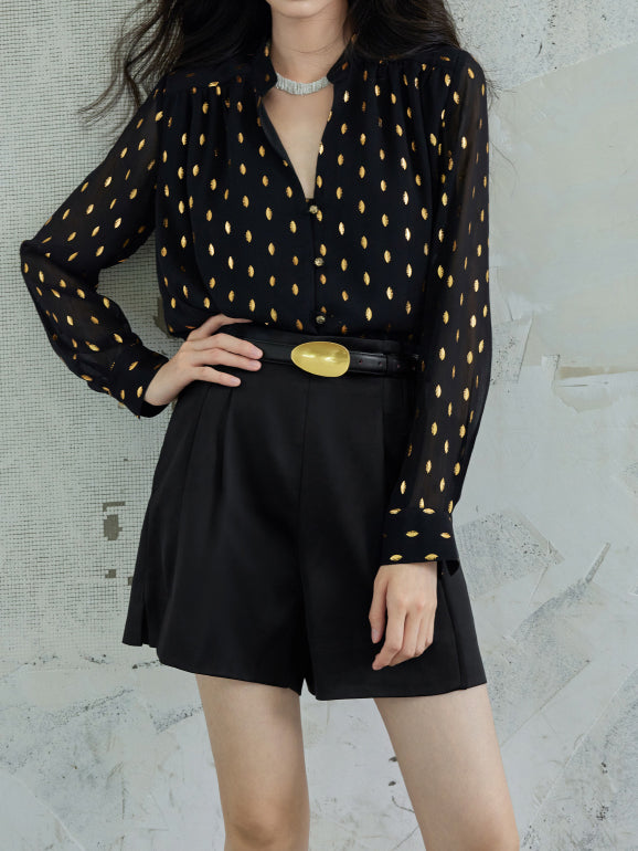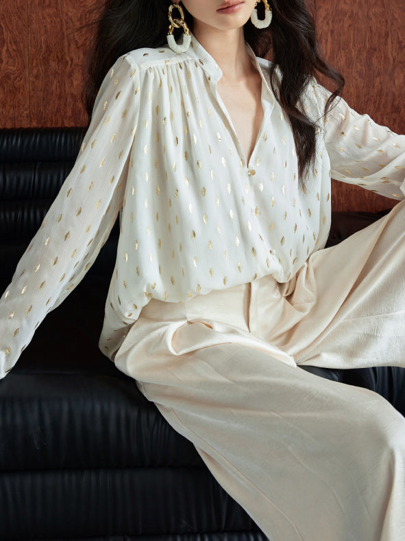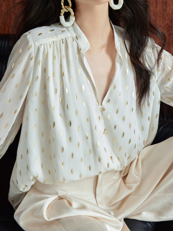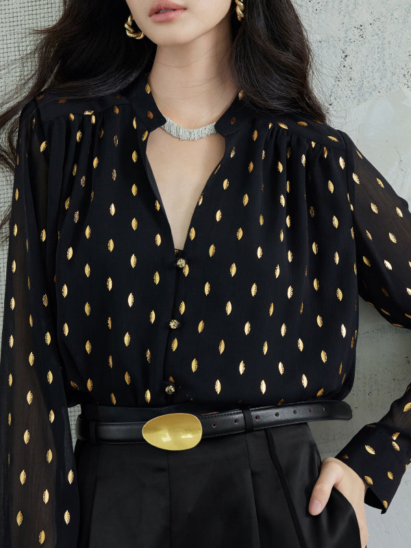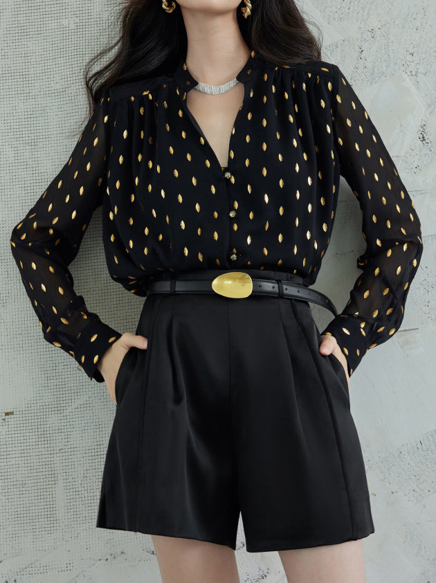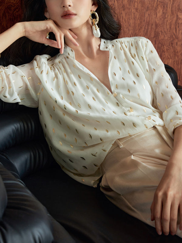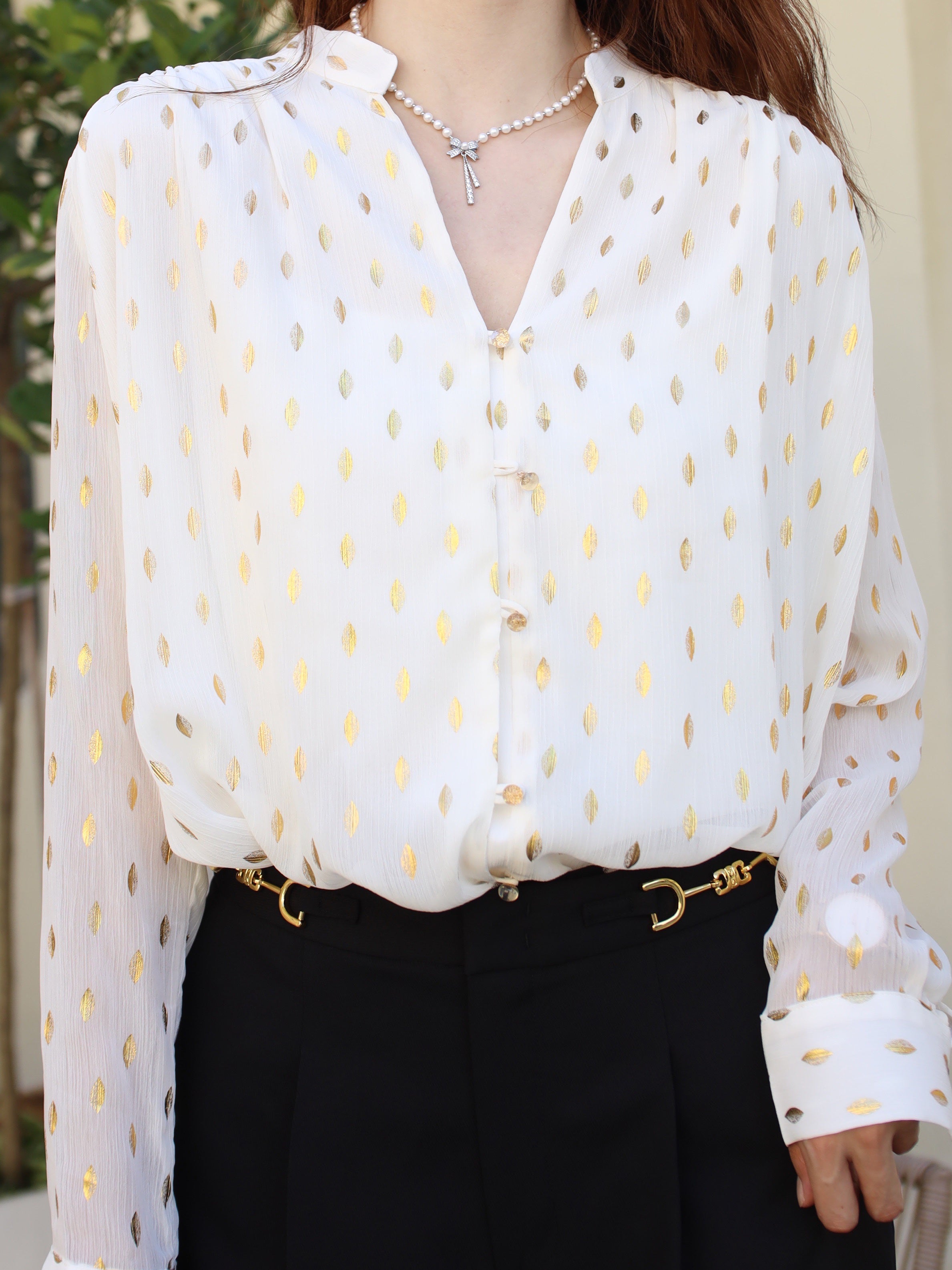 【流れ出る様なネックデザインがエレガントな印象の金プリントブラウス】
