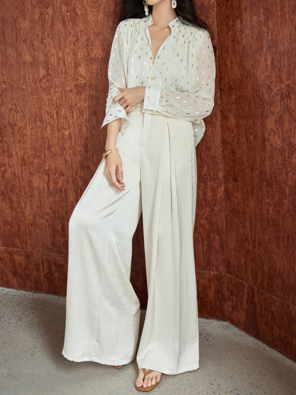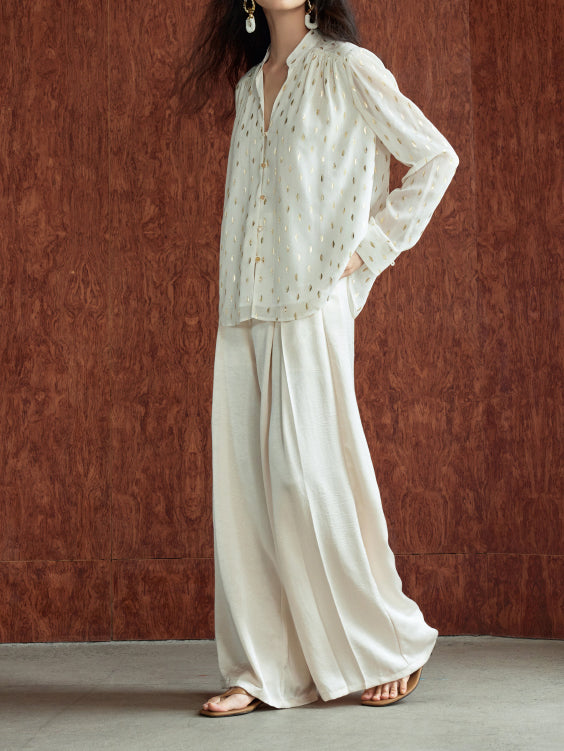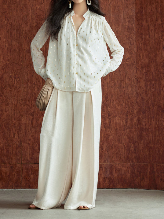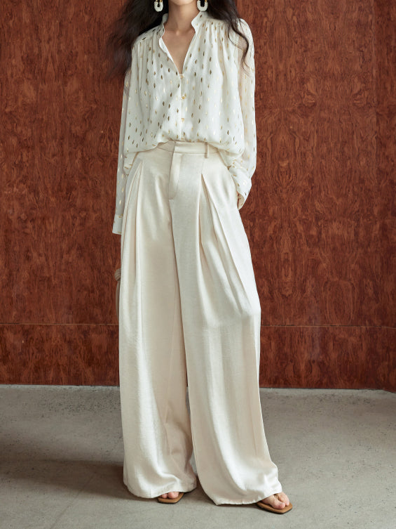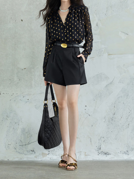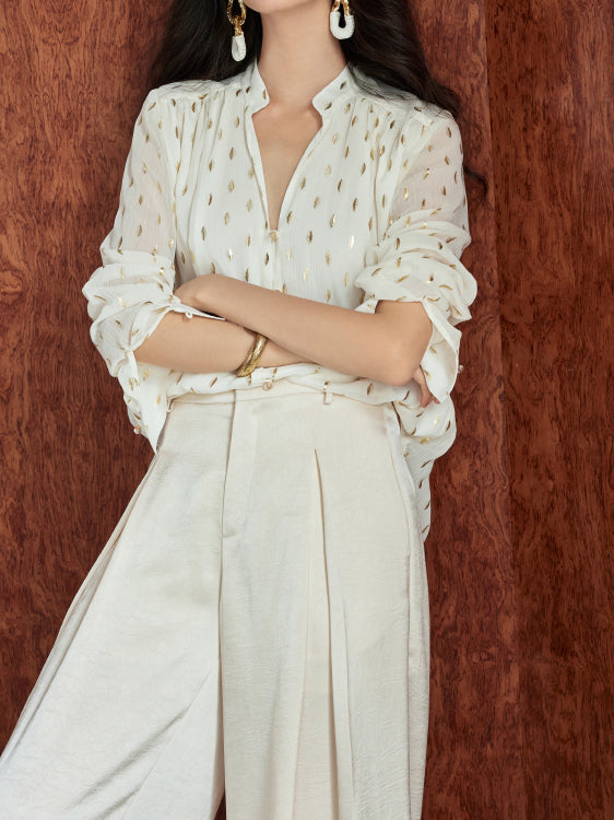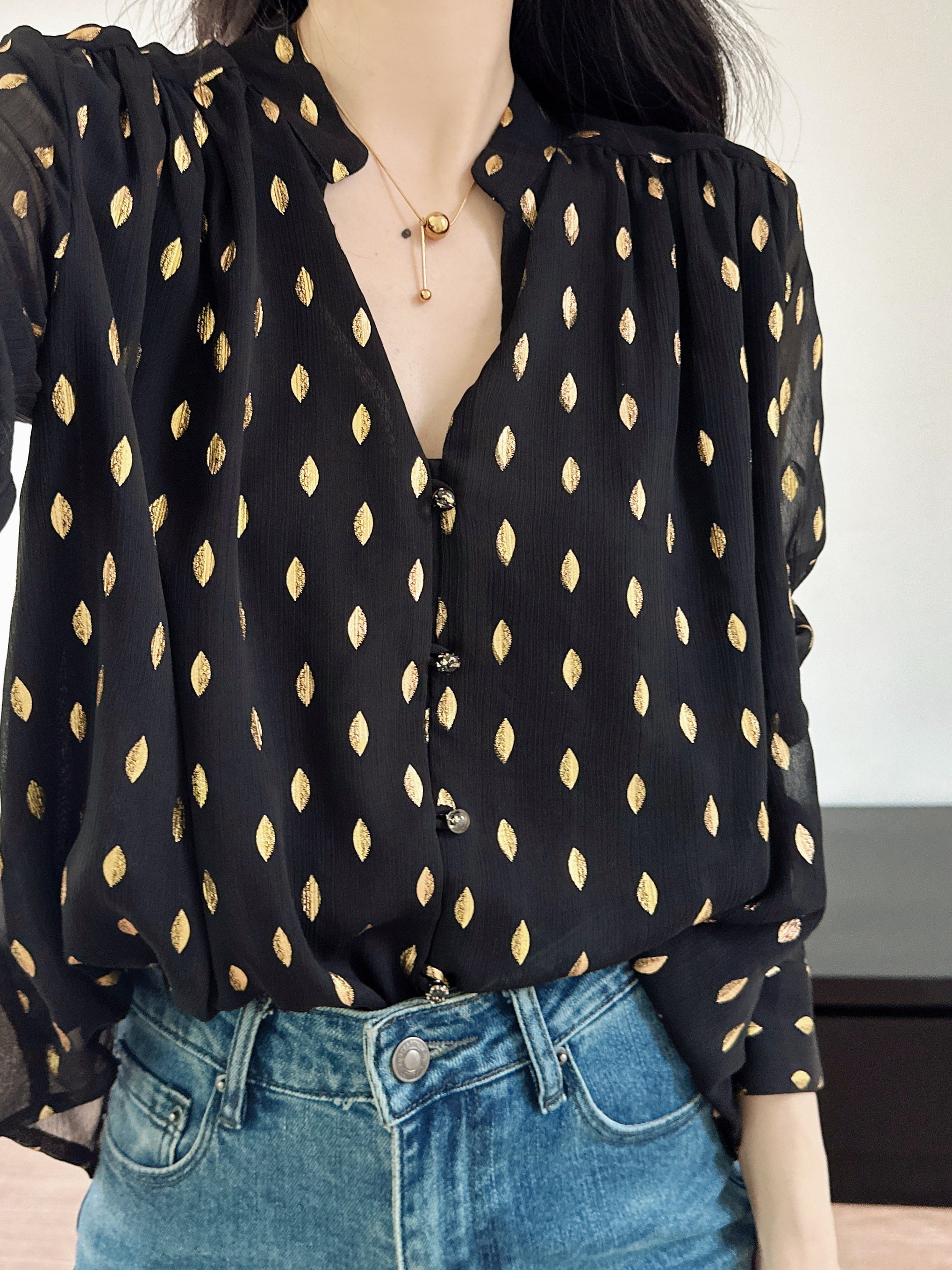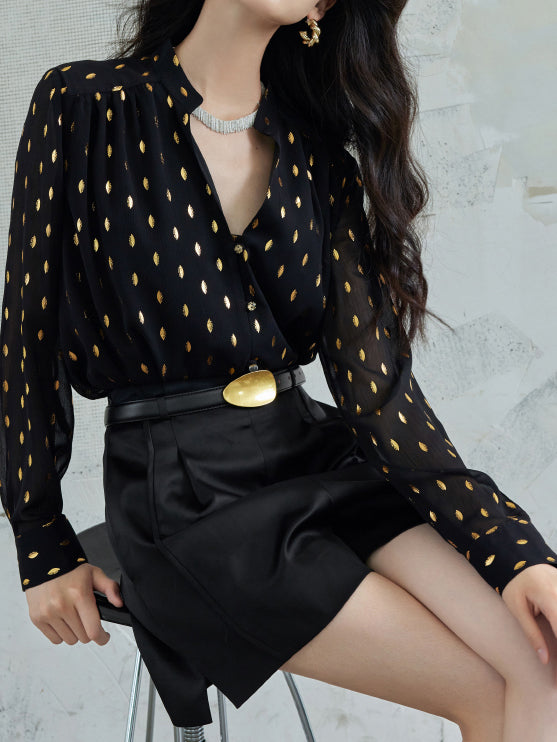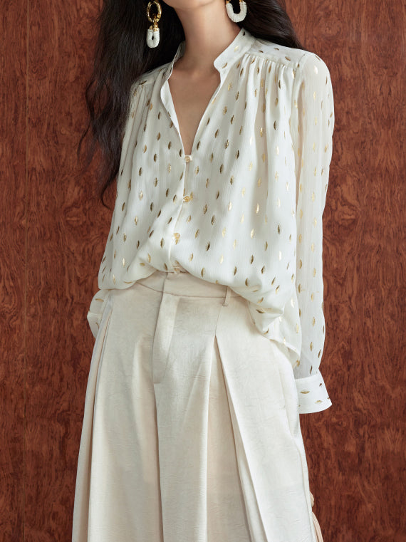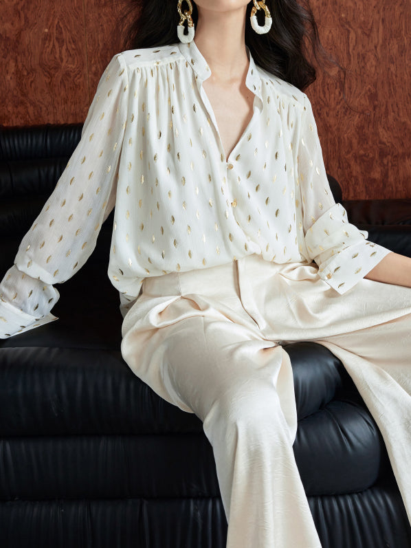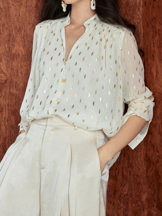 【流れ出る様なネックデザインがエレガントな印象の金プリントブラウス】
