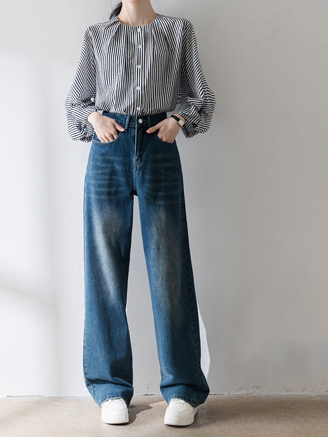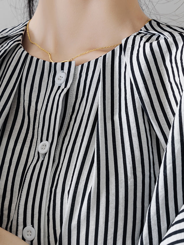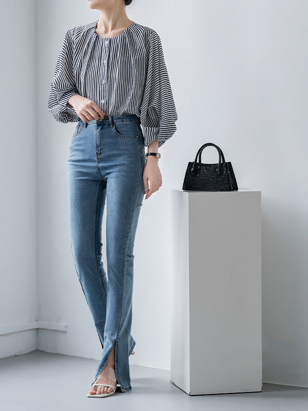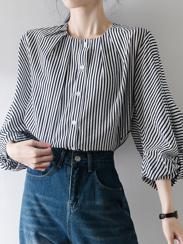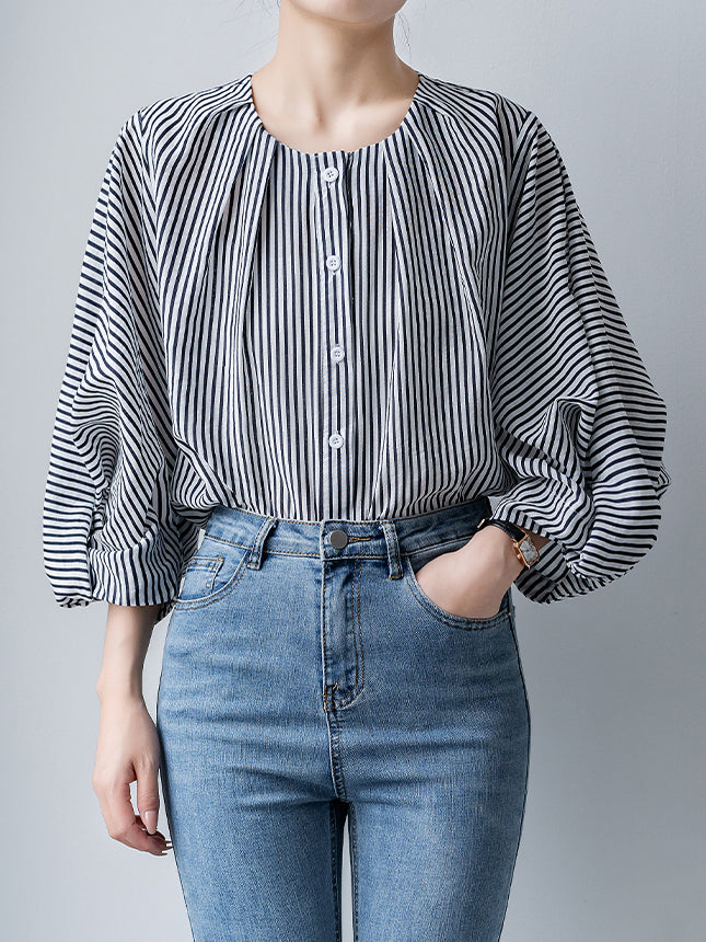 【セミマットなボリュームスリーブネックタックインブラウス】