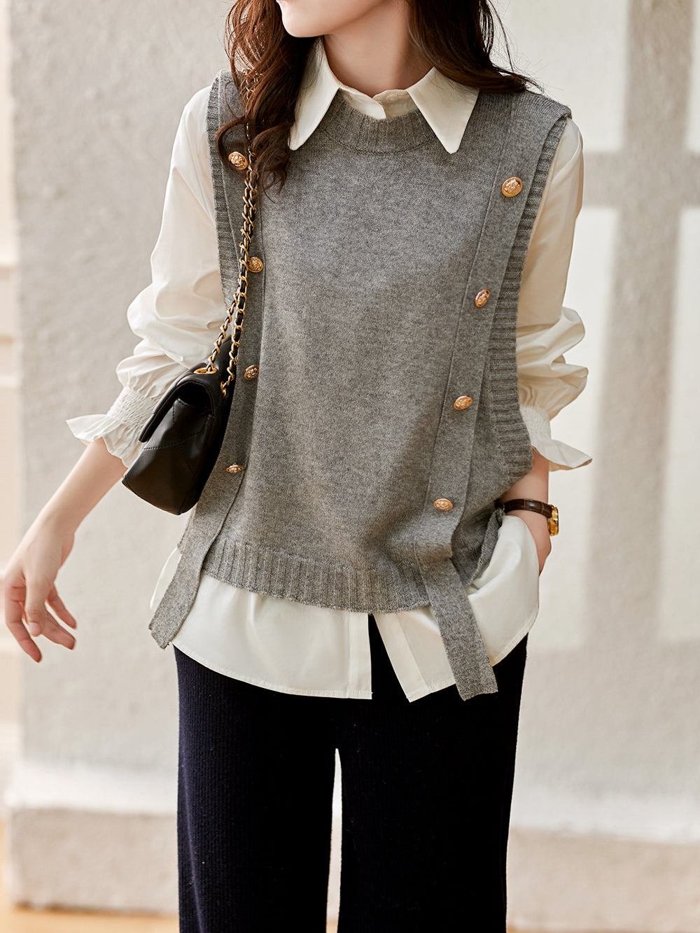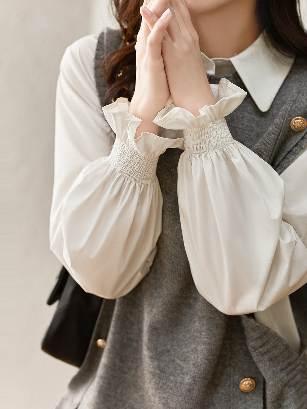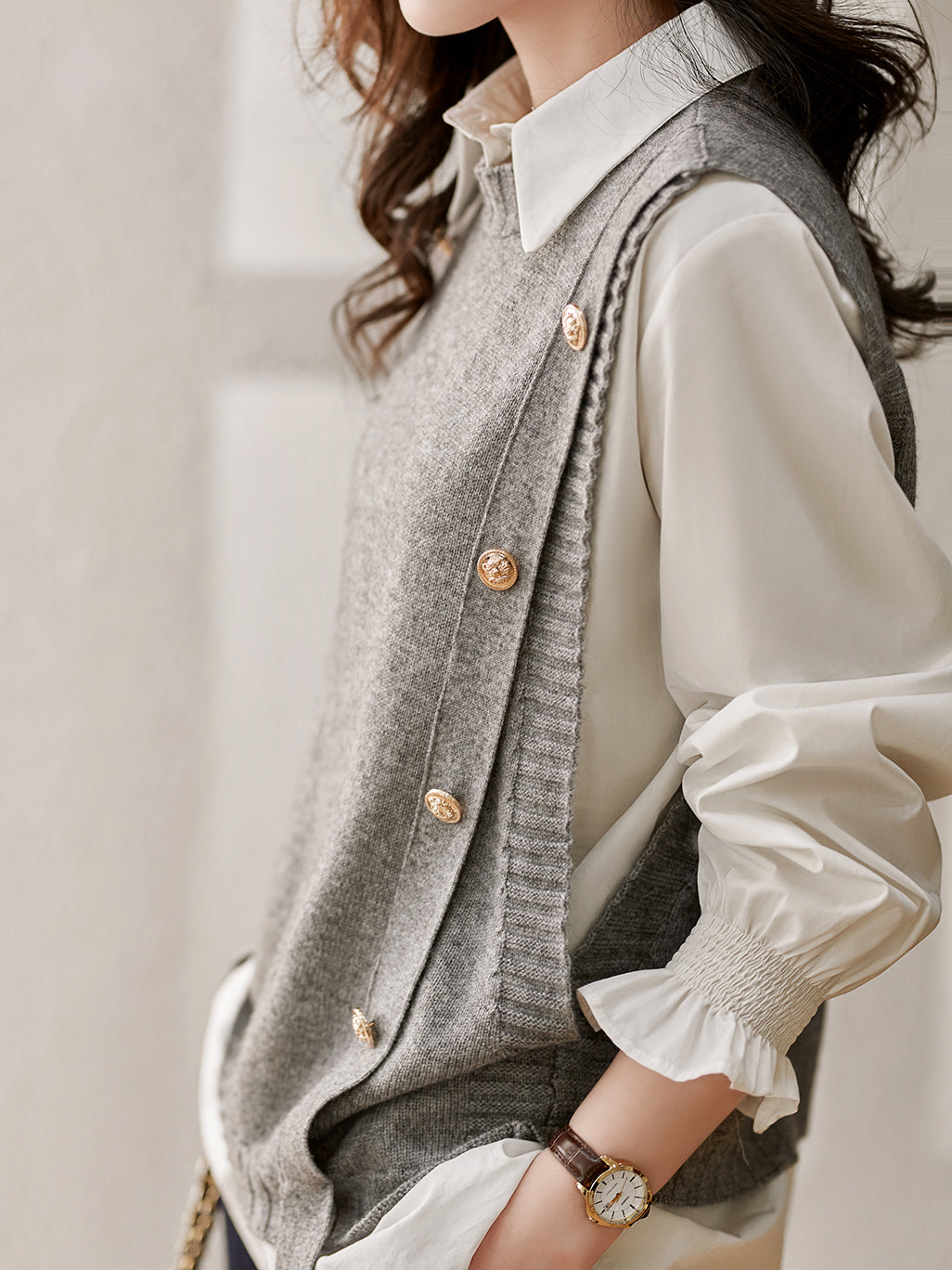ゴールドボタンがアクセントの華やかニットベストとキャンディースリーブシャツのお得なセット。