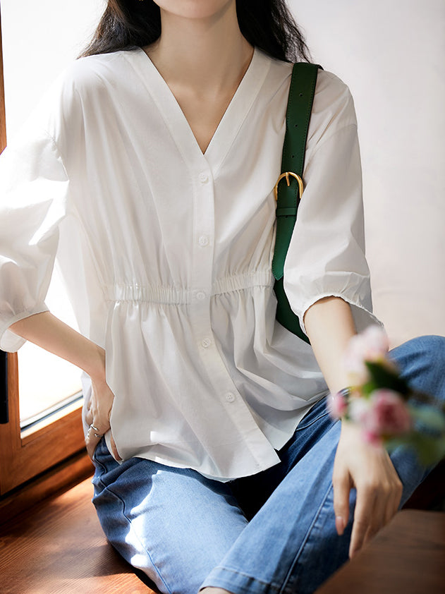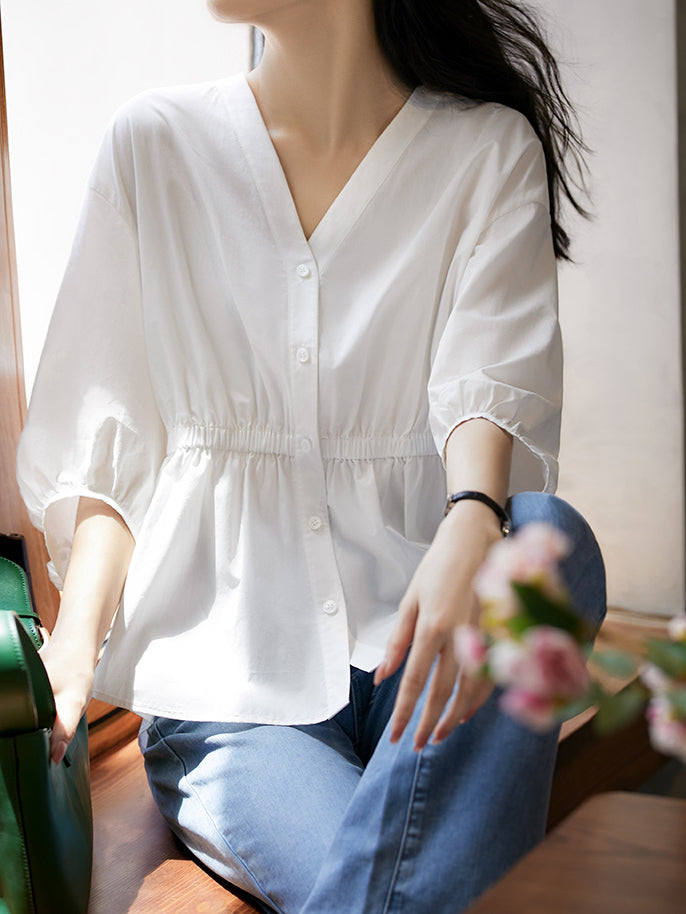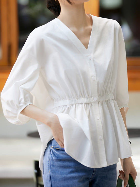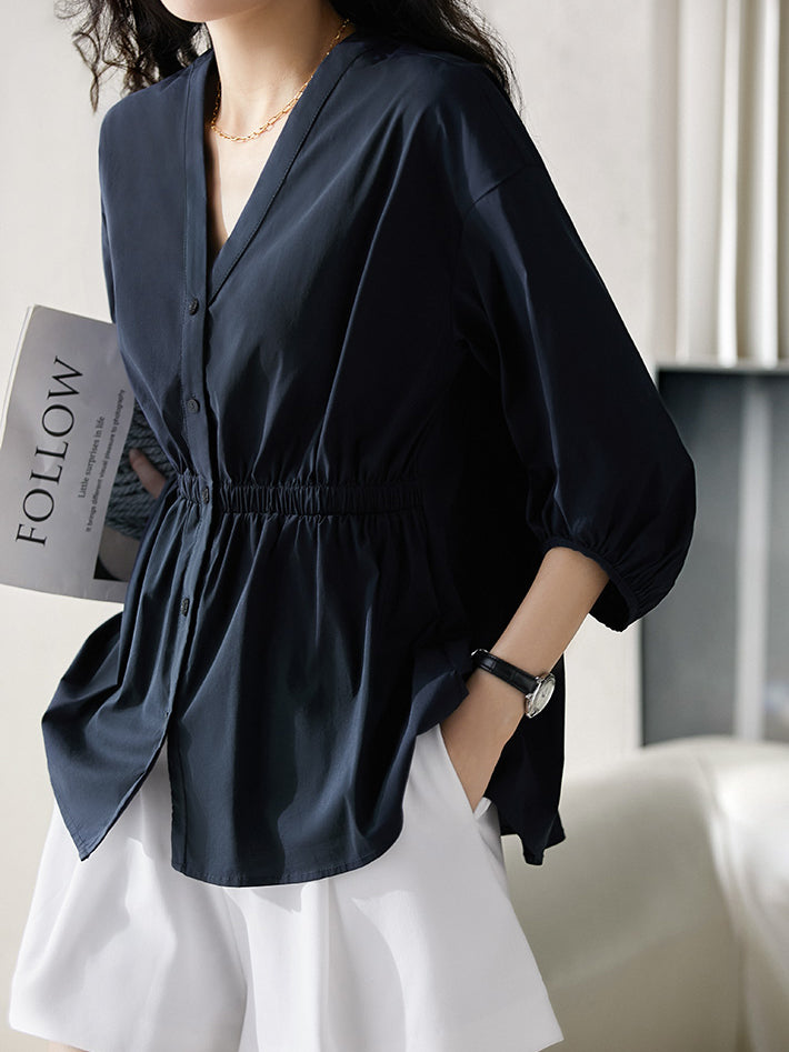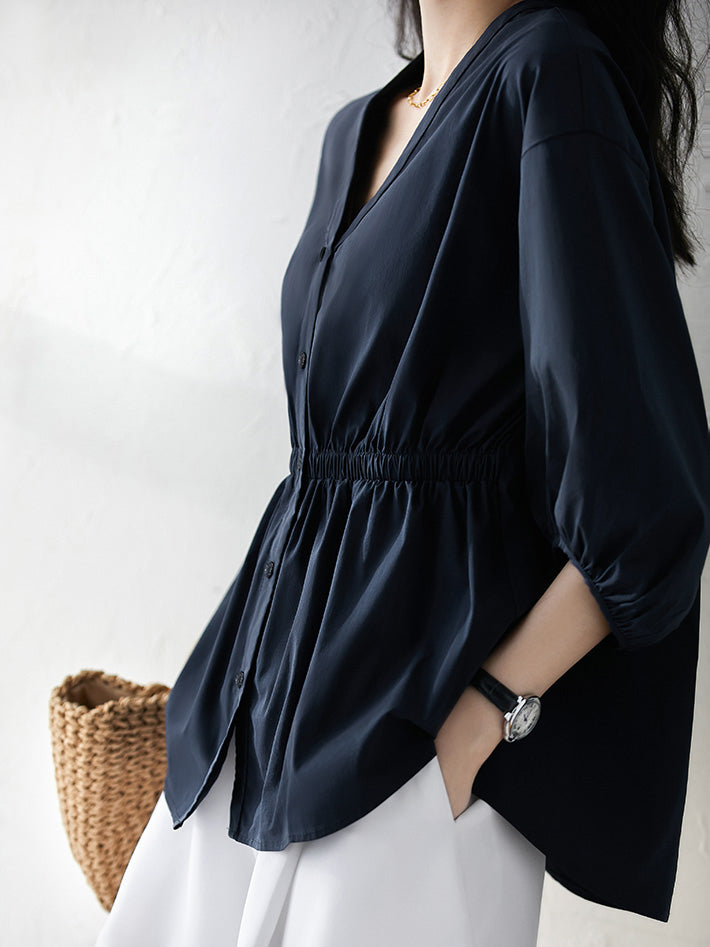 Vネックギャザーぺプラムブラウス 2色入