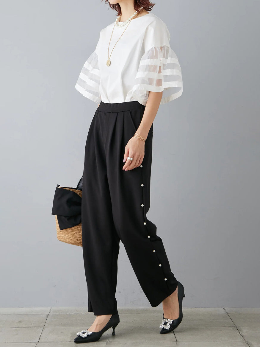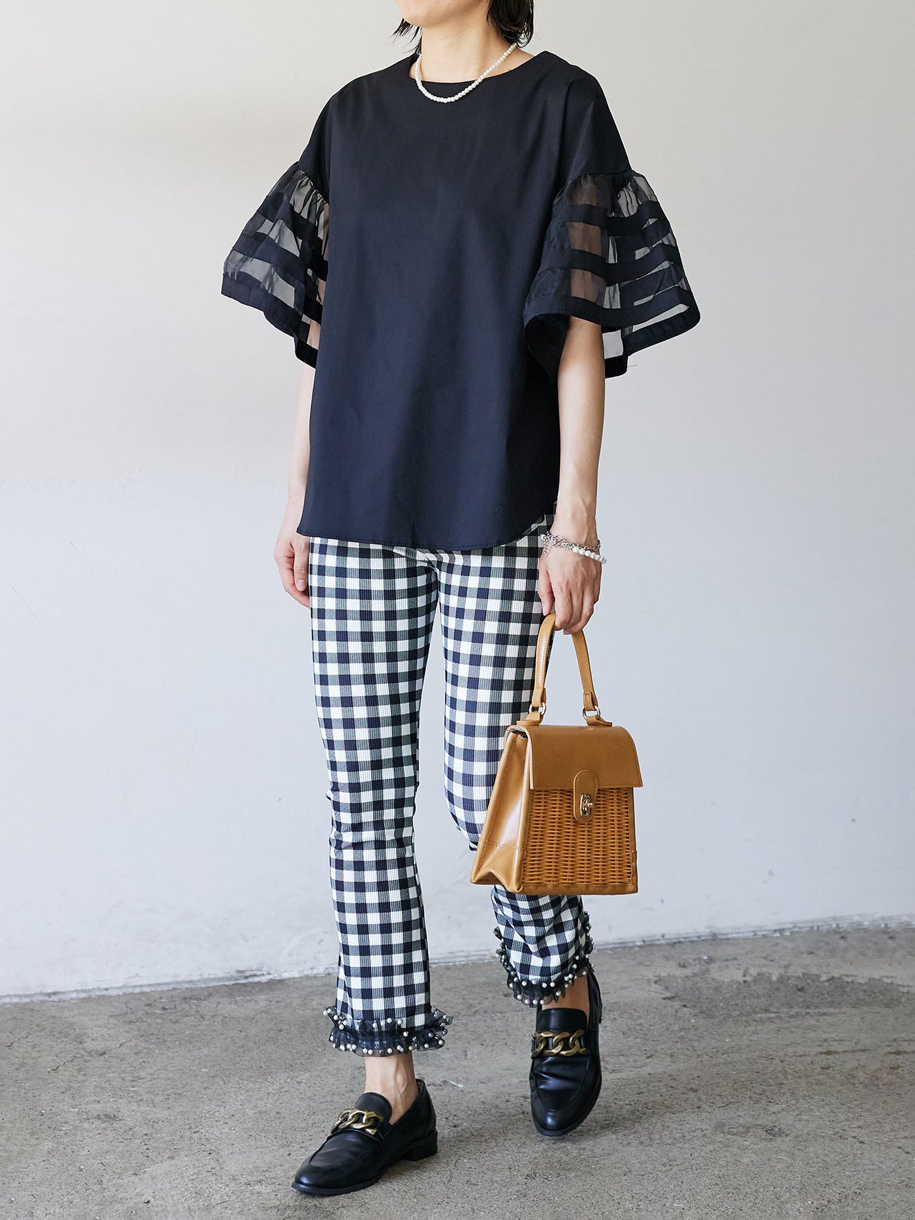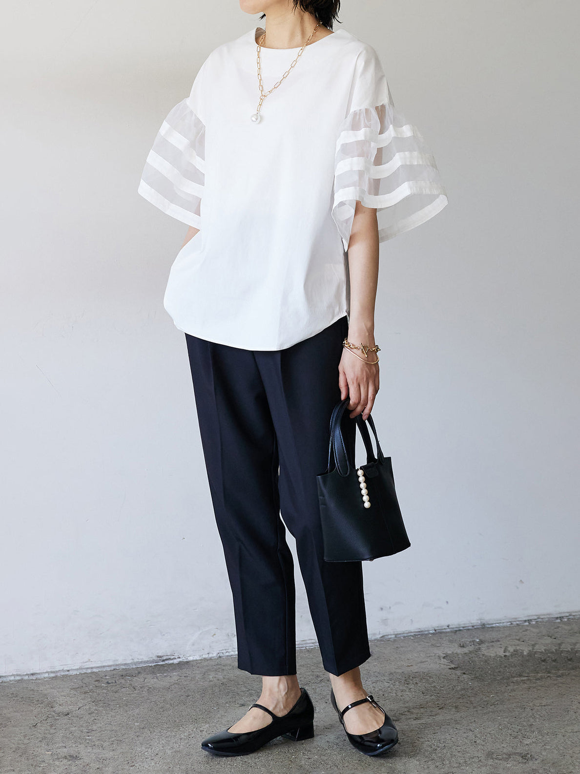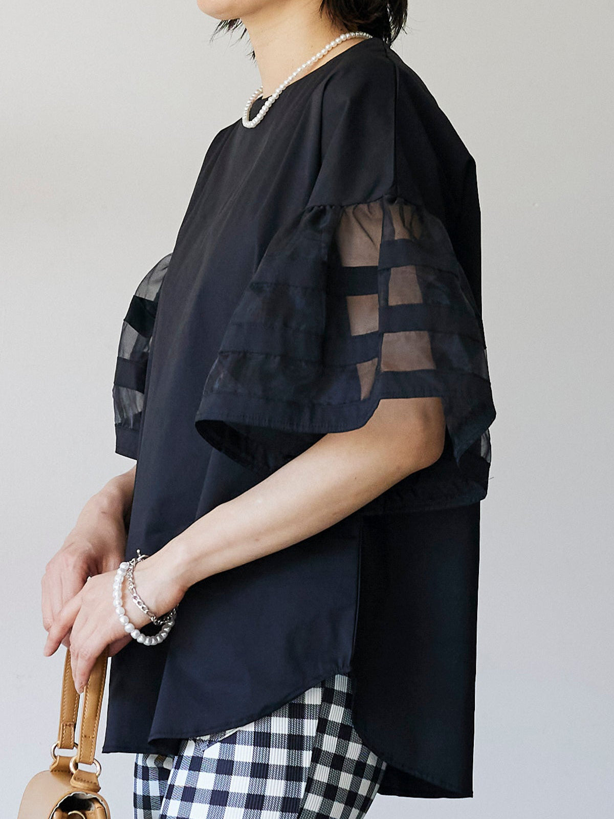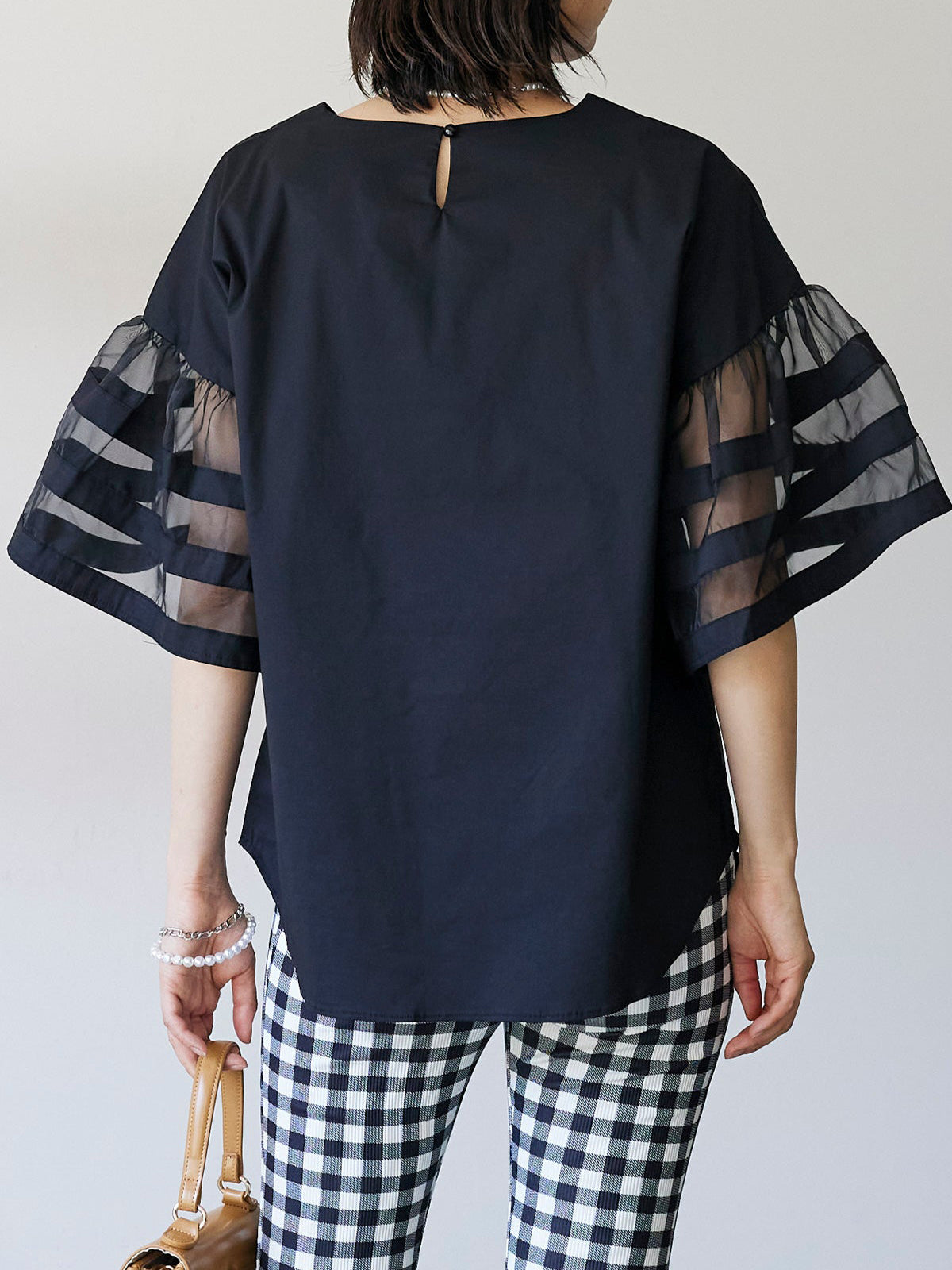 【ラインの入ったオーガンジースリーブが華やかなプルオーバーブラウス】
