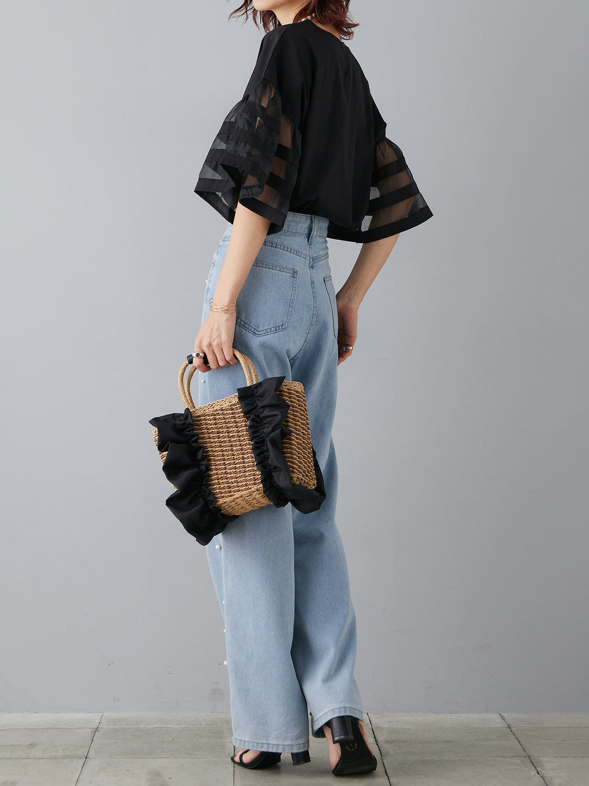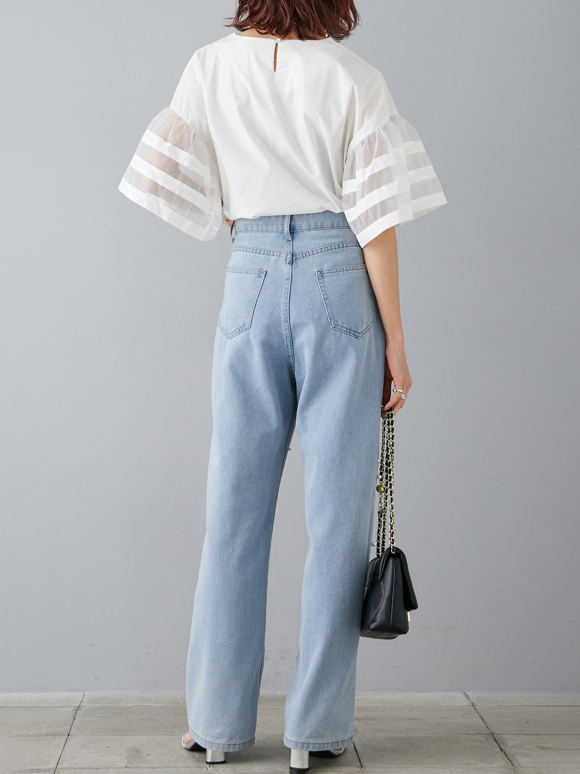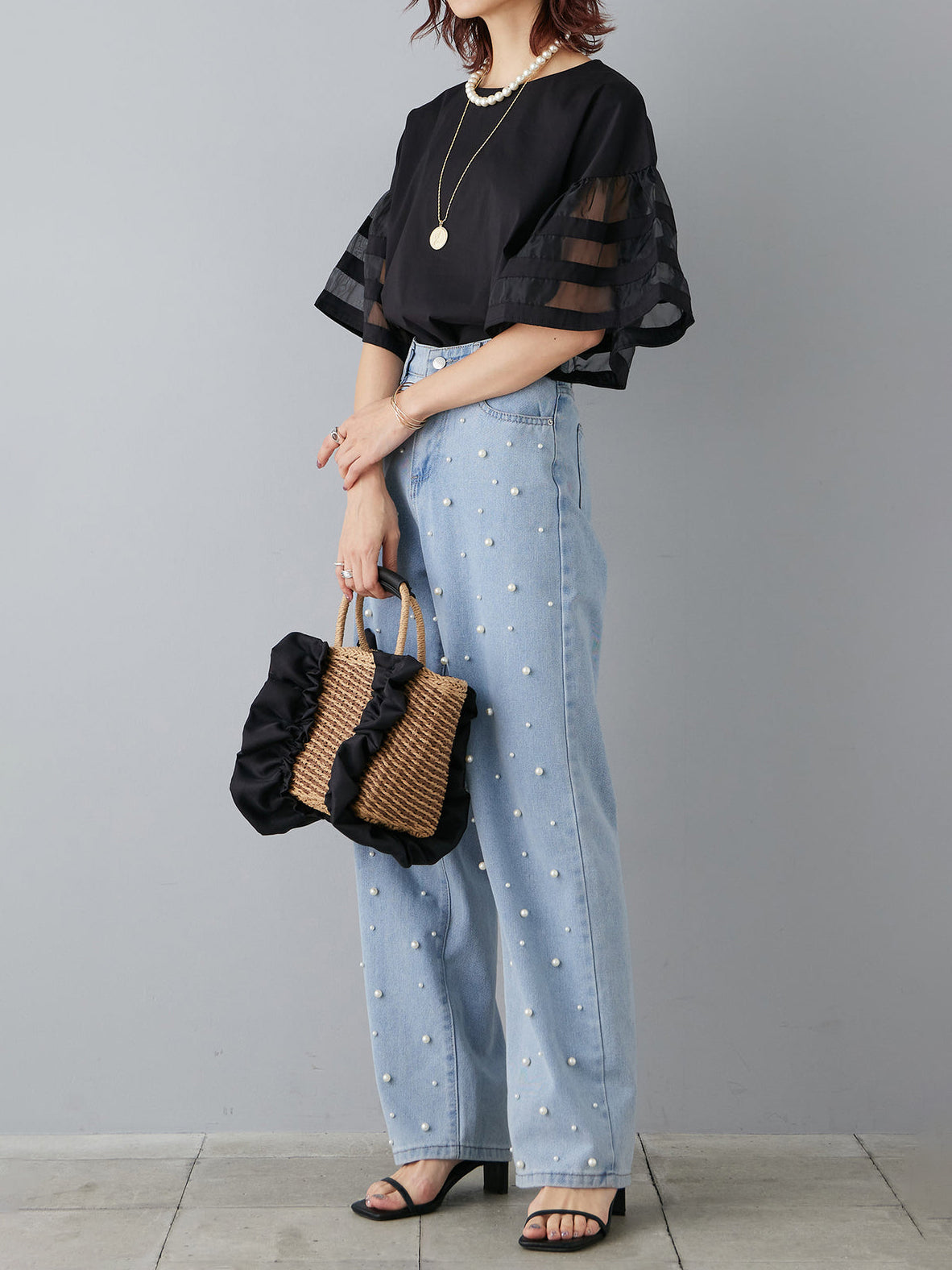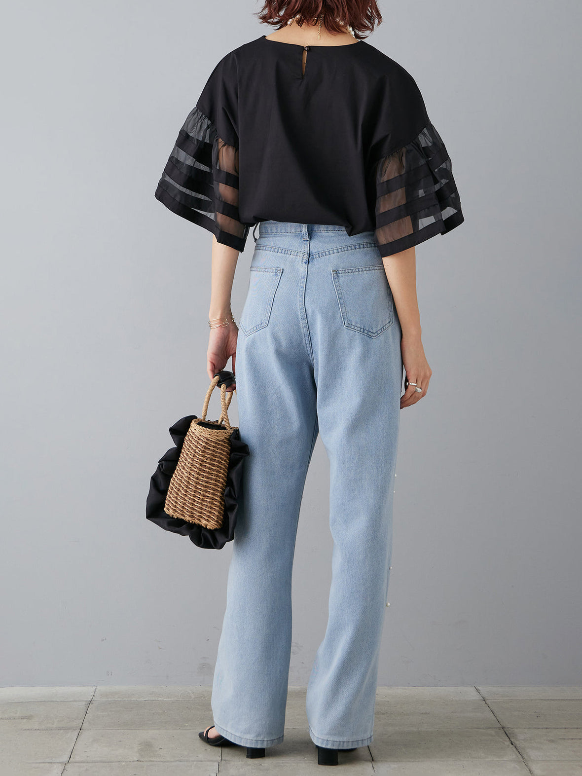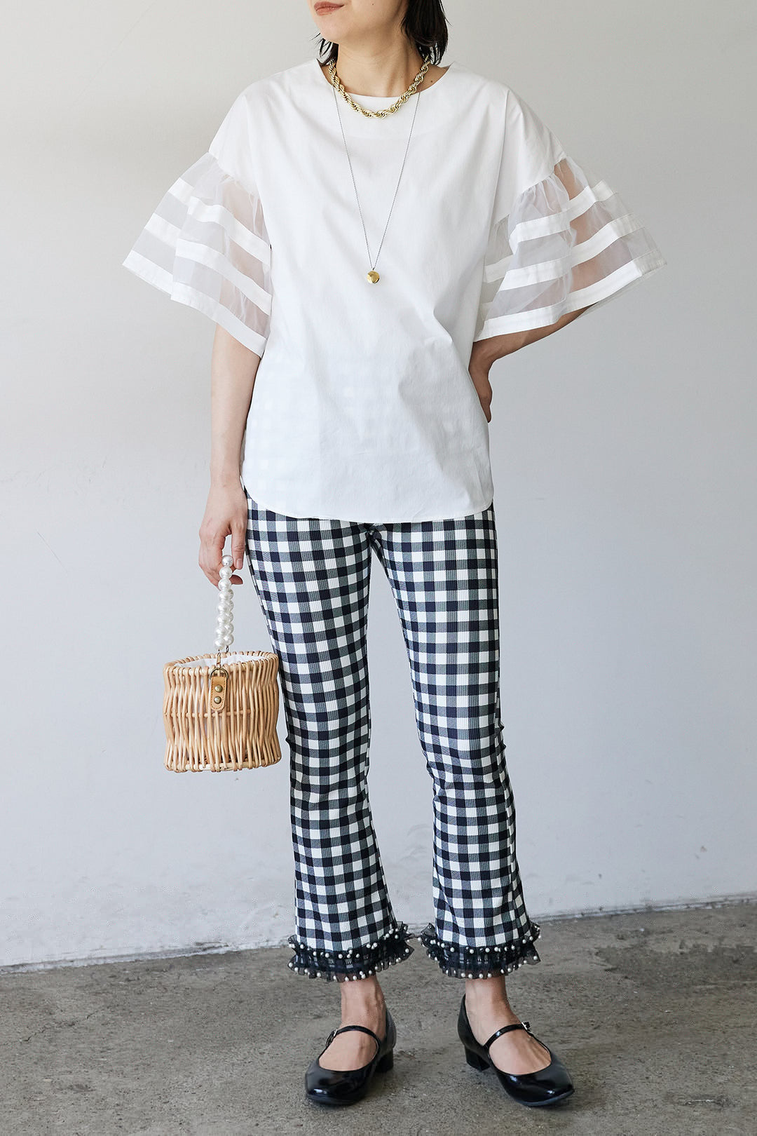 【ラインの入ったオーガンジースリーブが華やかなプルオーバーブラウス】