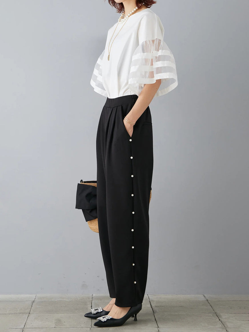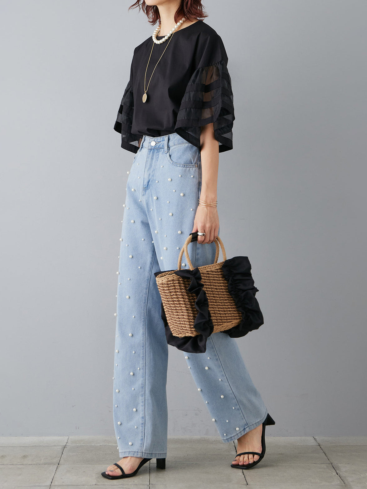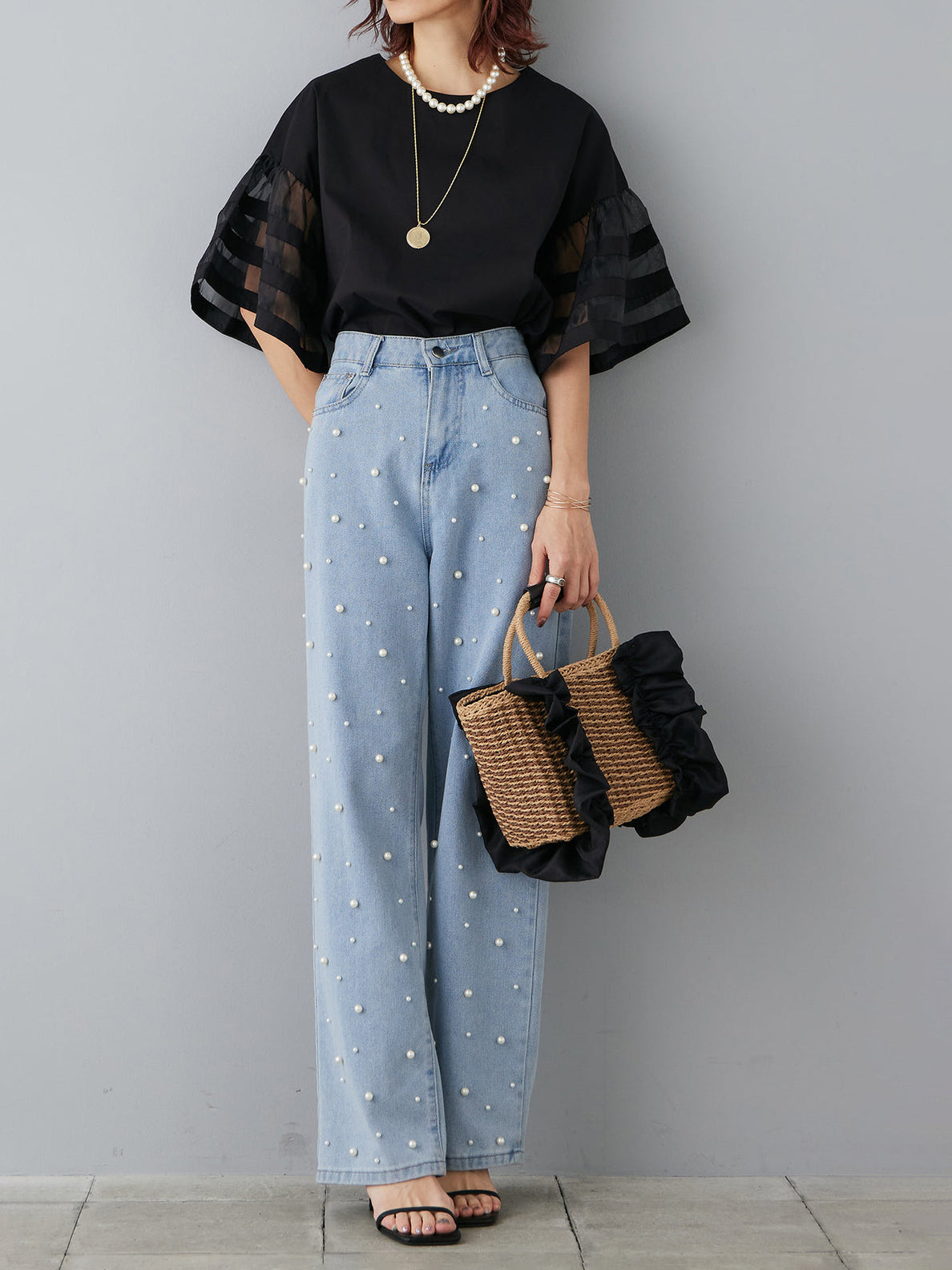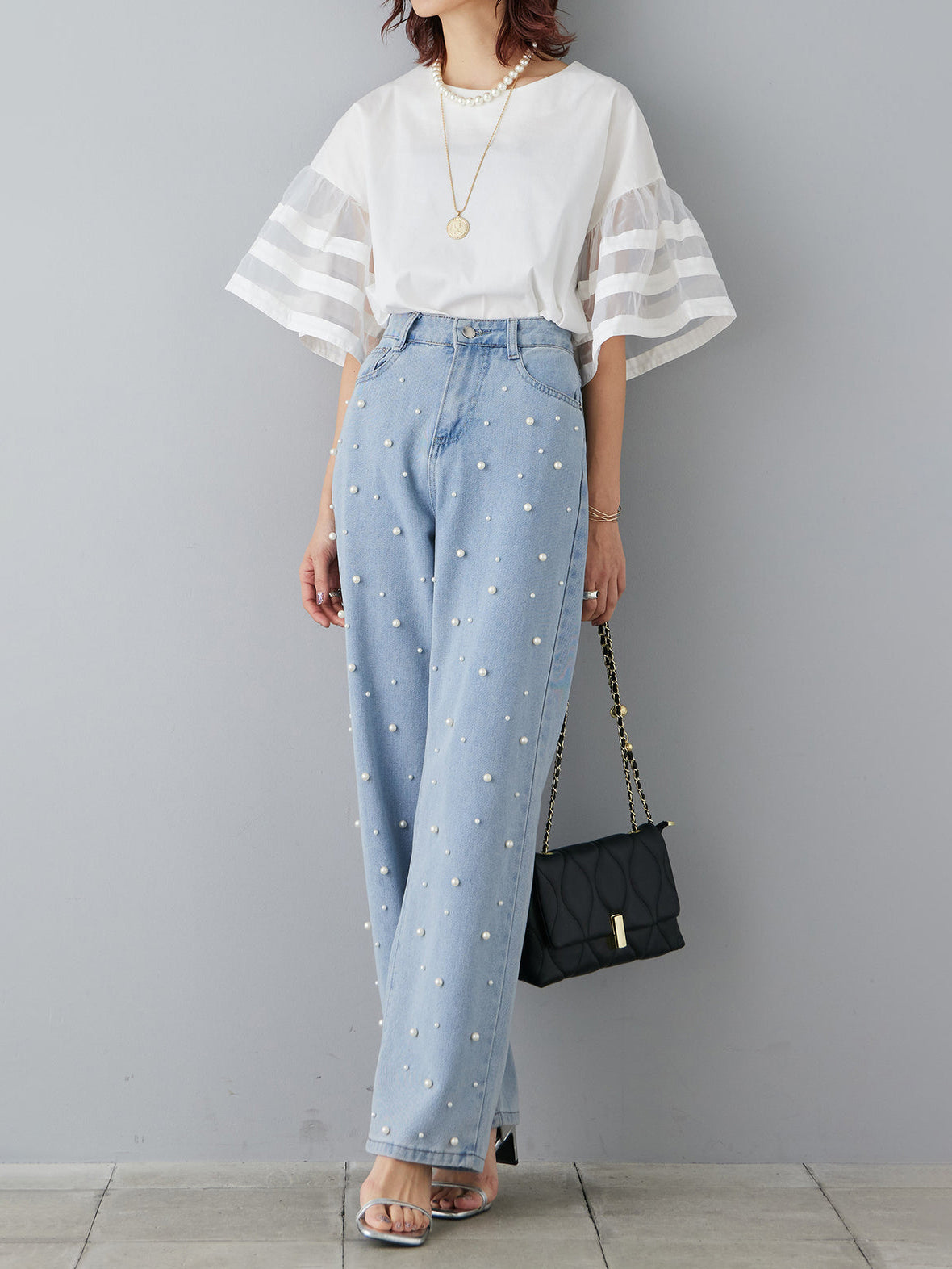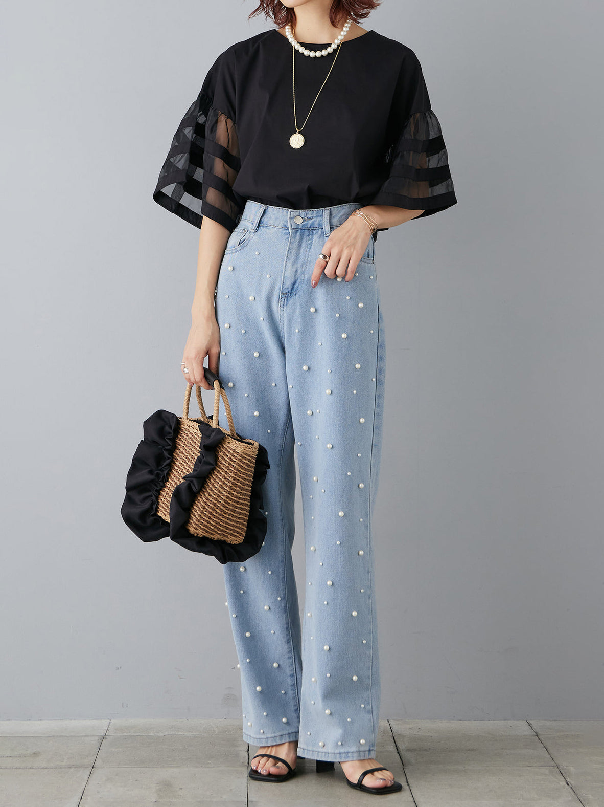 【ラインの入ったオーガンジースリーブが華やかなプルオーバーブラウス】