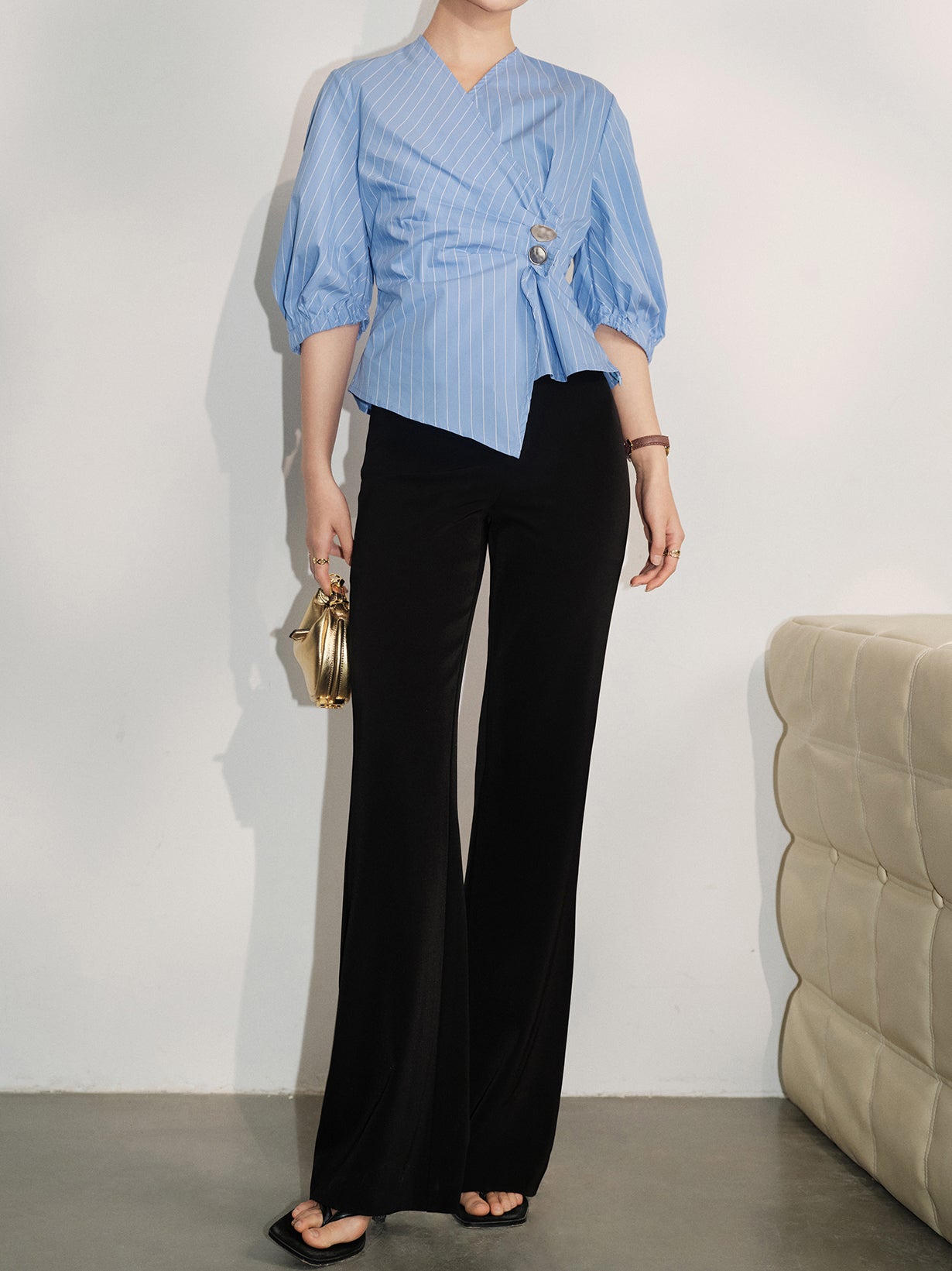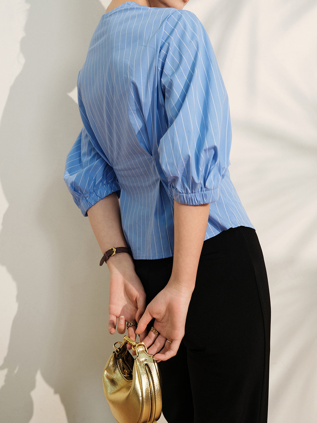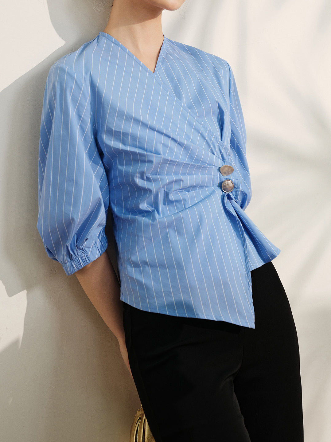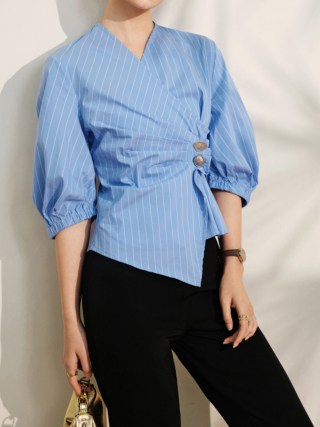 優雅なストライプ柄とフェミニンなカシュクールデザインが特徴です。