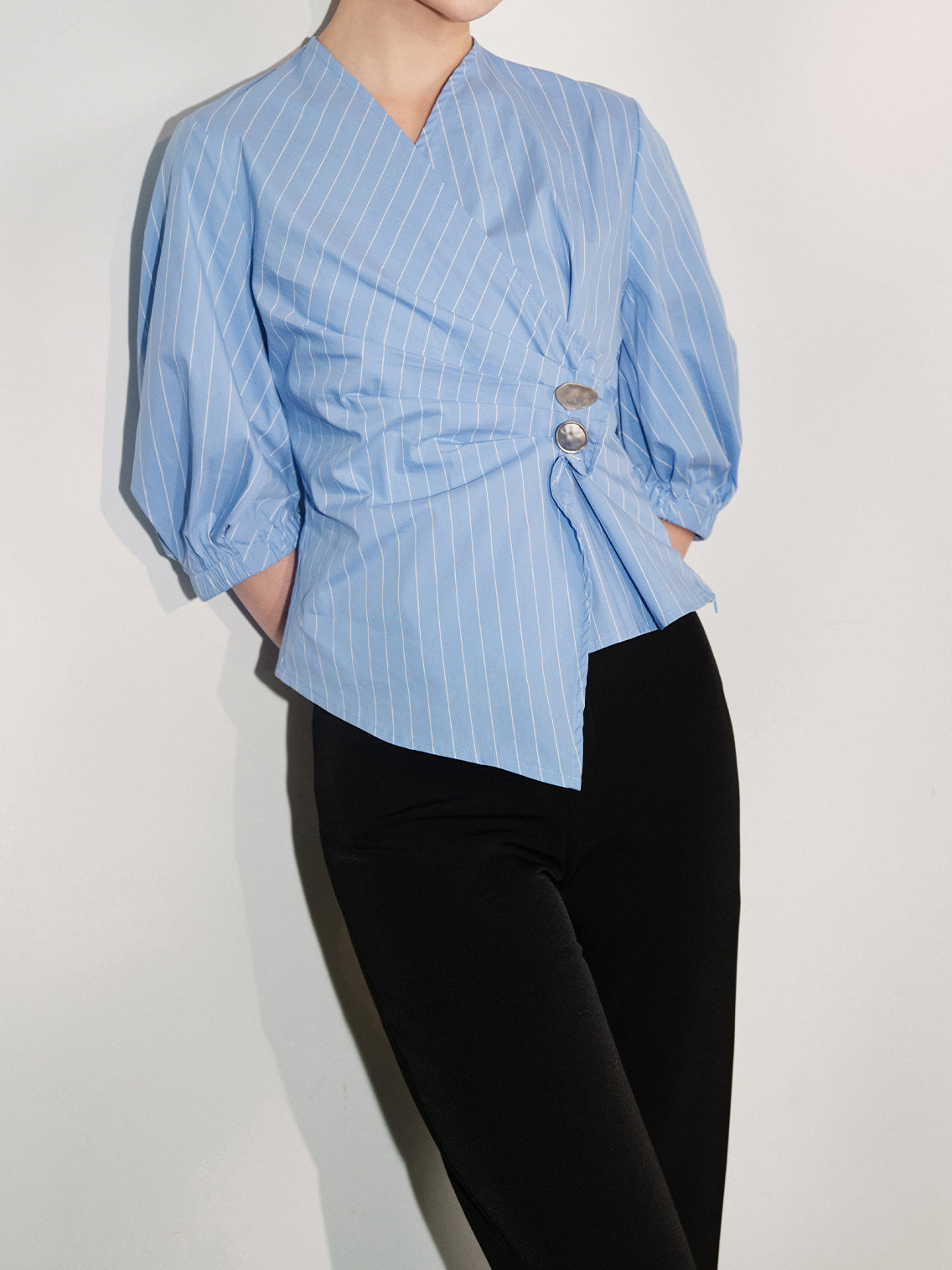 ☆サイドのボタンがアクセントになり、シンプルなボトムスを合わせるだけでサマになるトップスです。