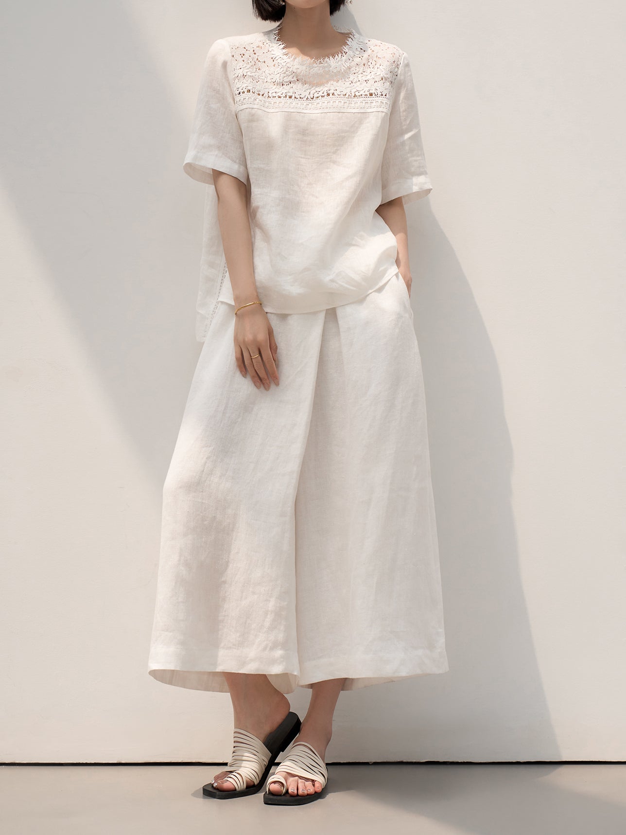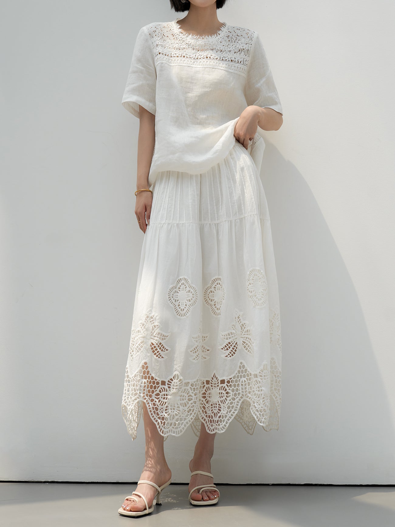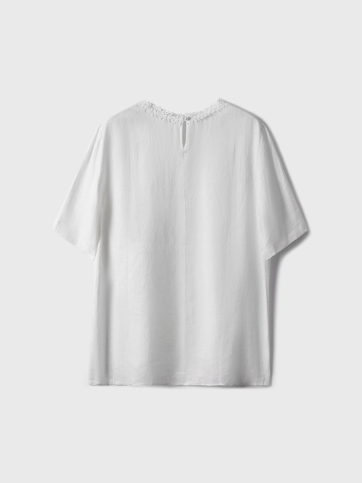 顔周のレースの切り替えのおかげで、定番の白トップスでも華やかな印象に。