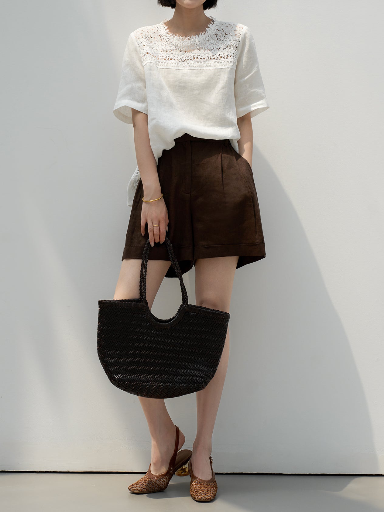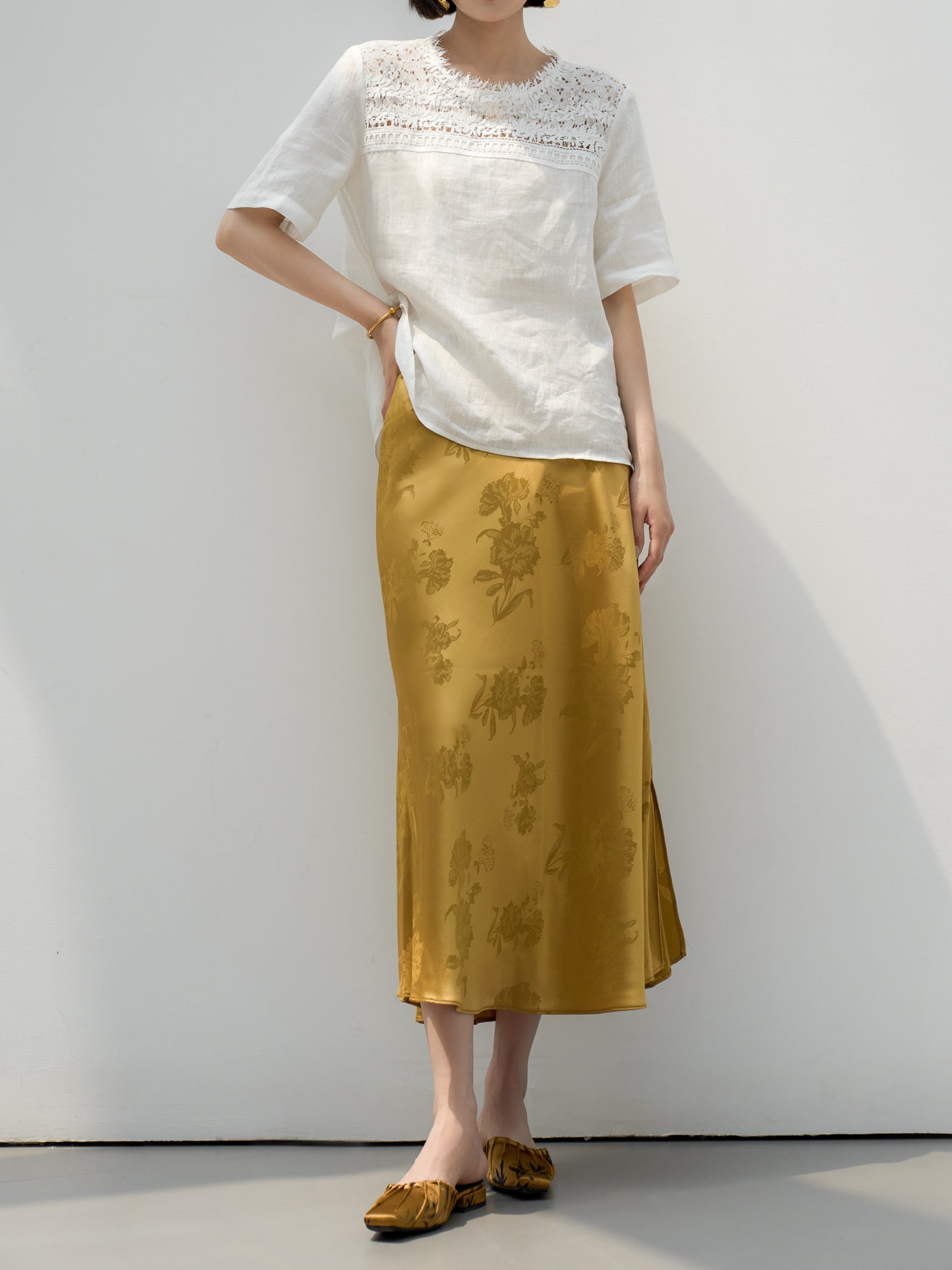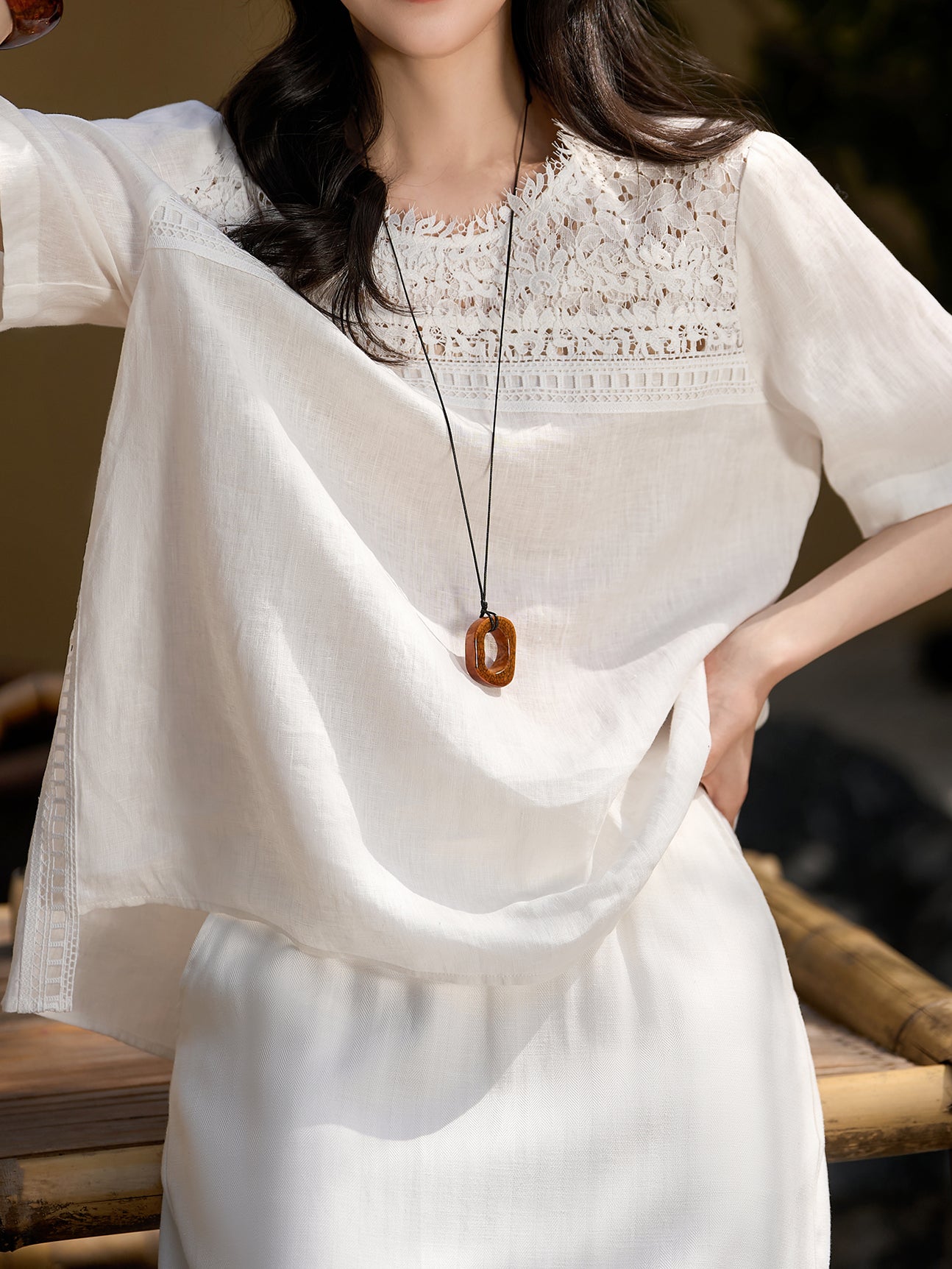 顔周のレースの切り替えのおかげで、定番の白トップスでも華やかな印象に。