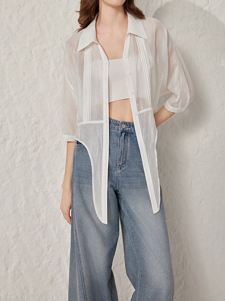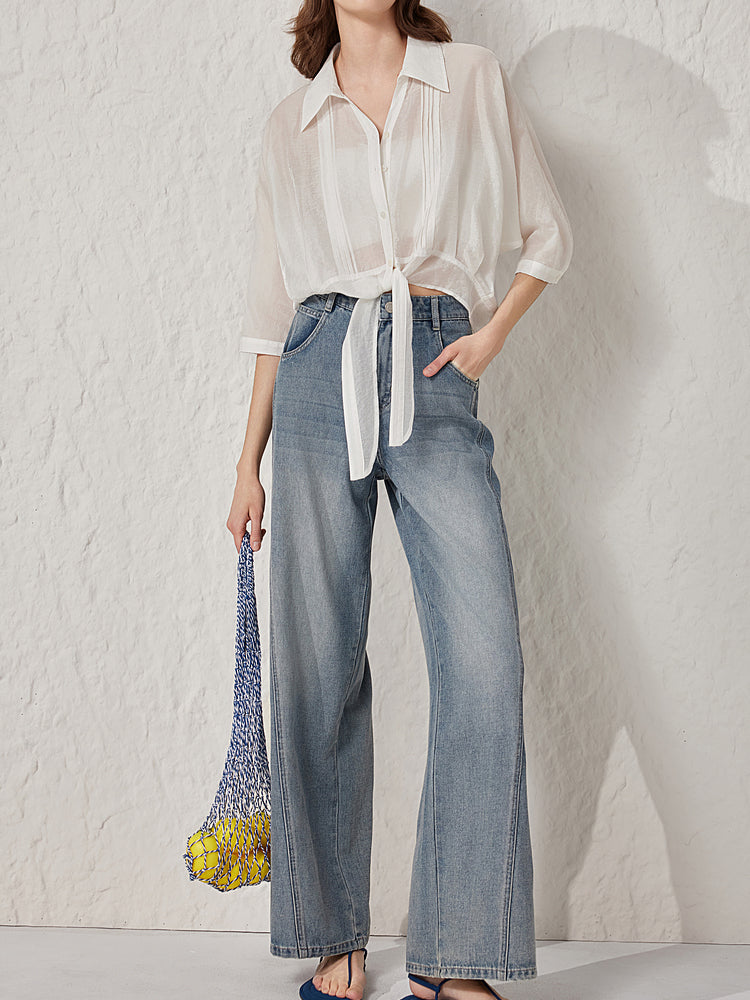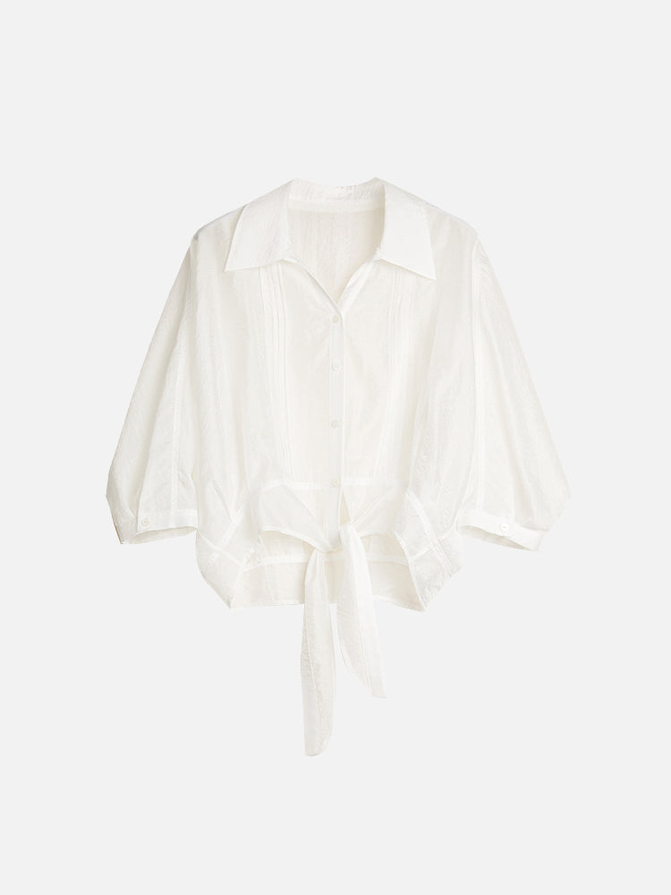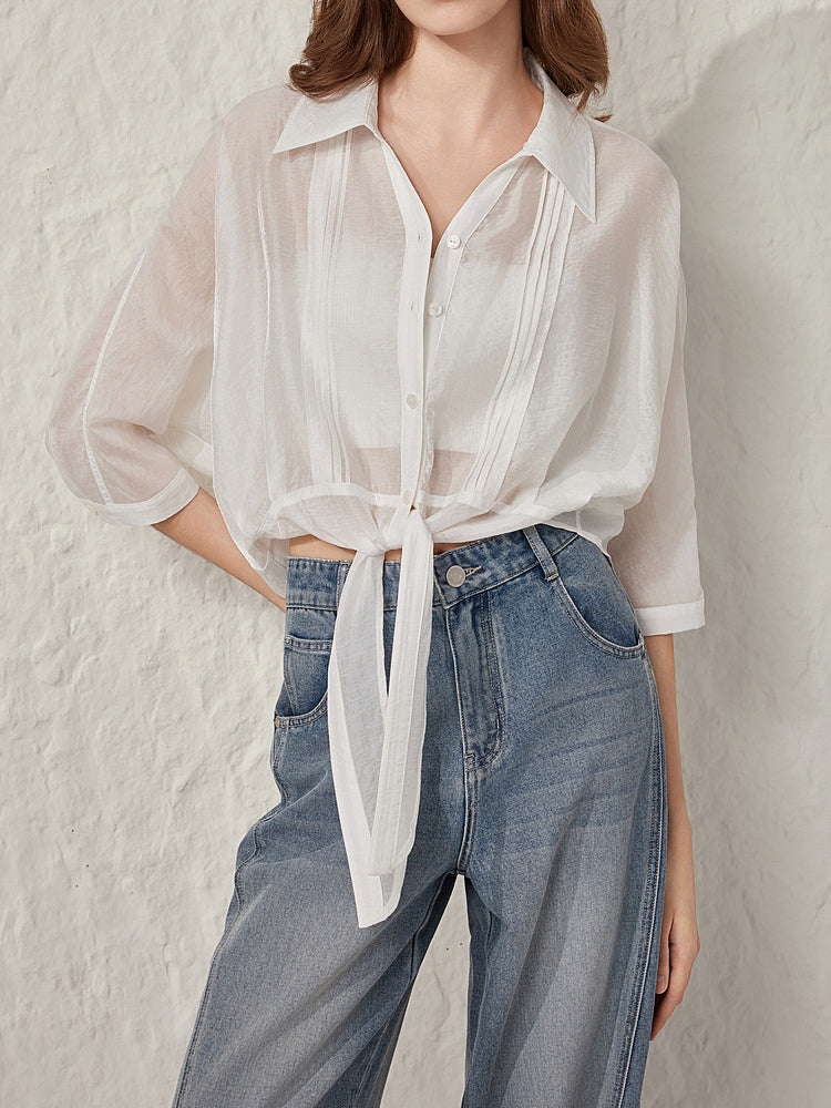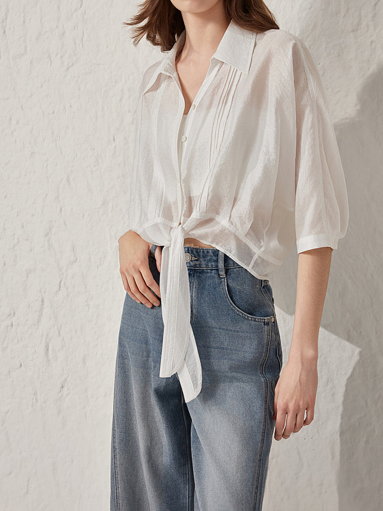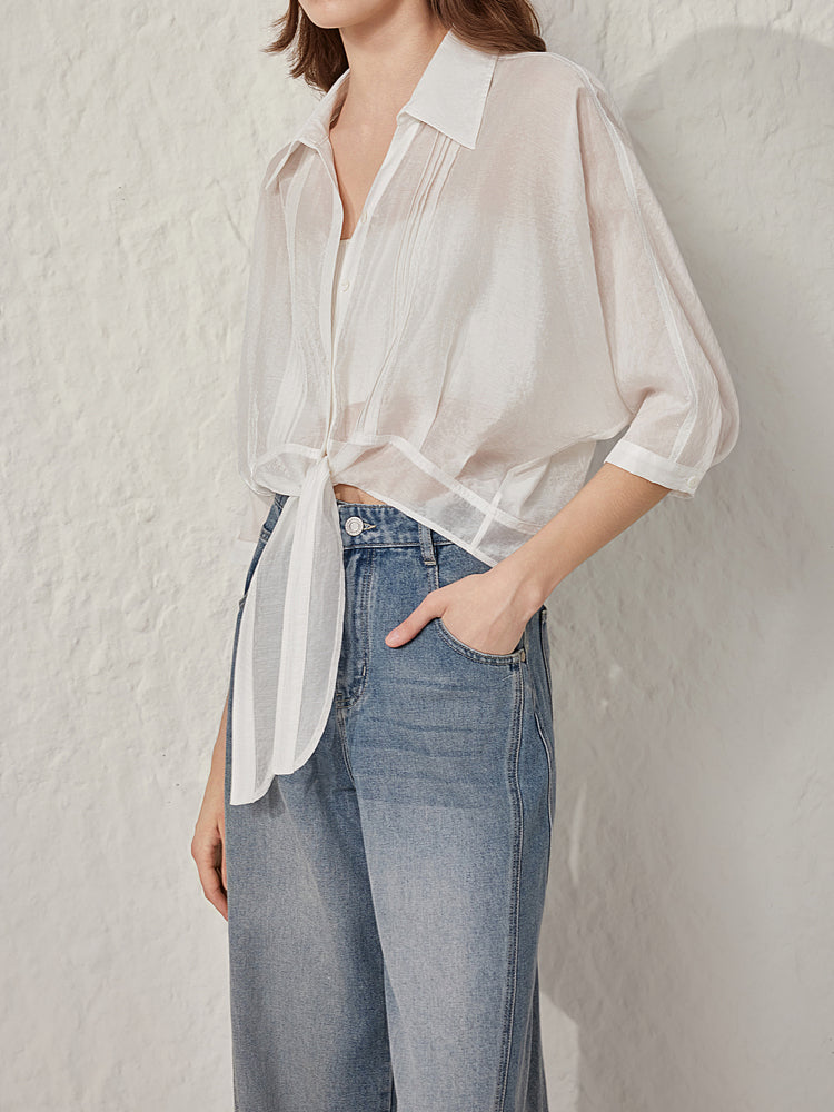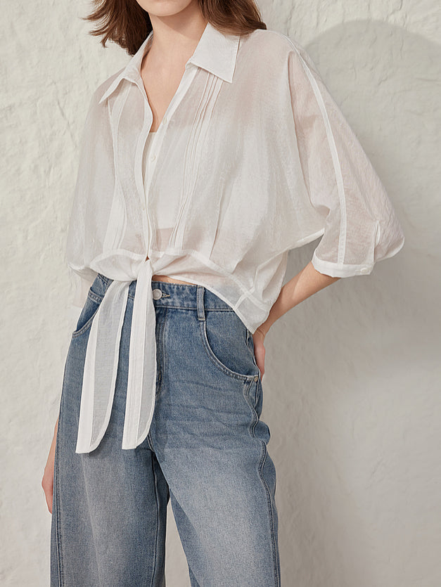 【フロントのタイディテールが目を引く、透け感のあるサマーシャツ】