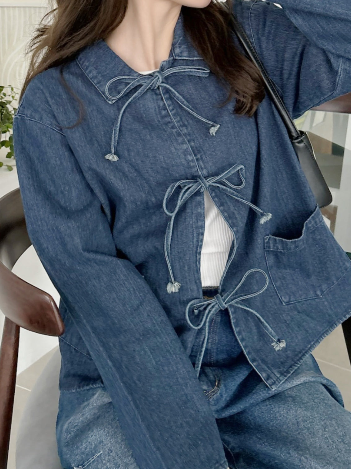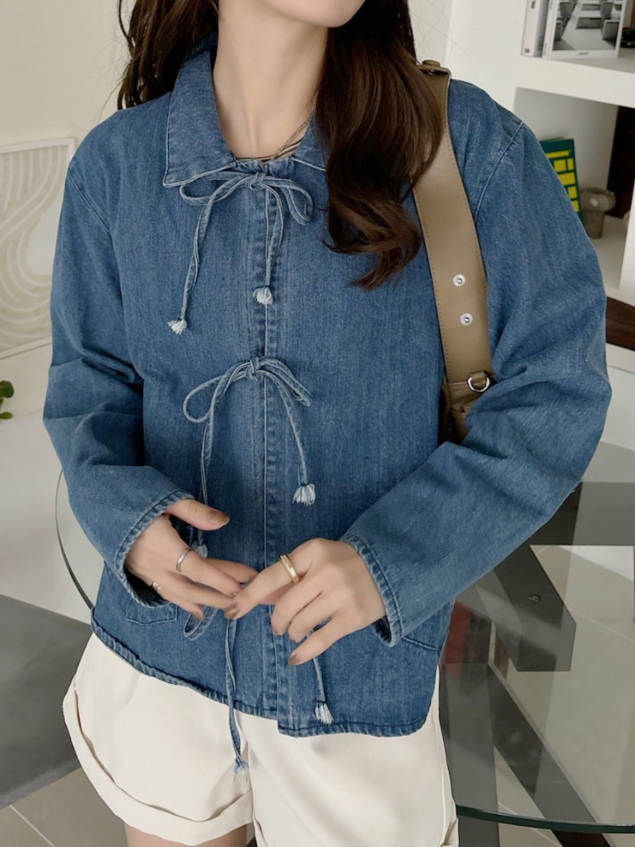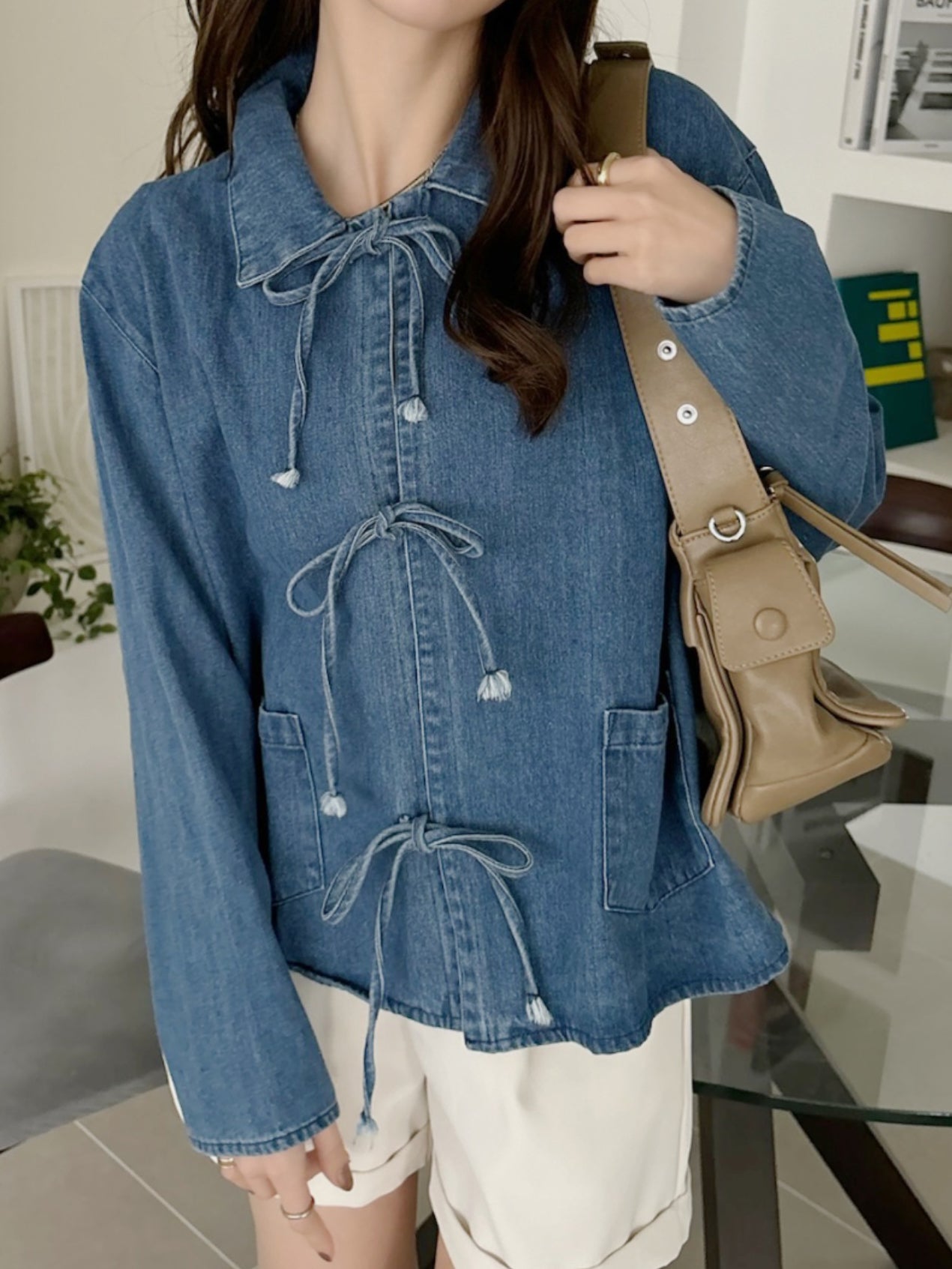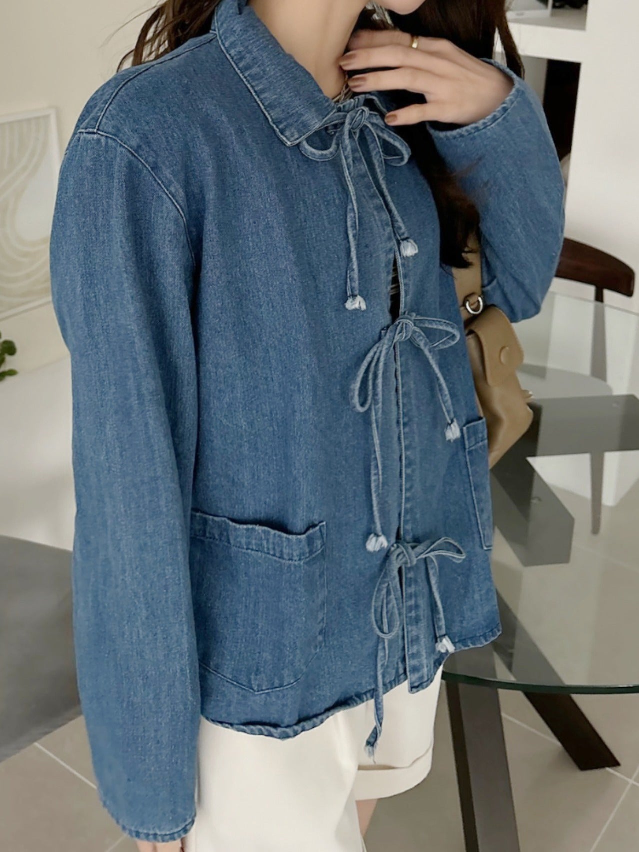 デニム生地に襟付きのデニムジャケットできっちり感もありつつ、フロントのリボンでラフさやキュートな印象もあるカジュアルアイテムが新登場。