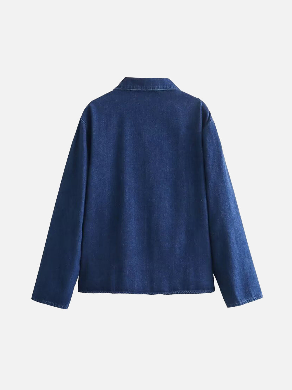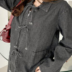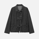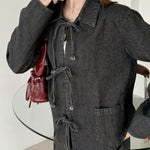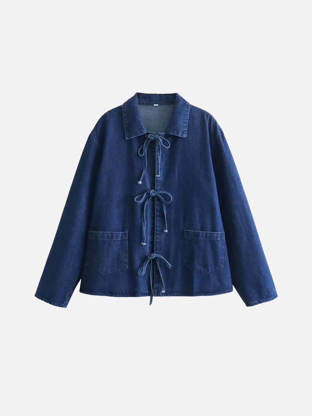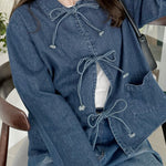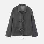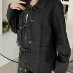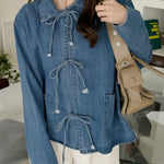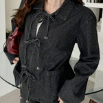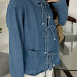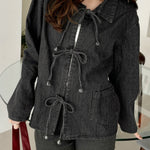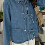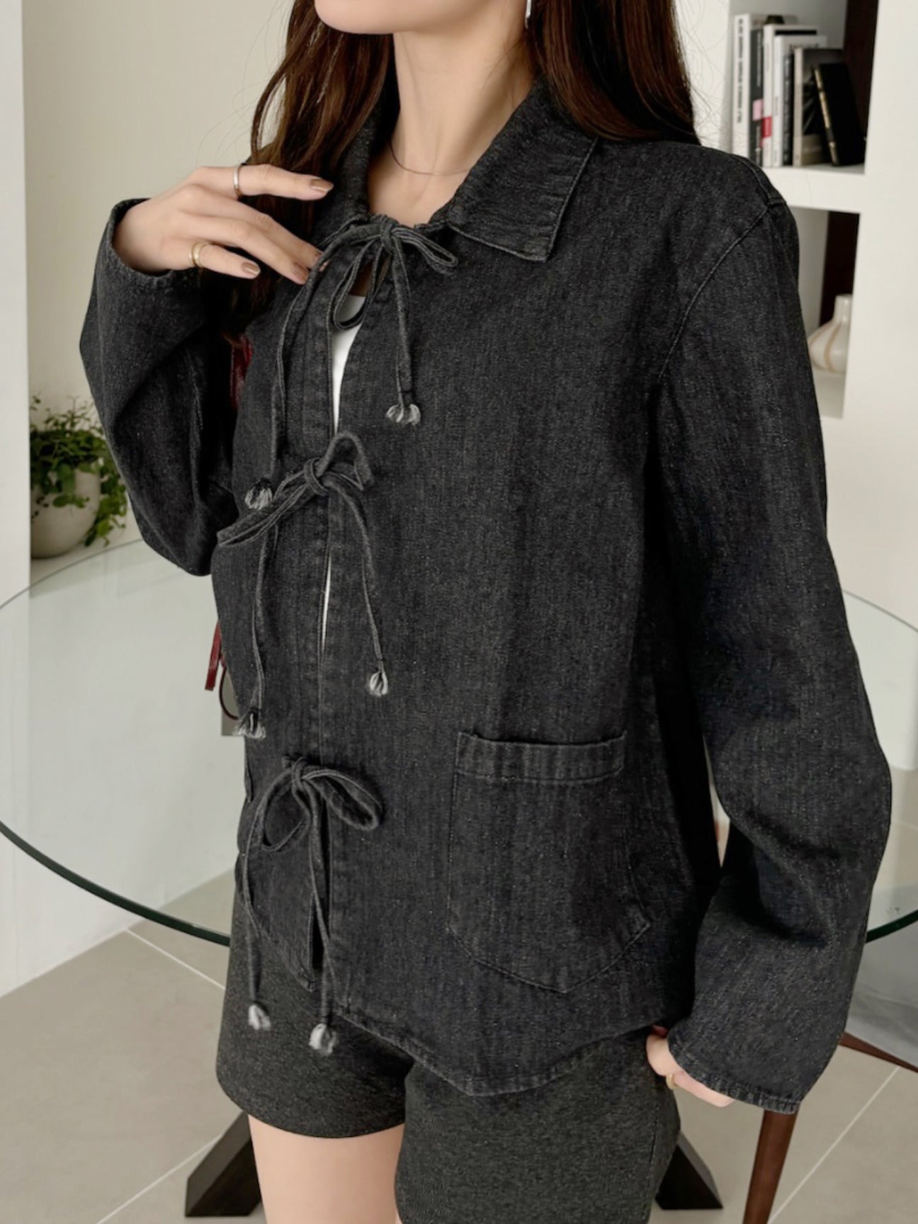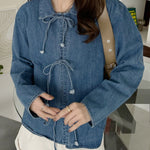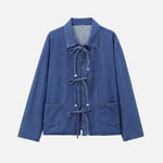 デニム生地に襟付きのデニムジャケットできっちり感もありつつ、フロントのリボンでラフさやキュートな印象もあるカジュアルアイテムが新登場。