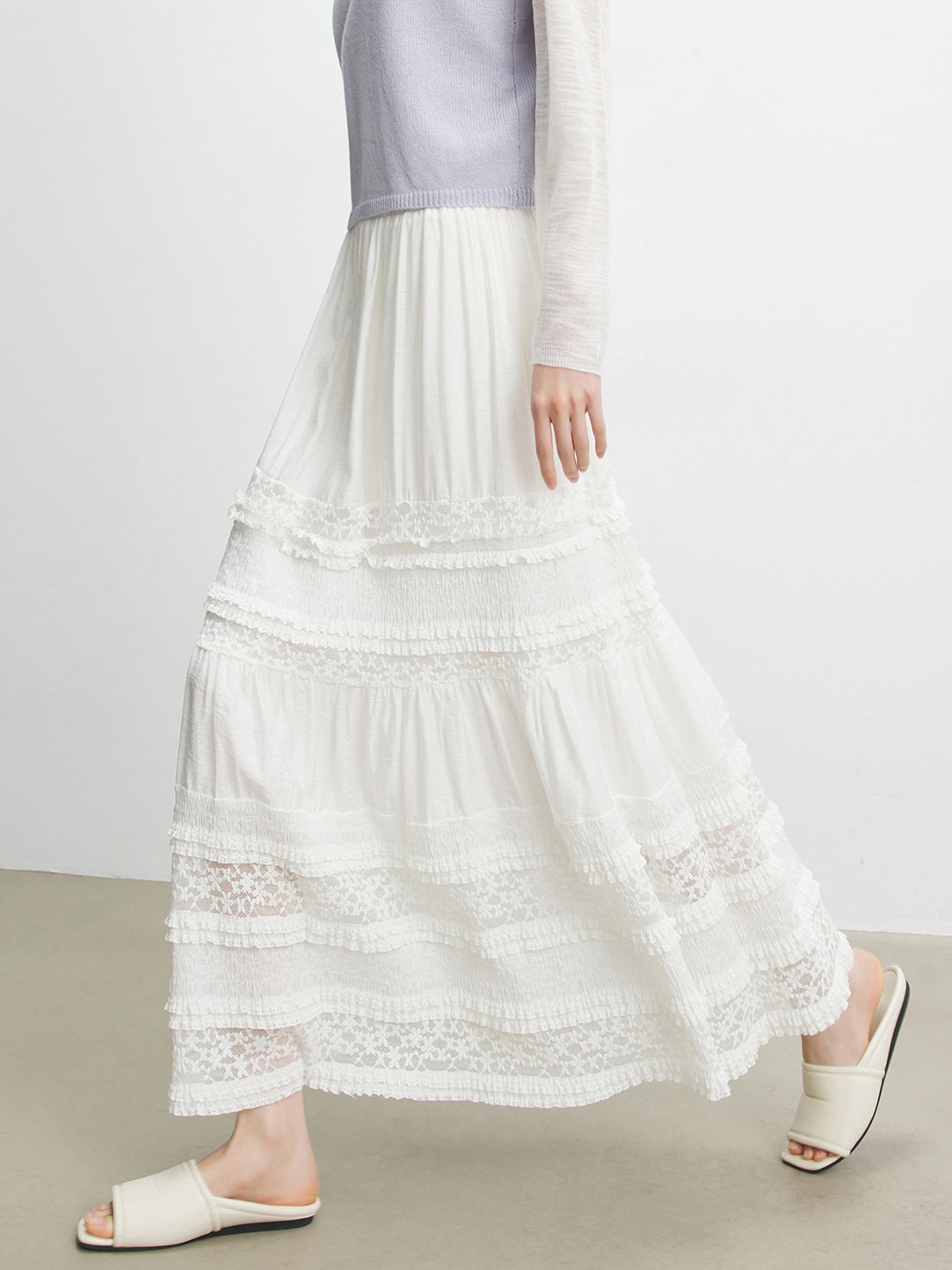 上品な透け感のあるフラワーレースを使用した、ロング丈のスカート。