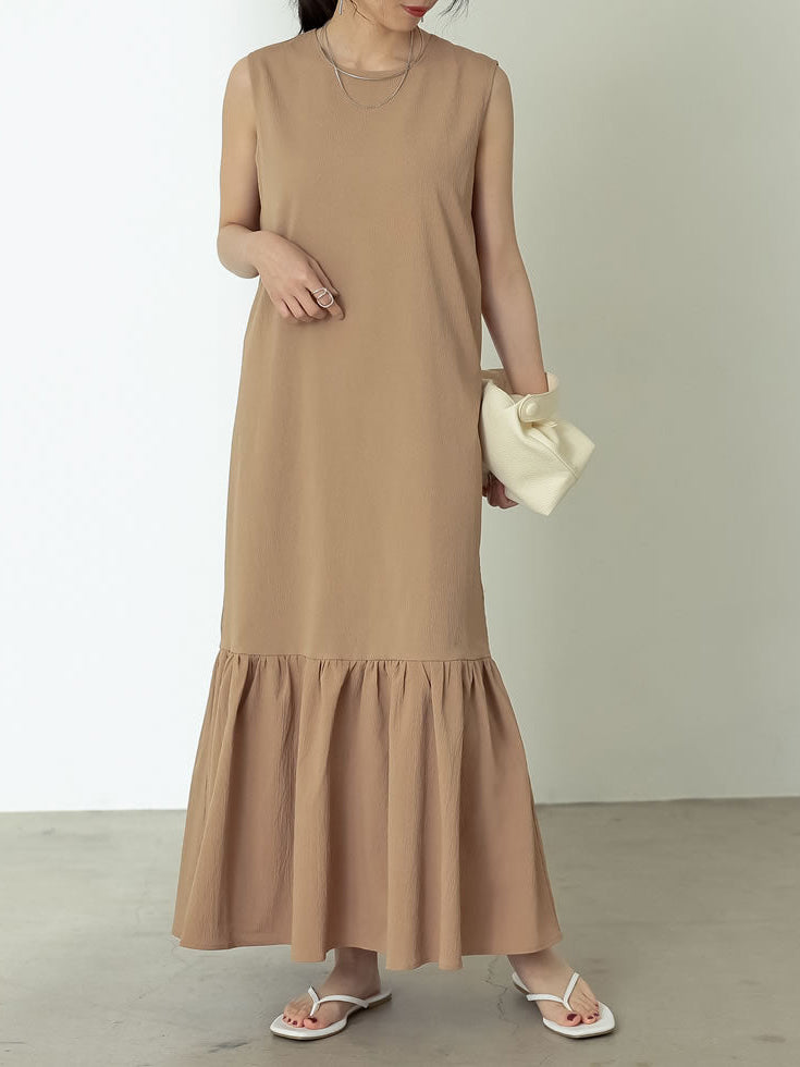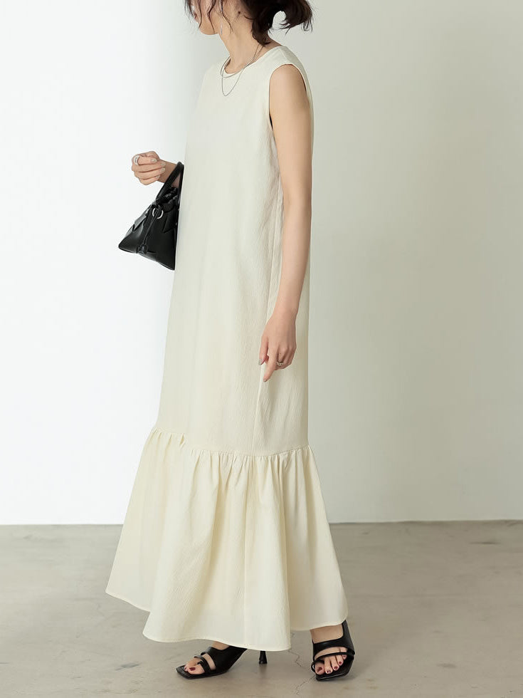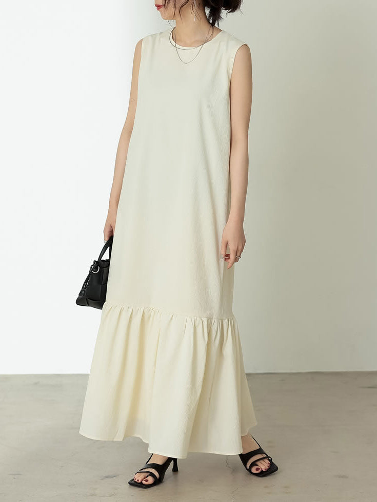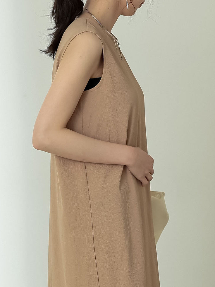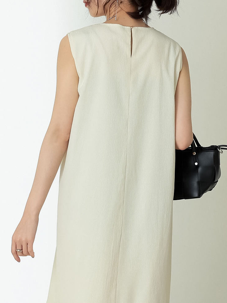 表面変化のある楊柳ライクなクレープ生地で仕上げたノースリーブワンピース。