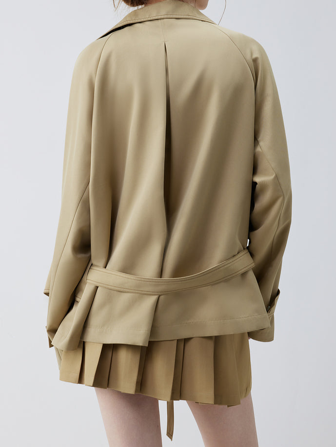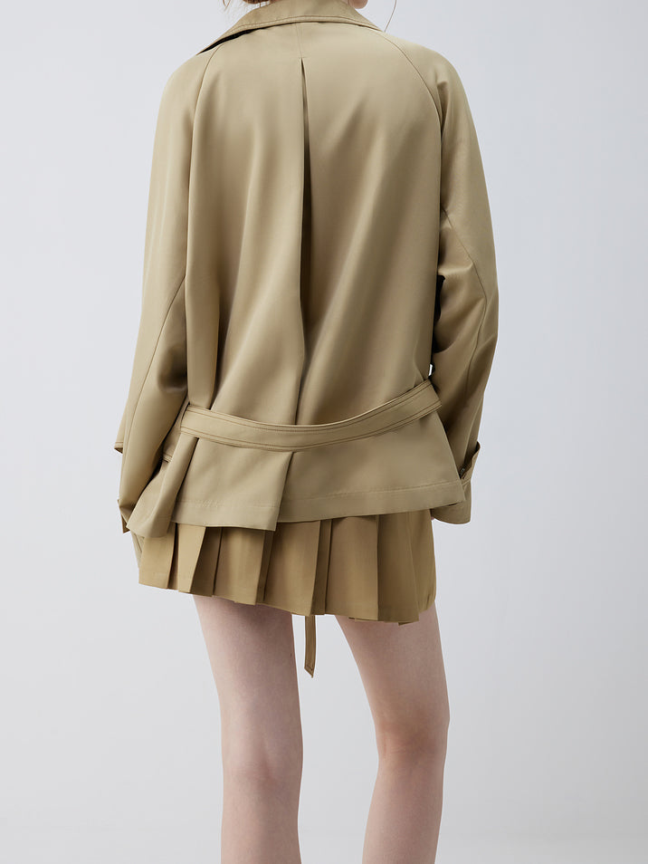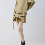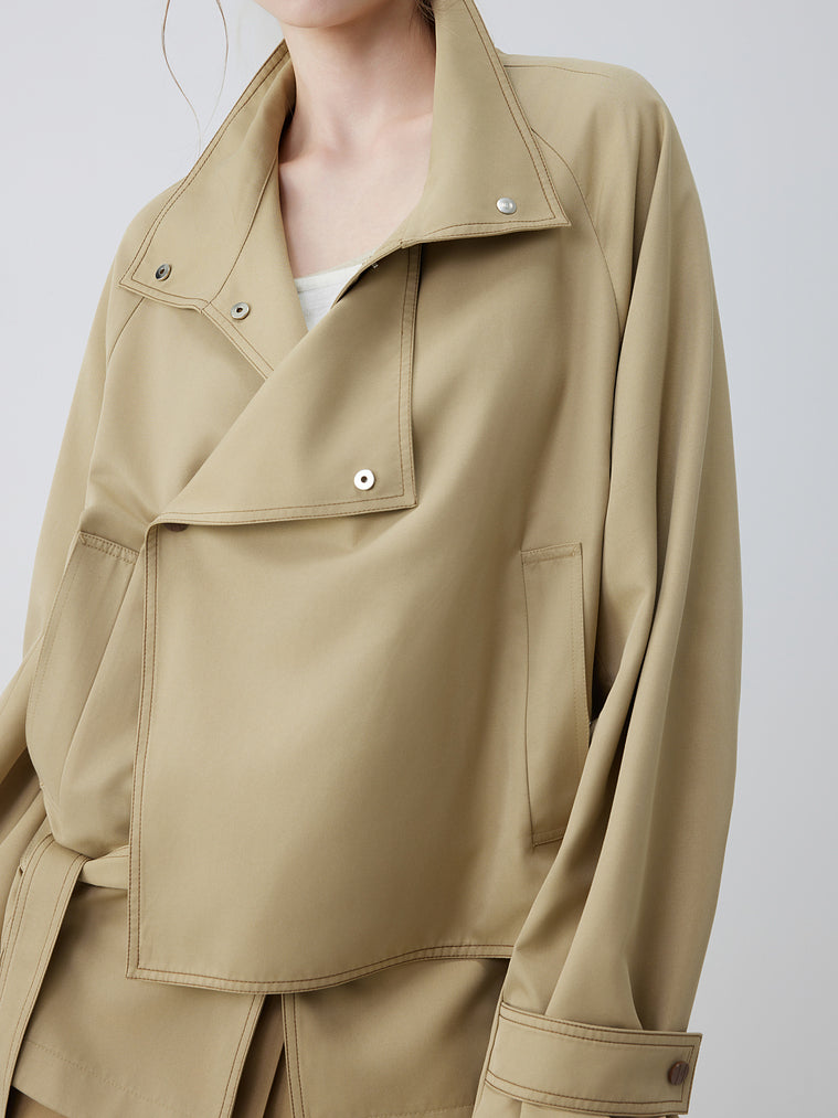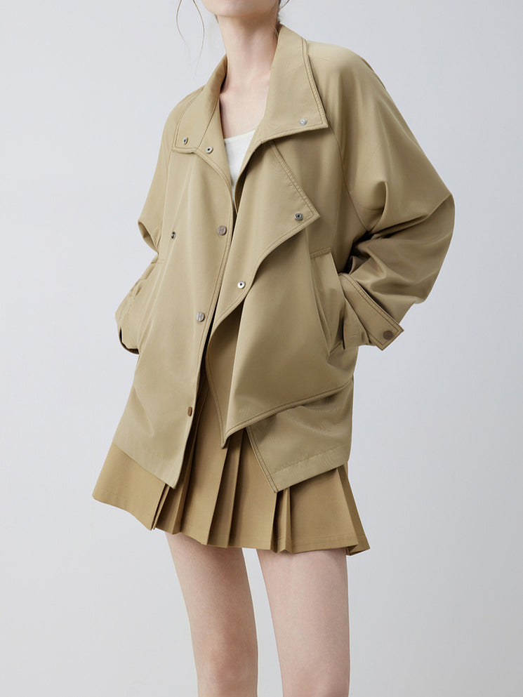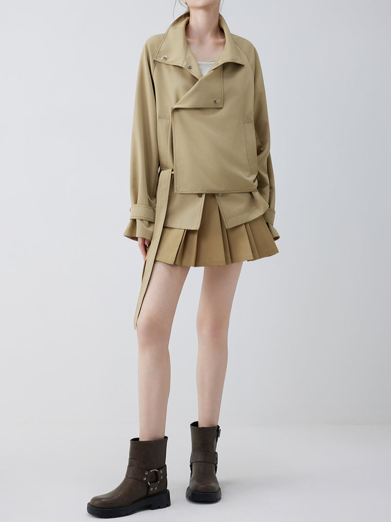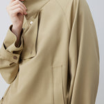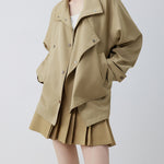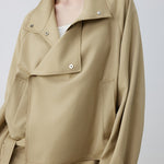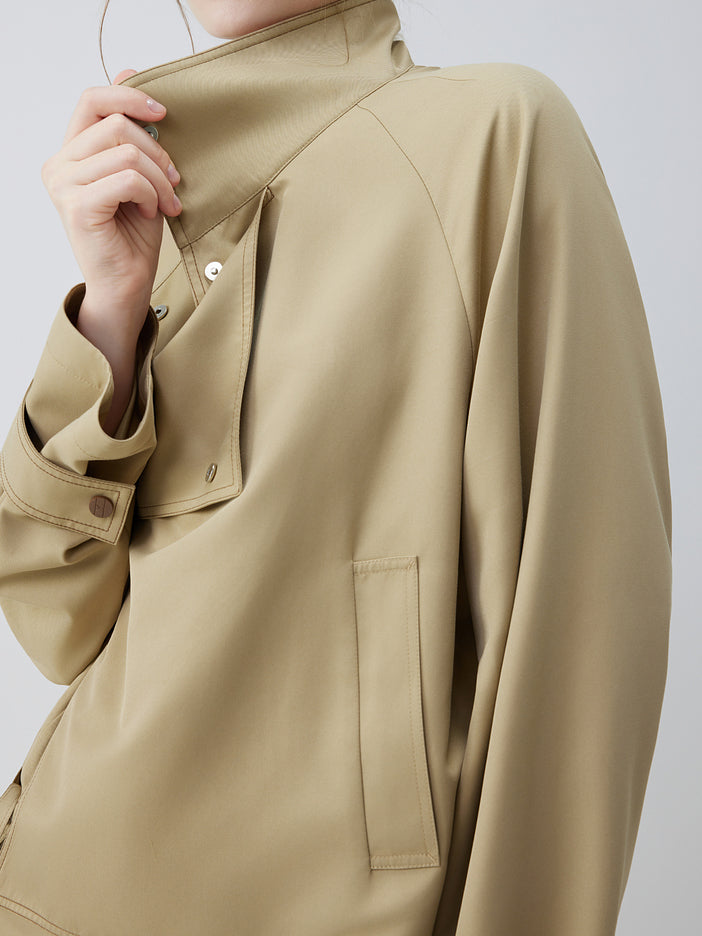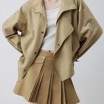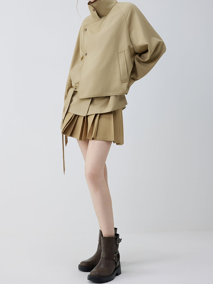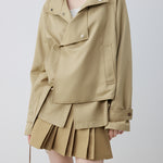 スタンドカラーや斜めボタンなど、ライダースらしいディテールを備えつつ、クロップド丈とセミフィットのシルエットで女性らしさも演出。