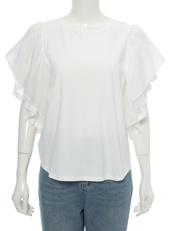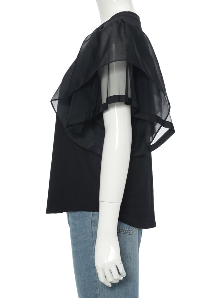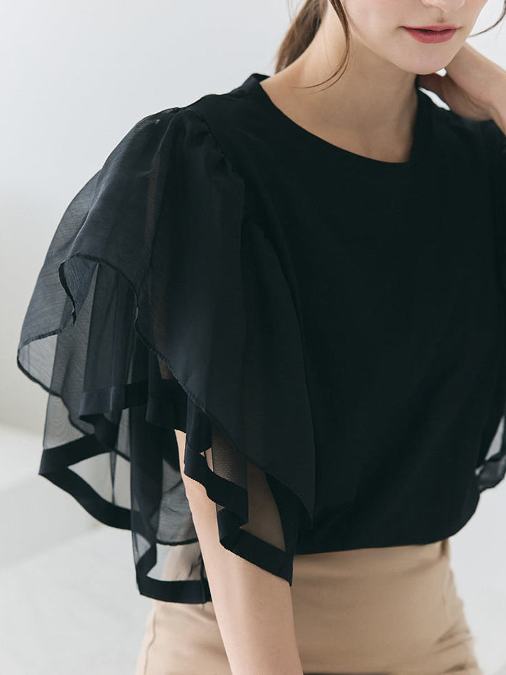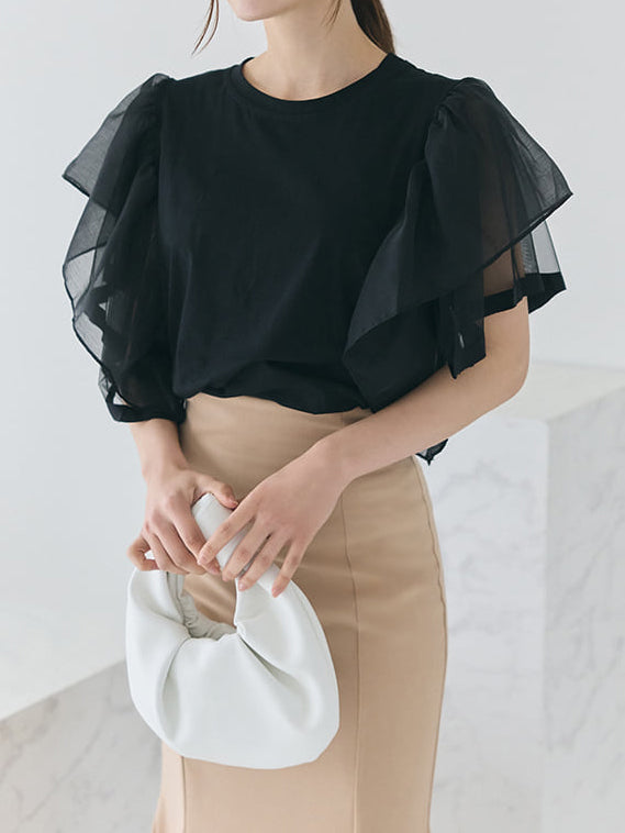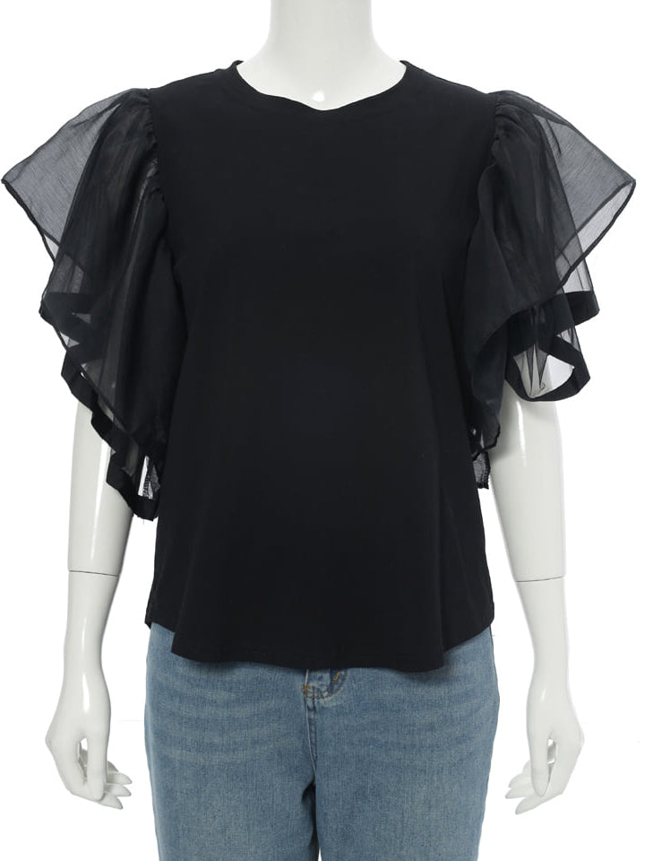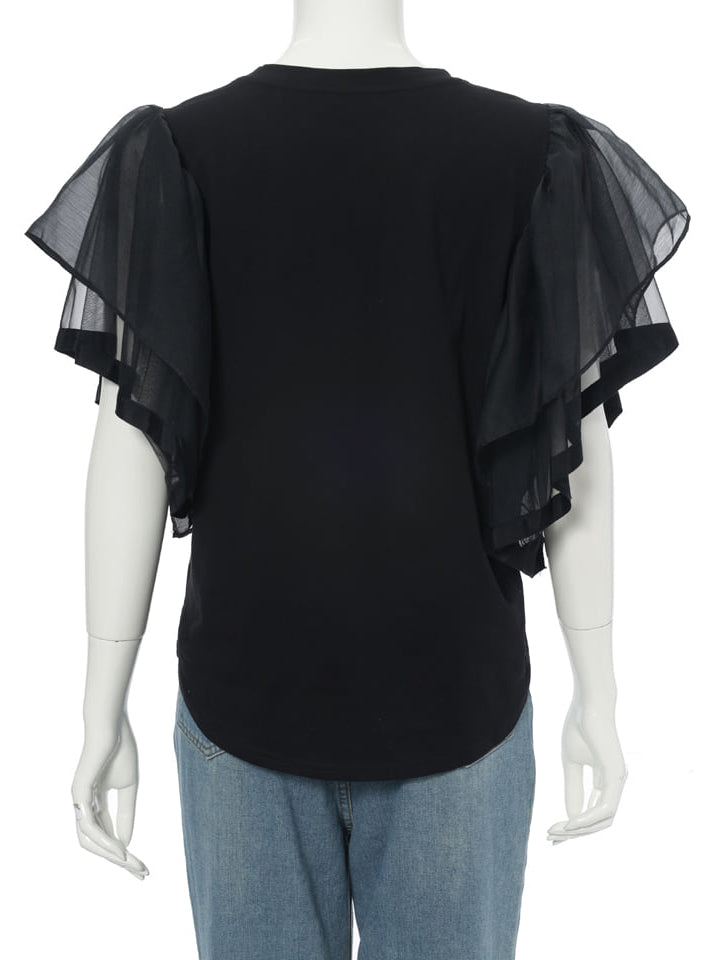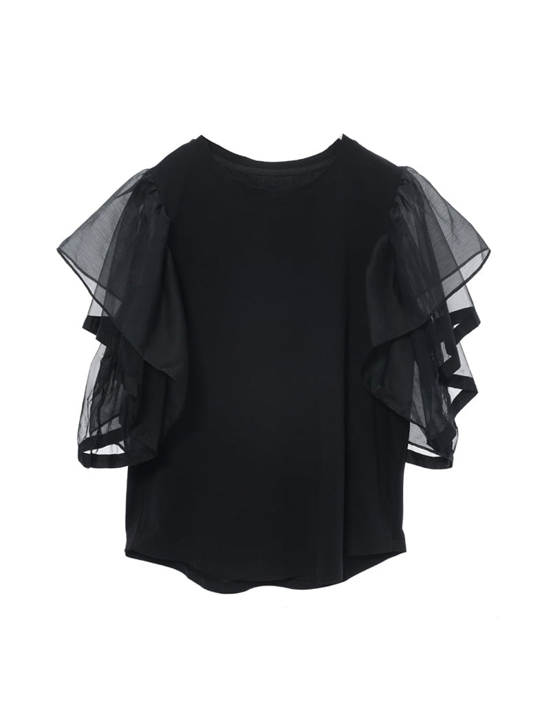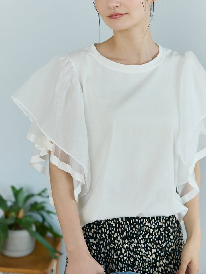 透け感のあるオーガンジーのフリル袖が女性らしい印象のトップス。