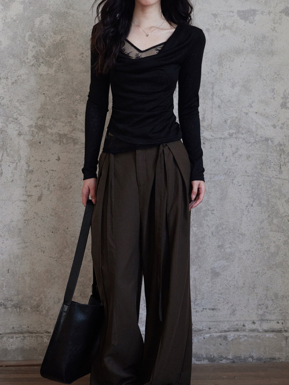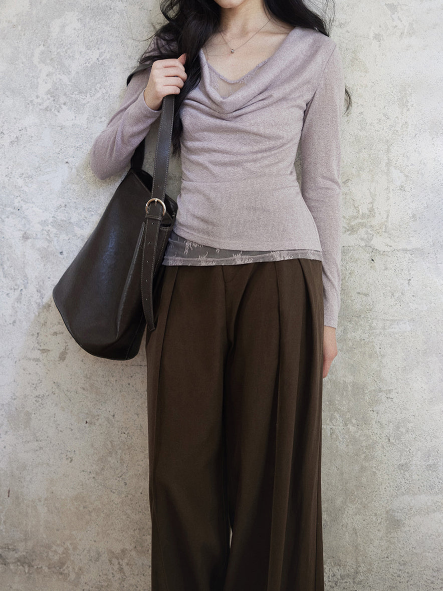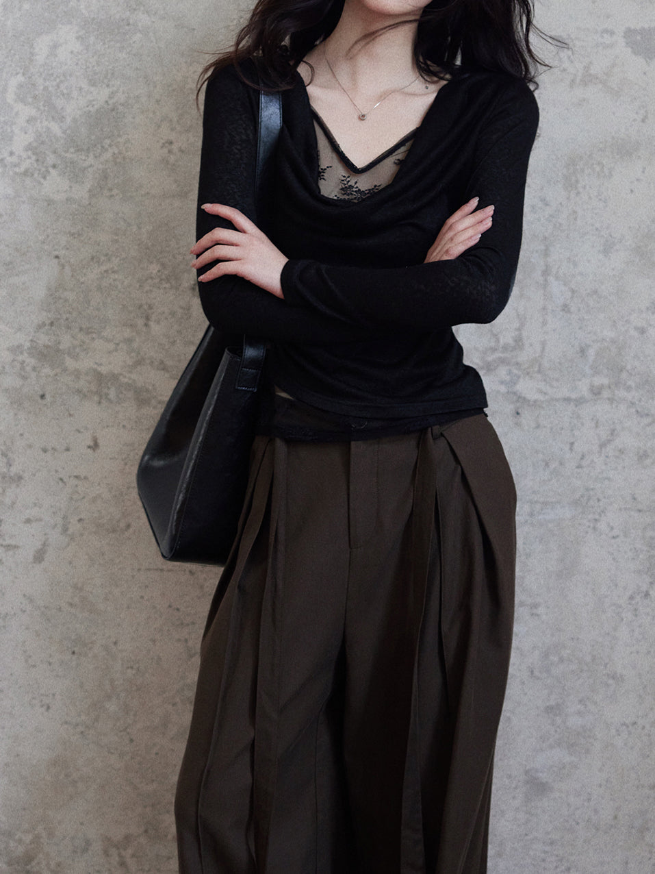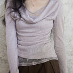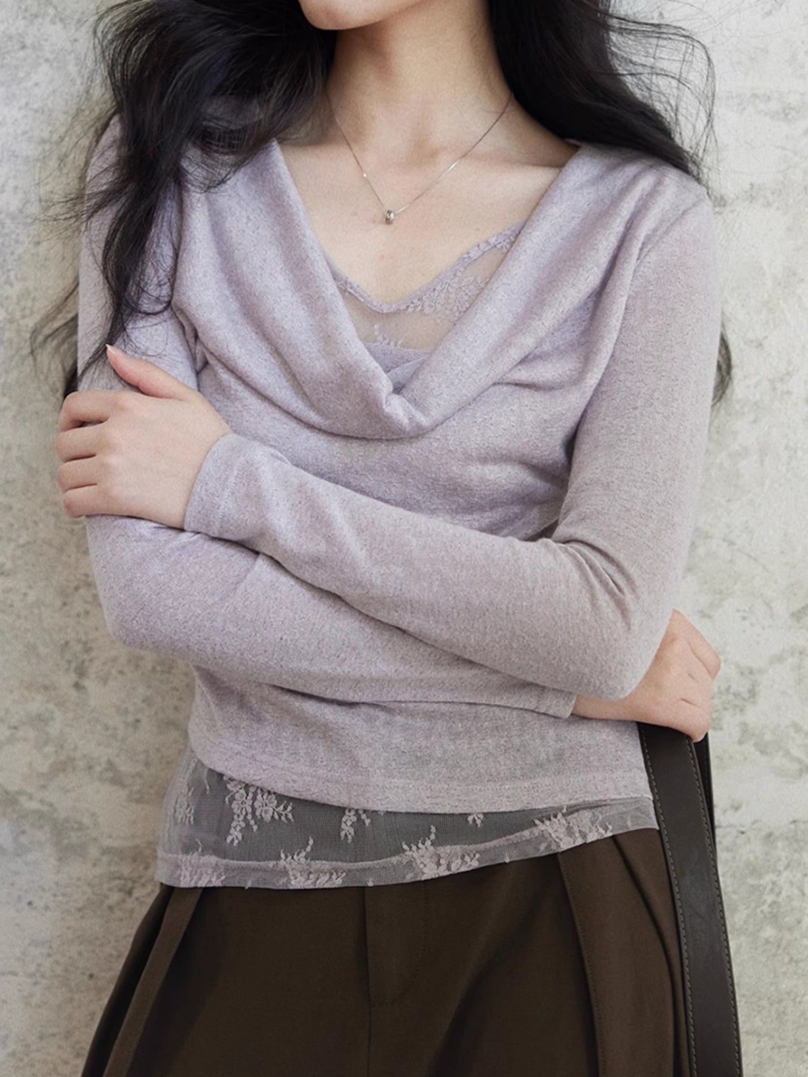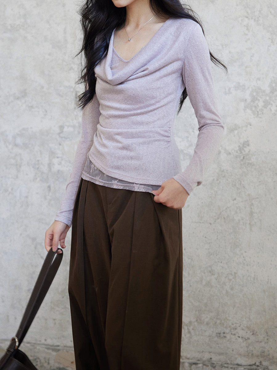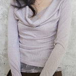 優雅なドレープドネックがエレガントなアクセントを添えるニットトップス。