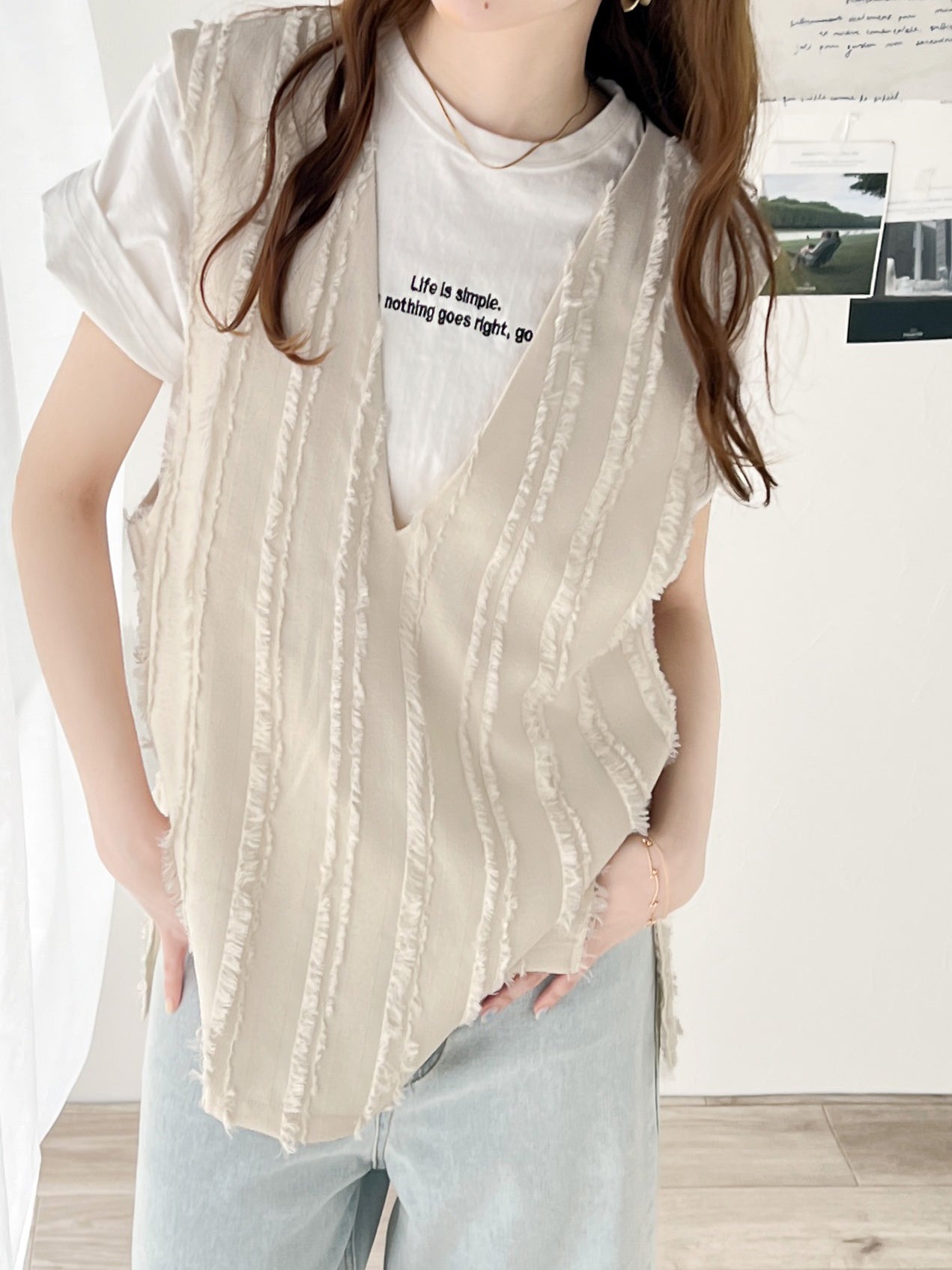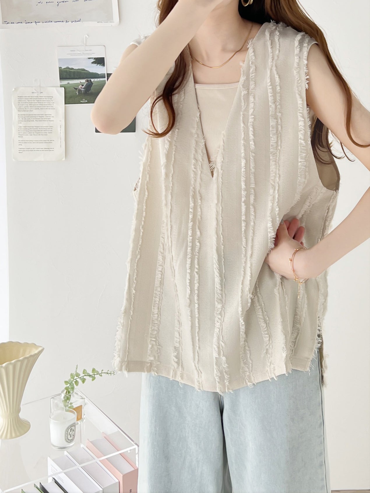 前後2wayカットジャガードフリンジ深Vベスト 2色入