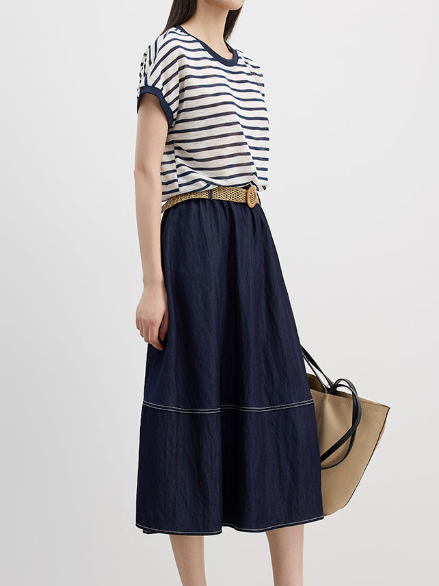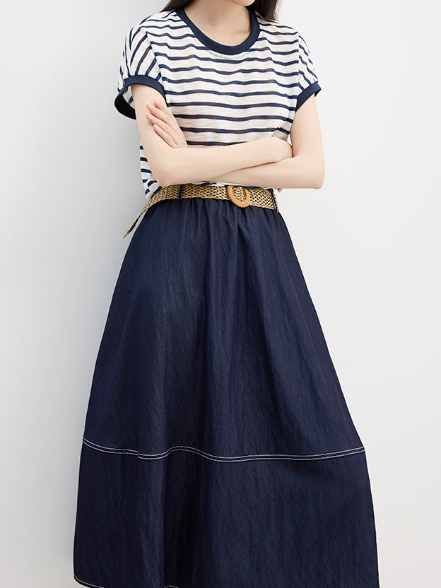 薄手ボーダーニット+ボヘミアンベルト付ステッチテンセルデニムスカートSET
