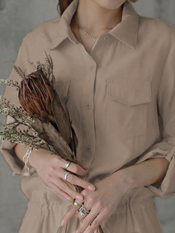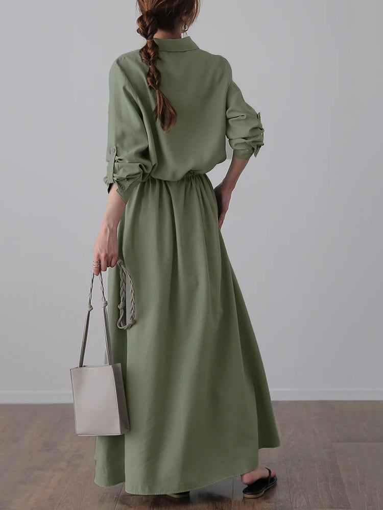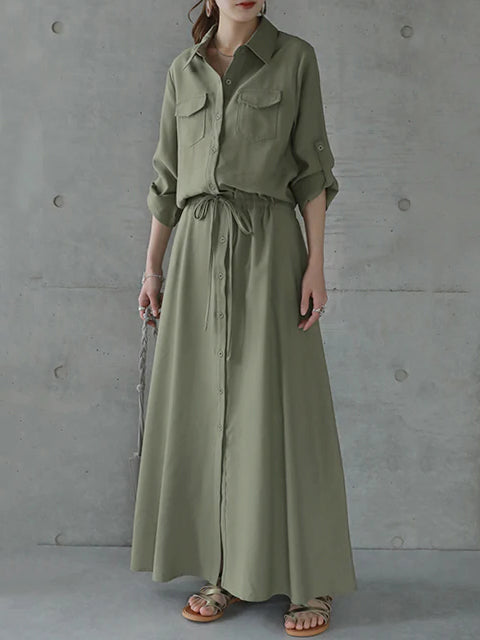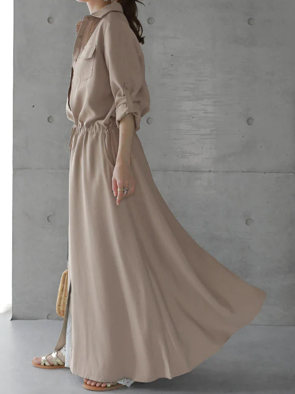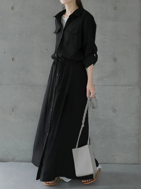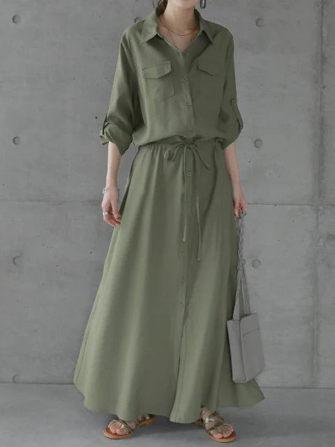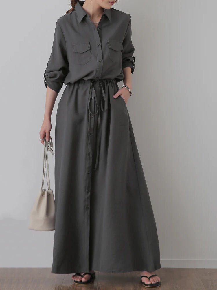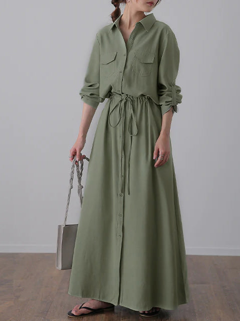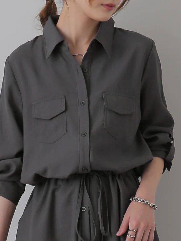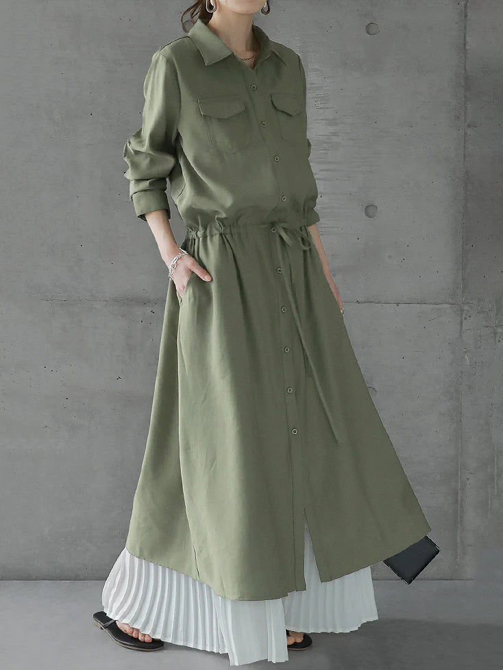 胸もとにフラップポケットをあしらったサファリテイストのロングシャツワンピース。