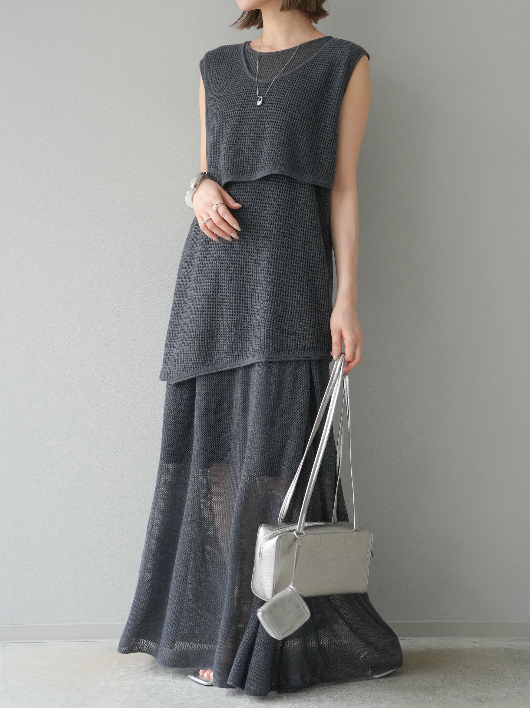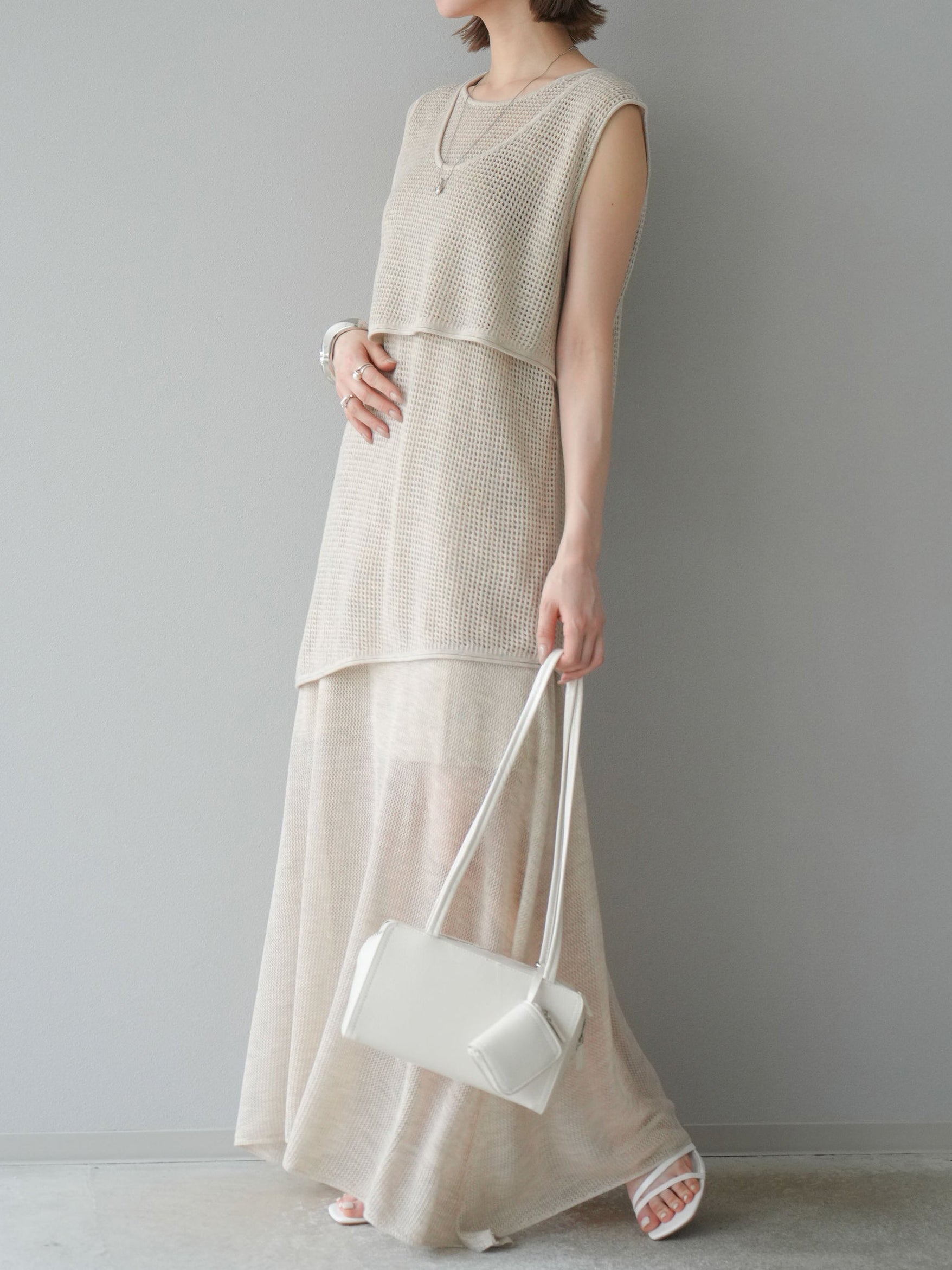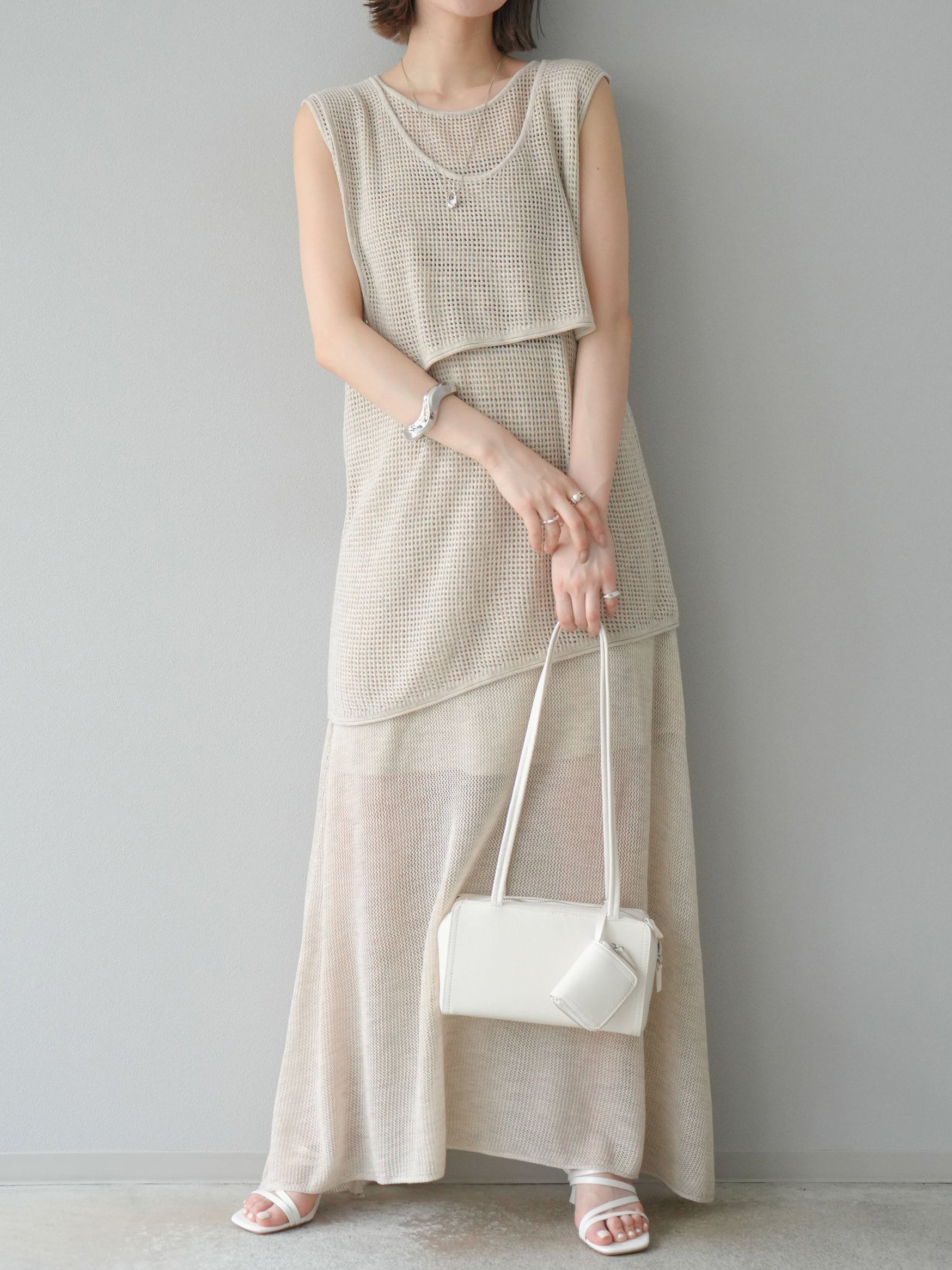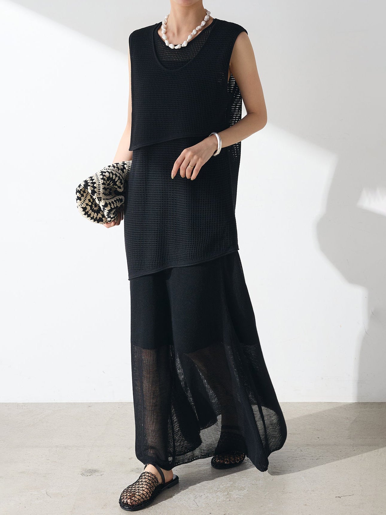 メッシュ編みザインが特徴的な、軽やかな素材感でロングシーズン活躍します。
