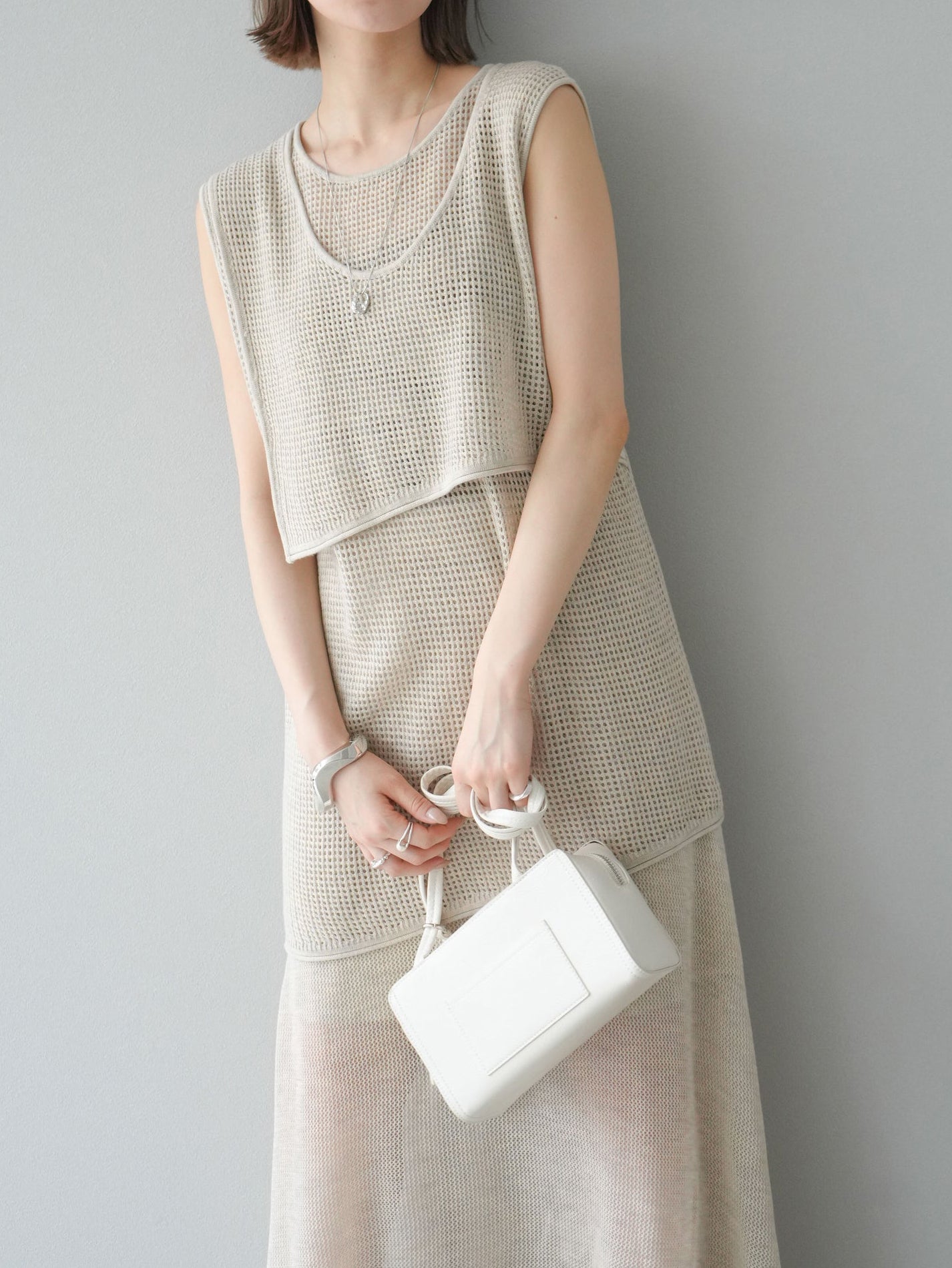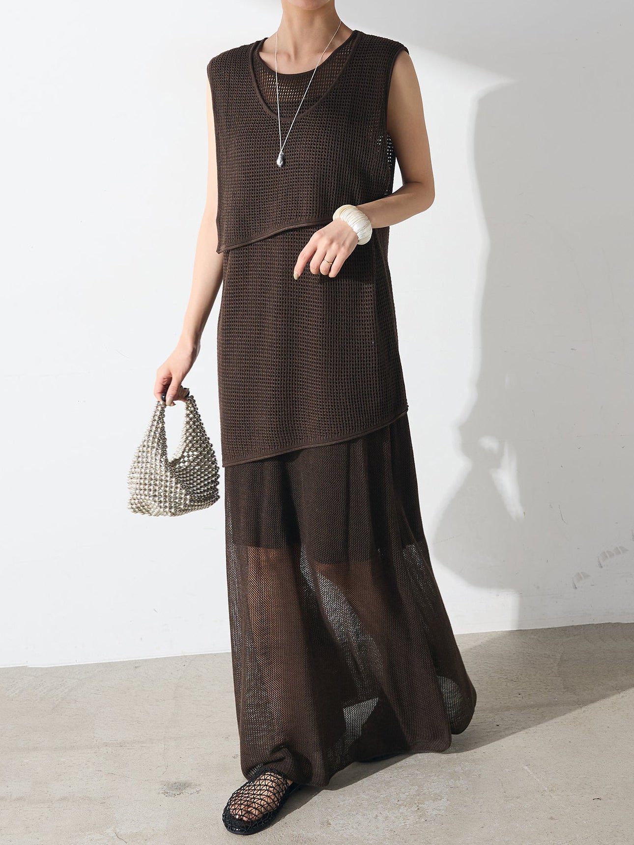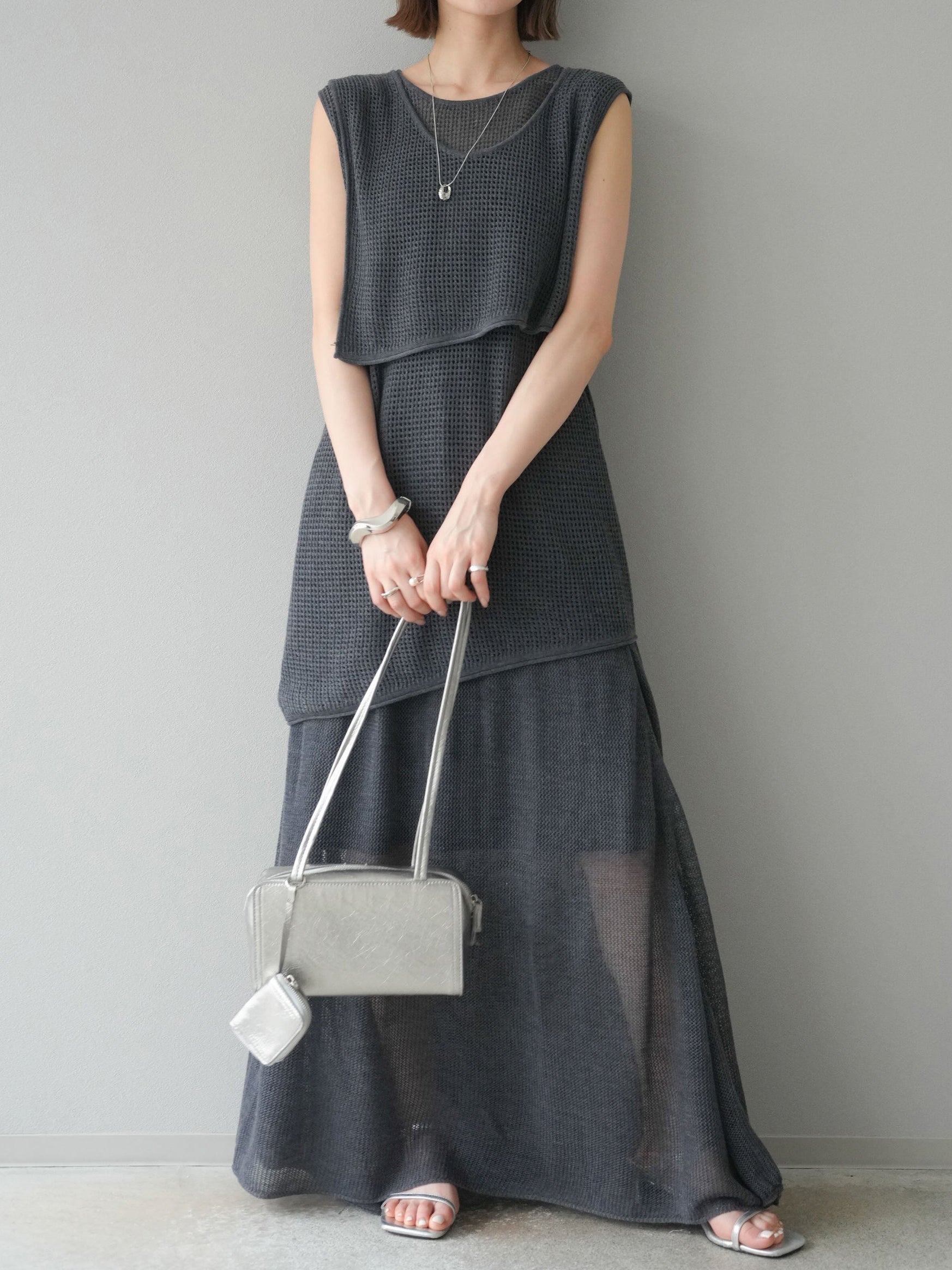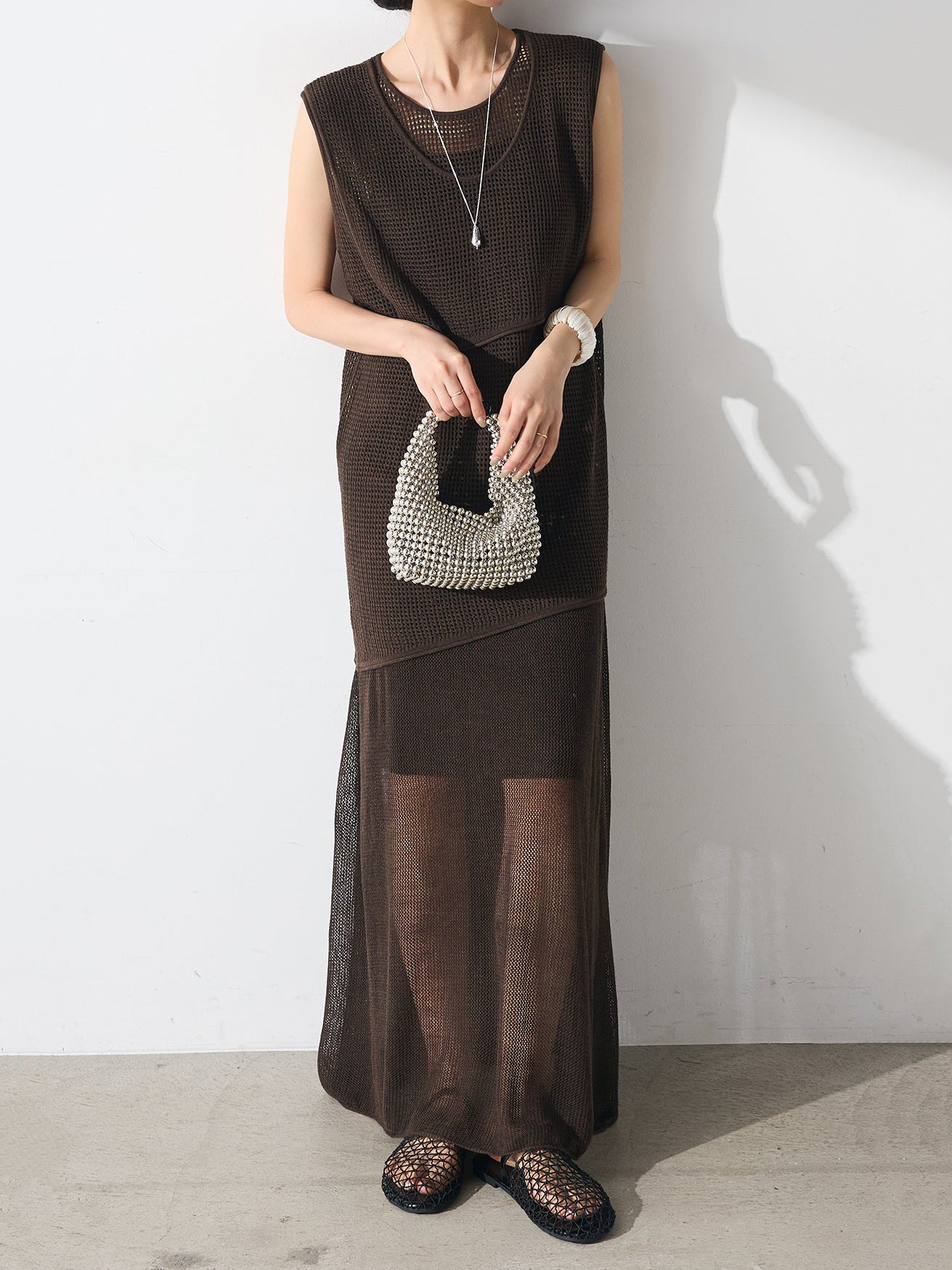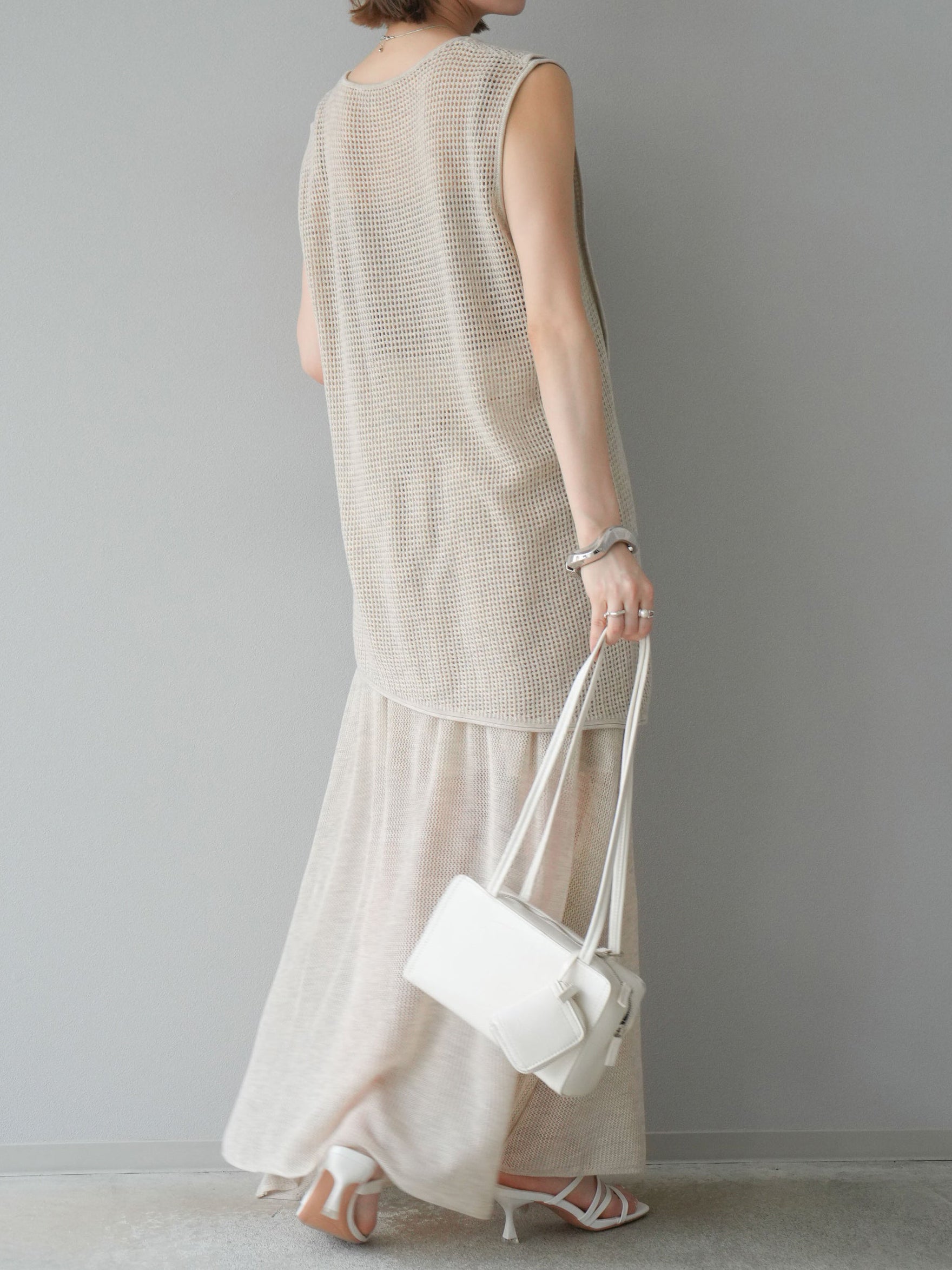 メッシュ編みザインが特徴的な、軽やかな素材感でロングシーズン活躍します。