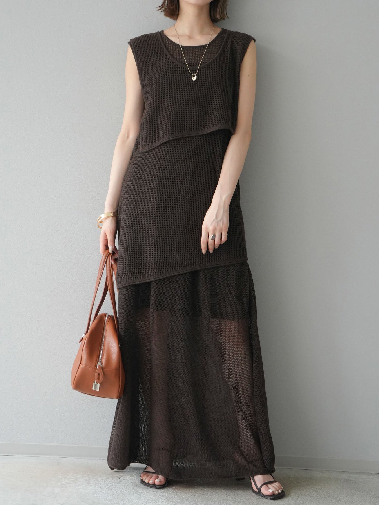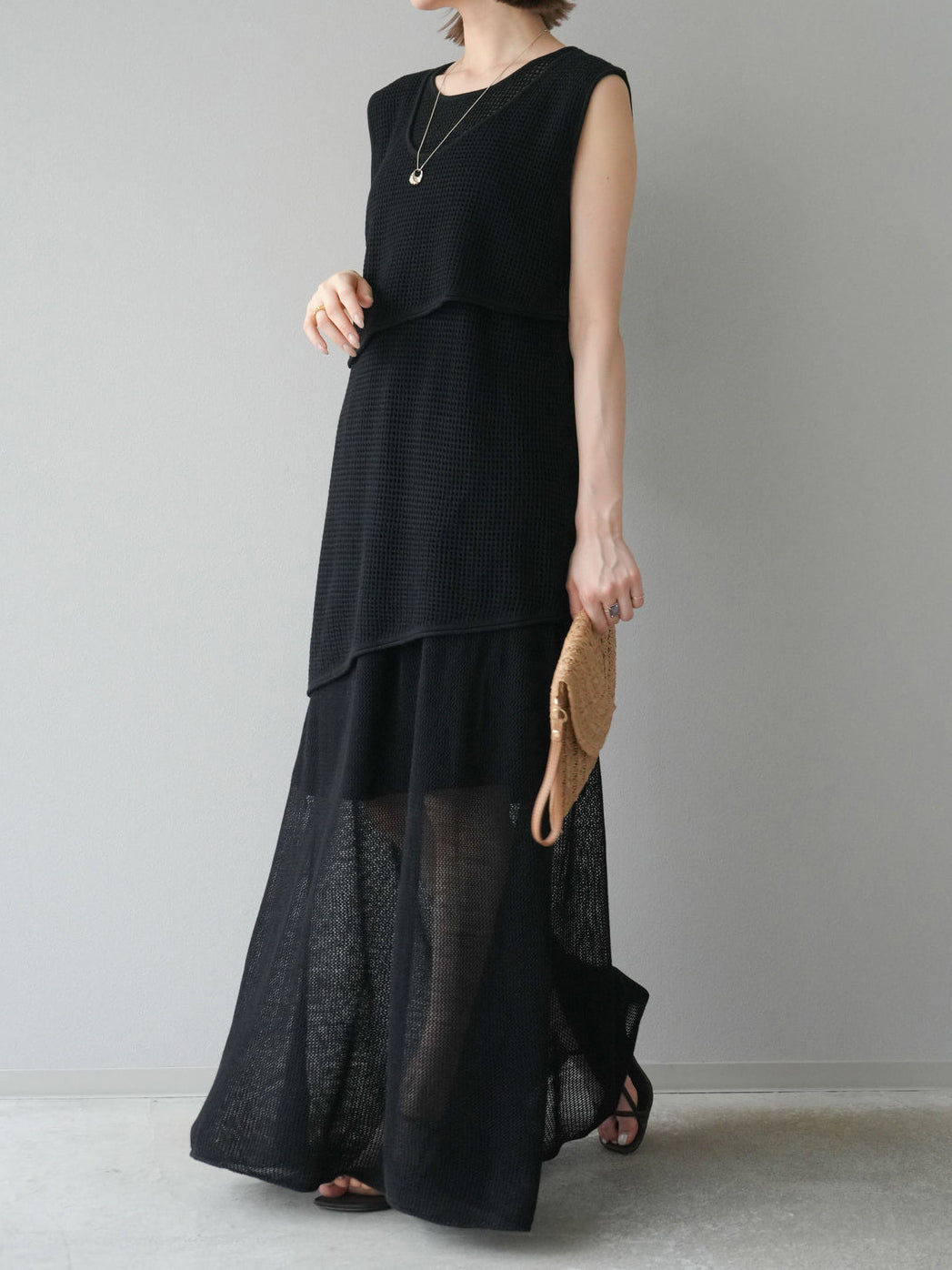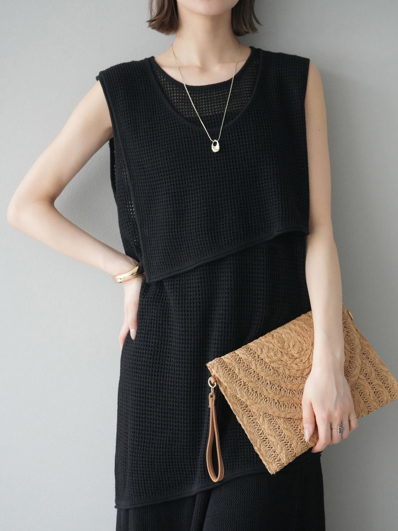 ☆透け感を活かしたレイヤードデザインで、スタイリングに奥行きをプラス。