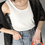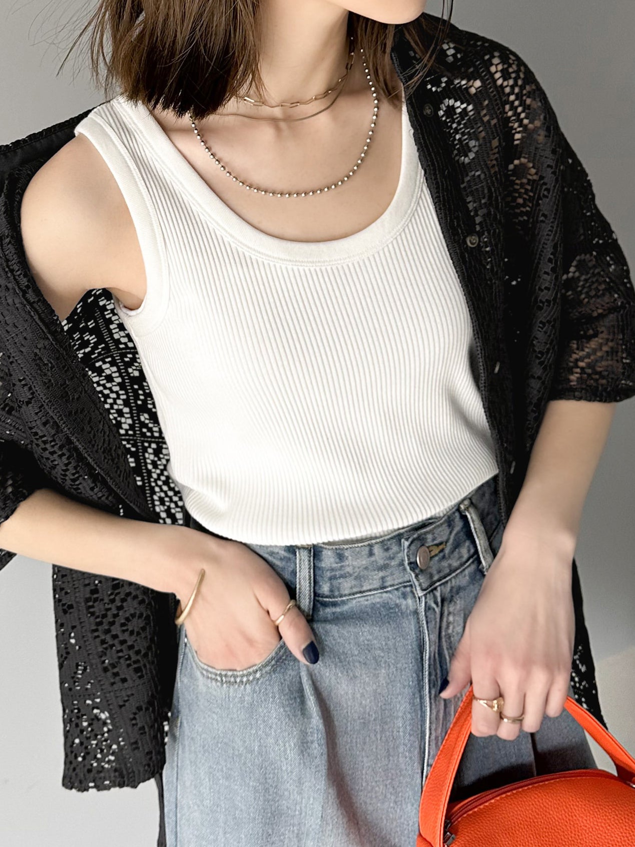 ☆インパクトなクロシェ編みでシンプルコーデを華やかな印象に。