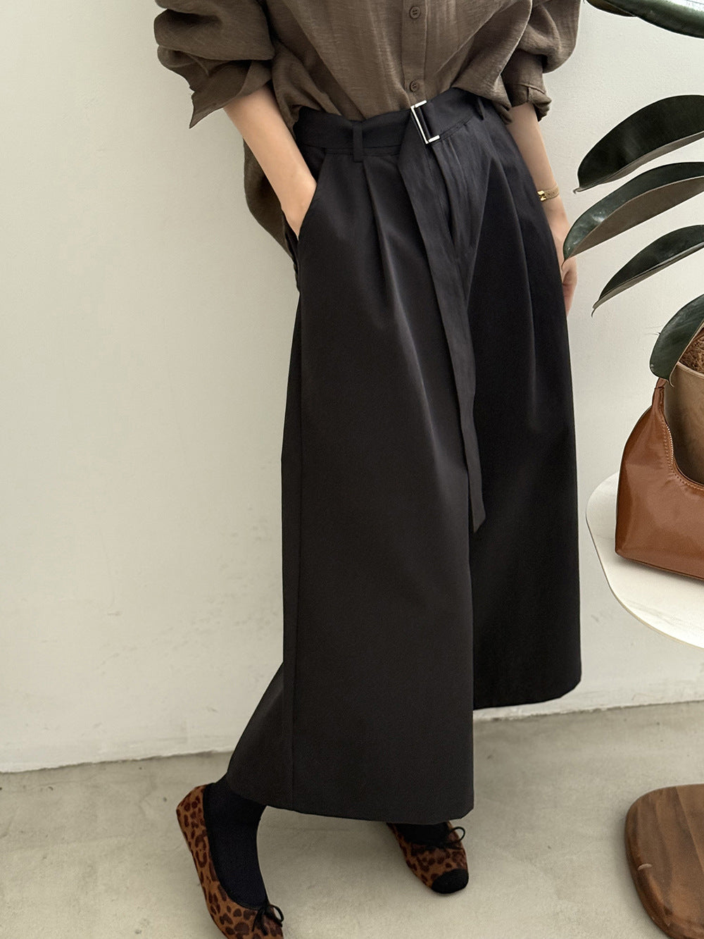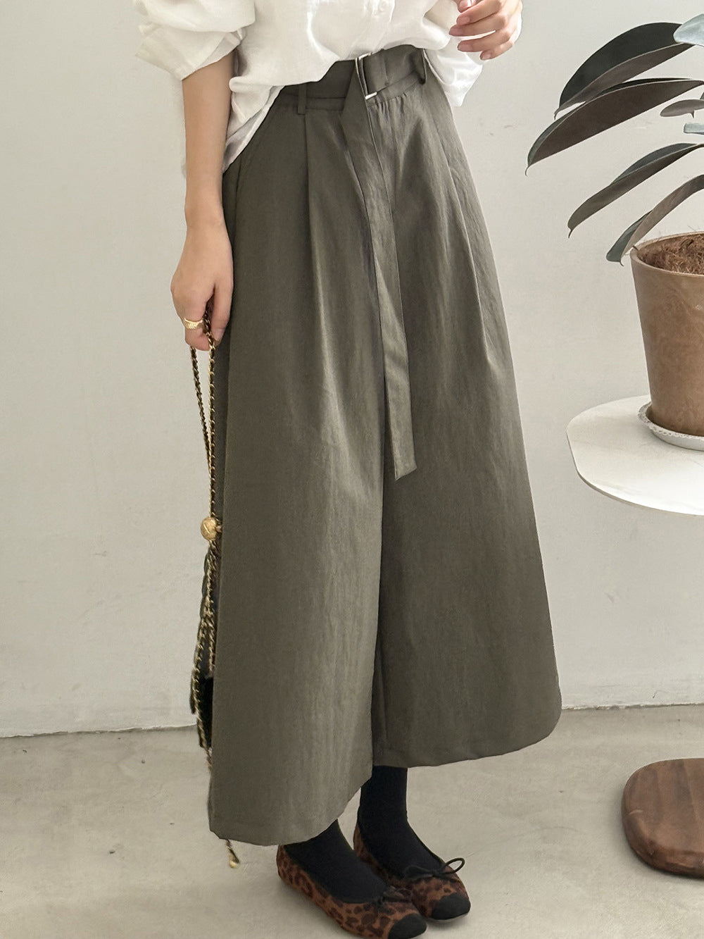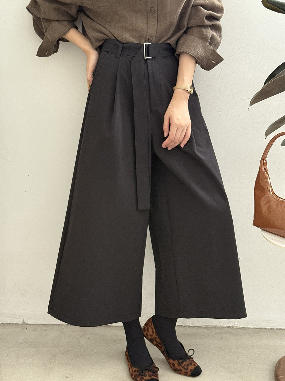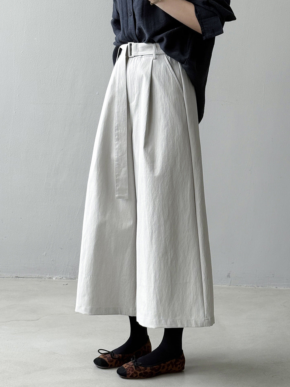 ウエストの共布ベルトと深めのタックが美シルエットを叶える、上品ワイドパンツ。