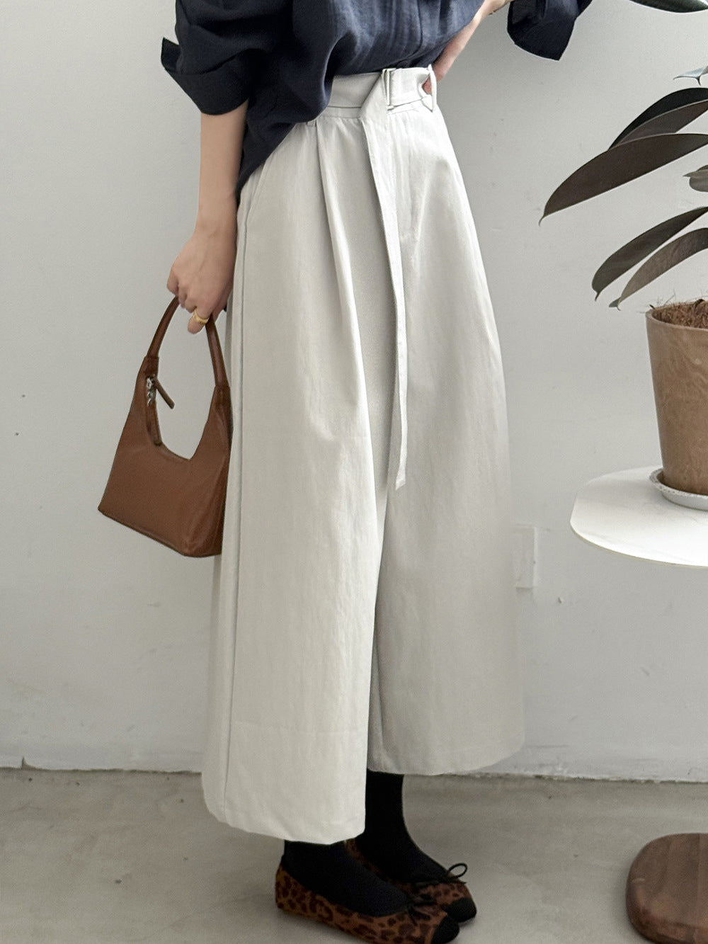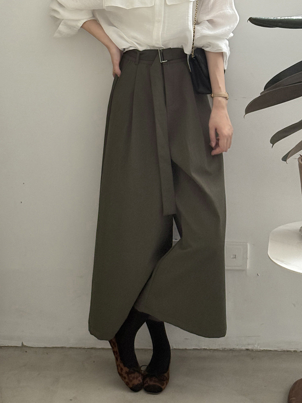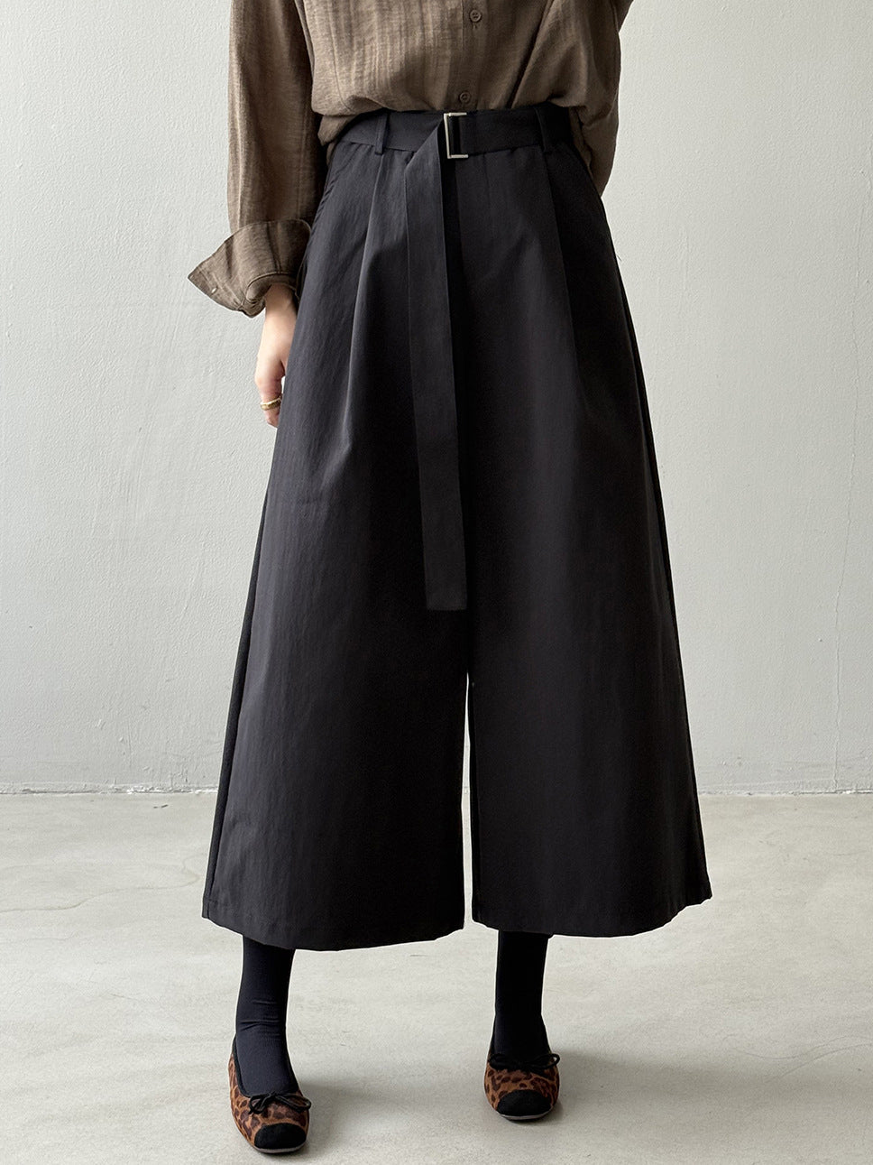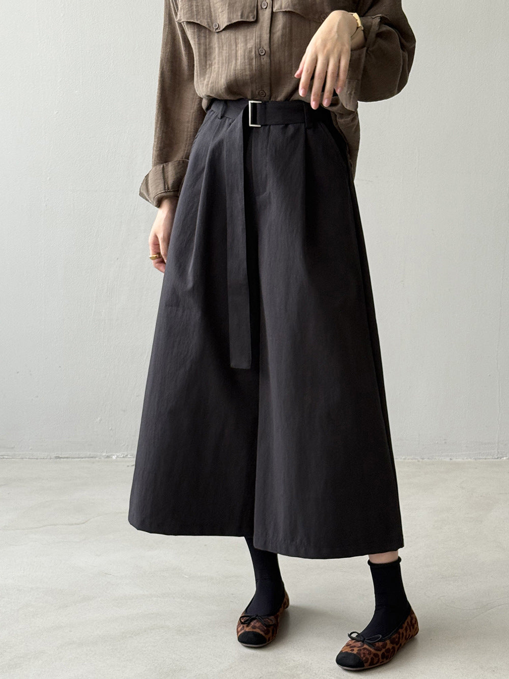 ウエストの共布ベルトと深めのタックが美シルエットを叶える、上品ワイドパンツ。