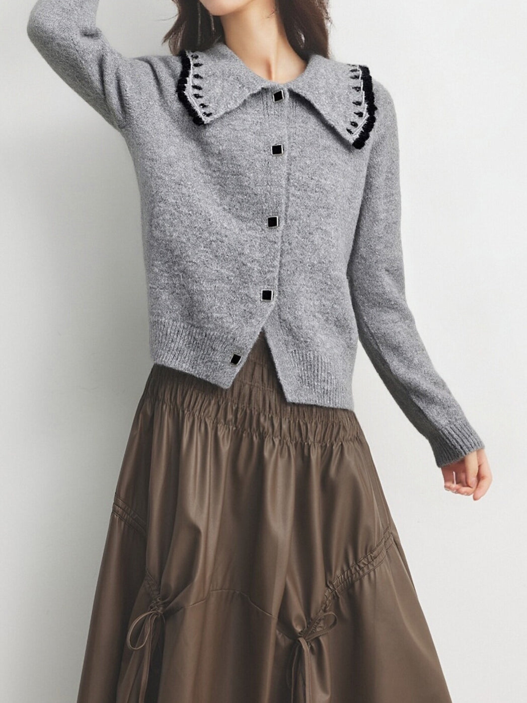 ☆襟に施されたビジューデザインと、配色ラインがコーデを華やかにしてくれます♪