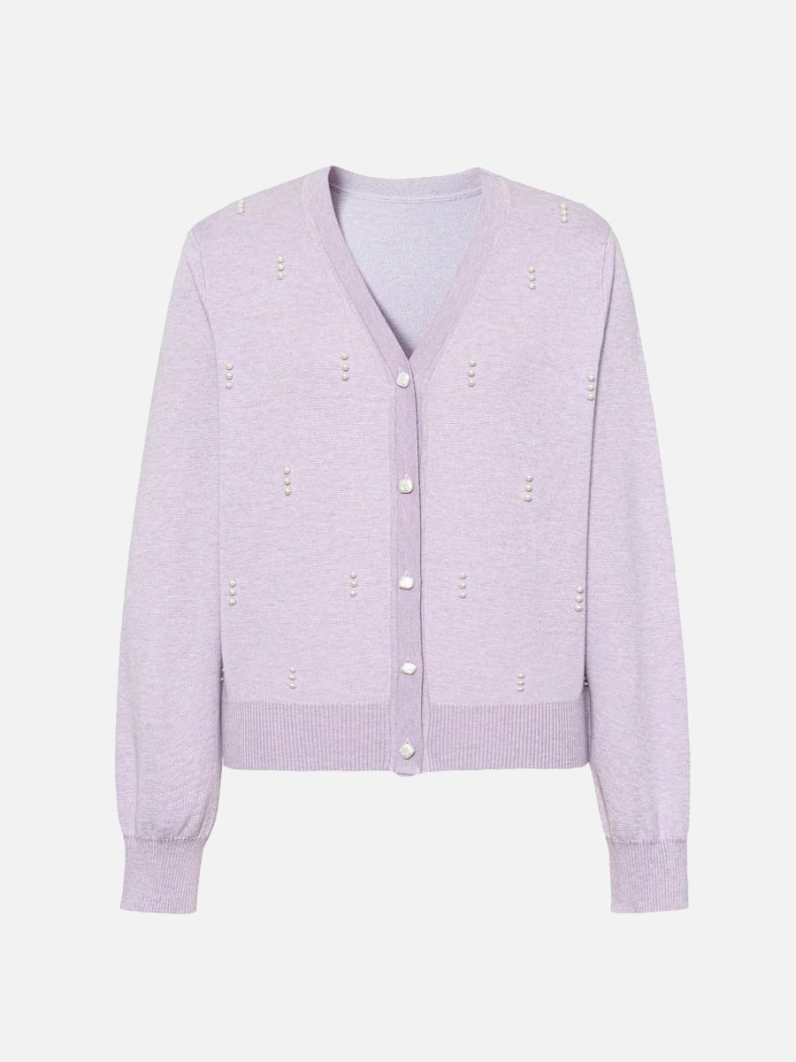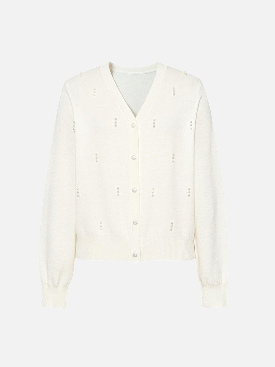 全方位にパール調をあしらった、大人かわいいニットカーディガン。