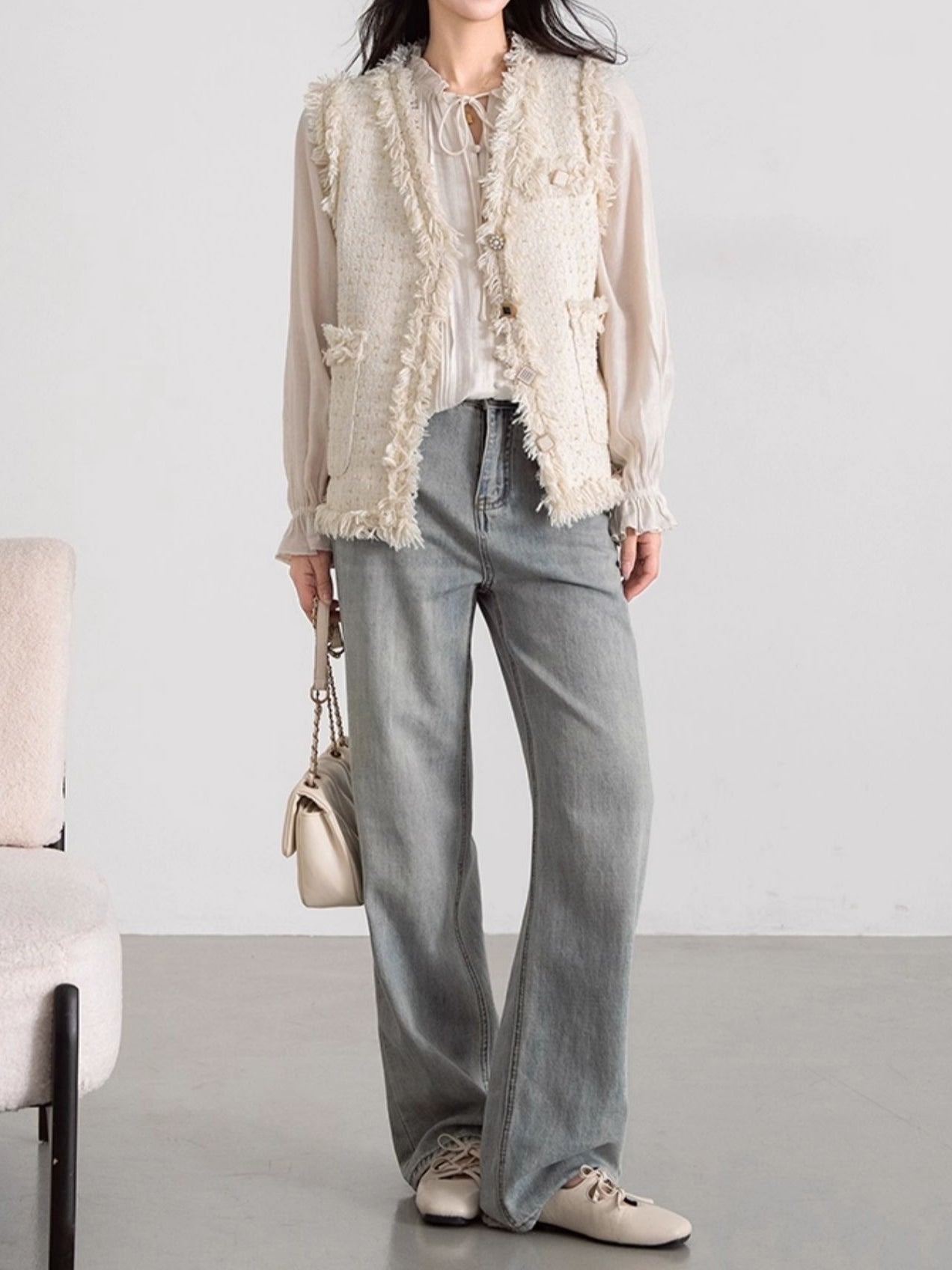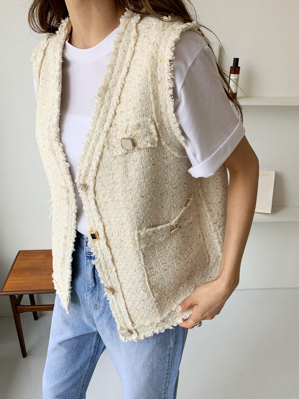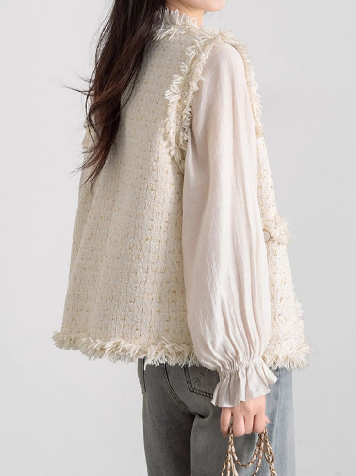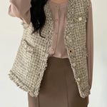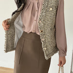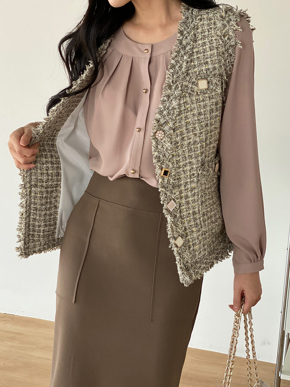上質なツイード素材を使用し、カジュアルになりすぎない上品な仕上がりに。