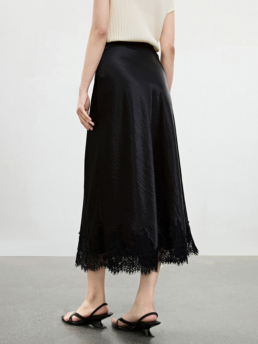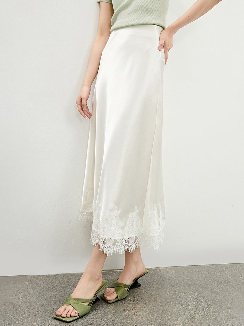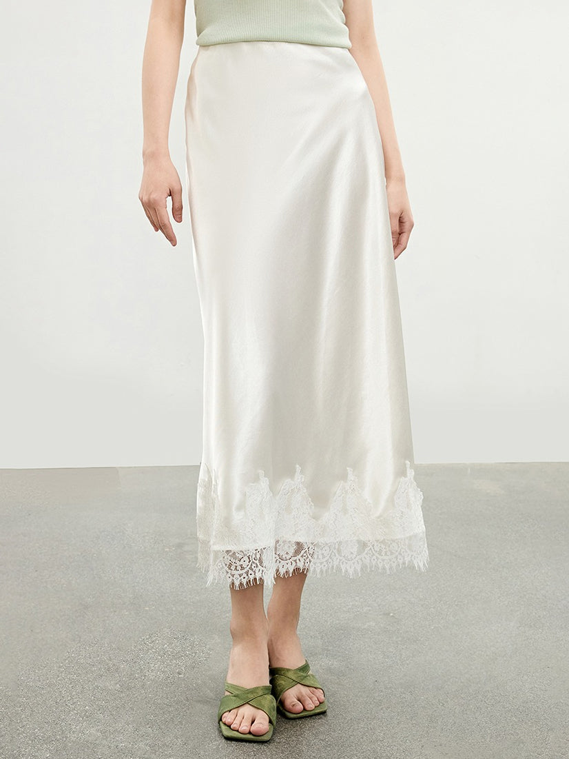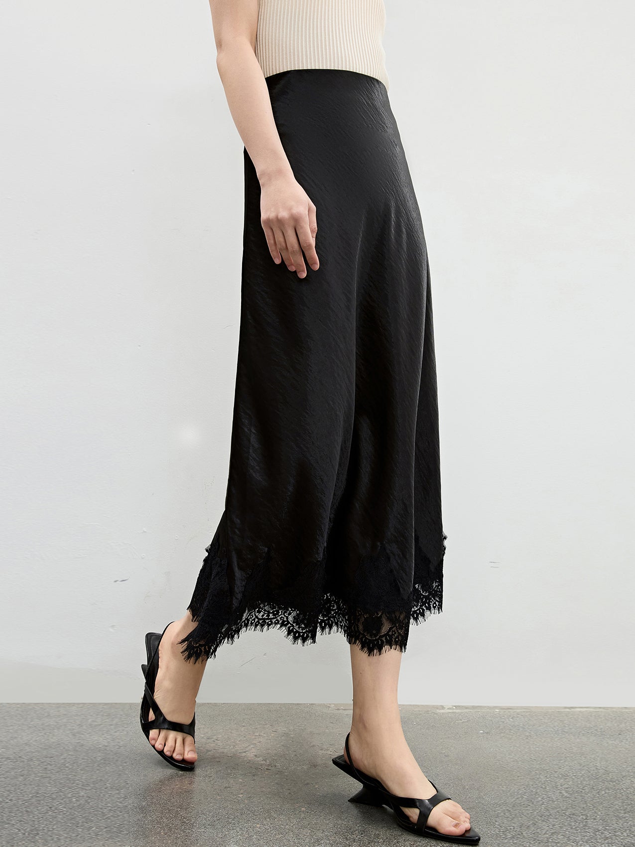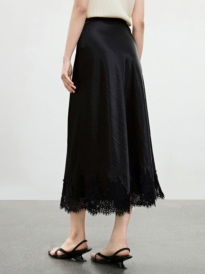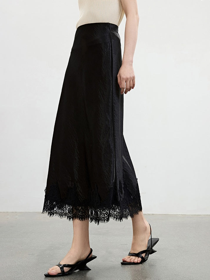 上品なサテン生地でアップデート、繊細なレースと組み合わせたロングスカート。