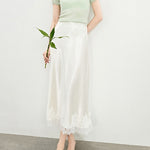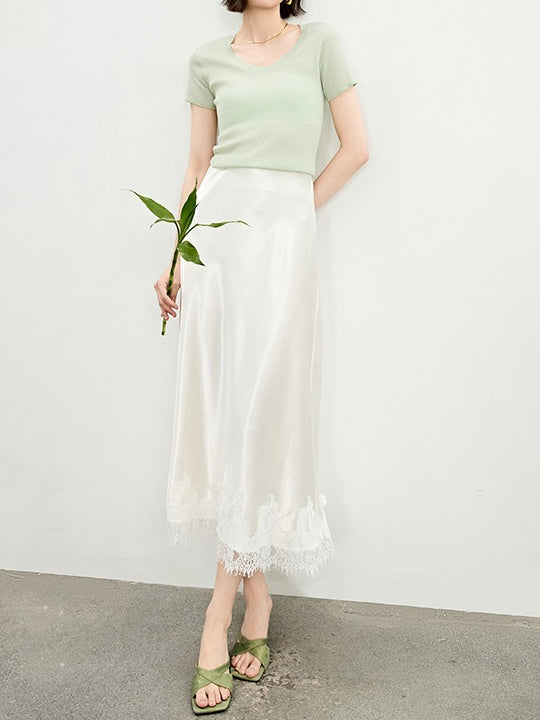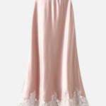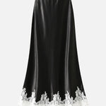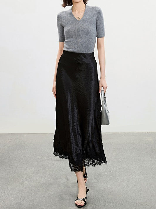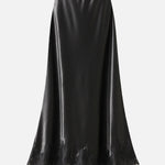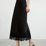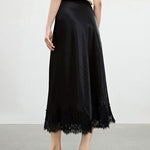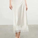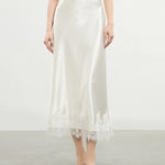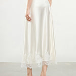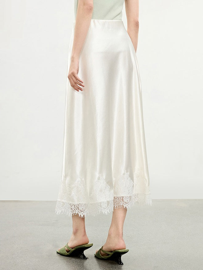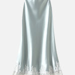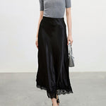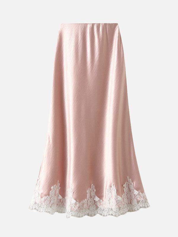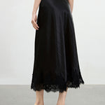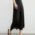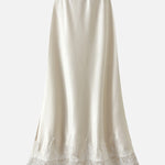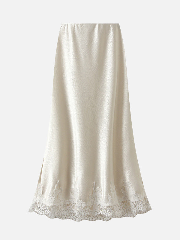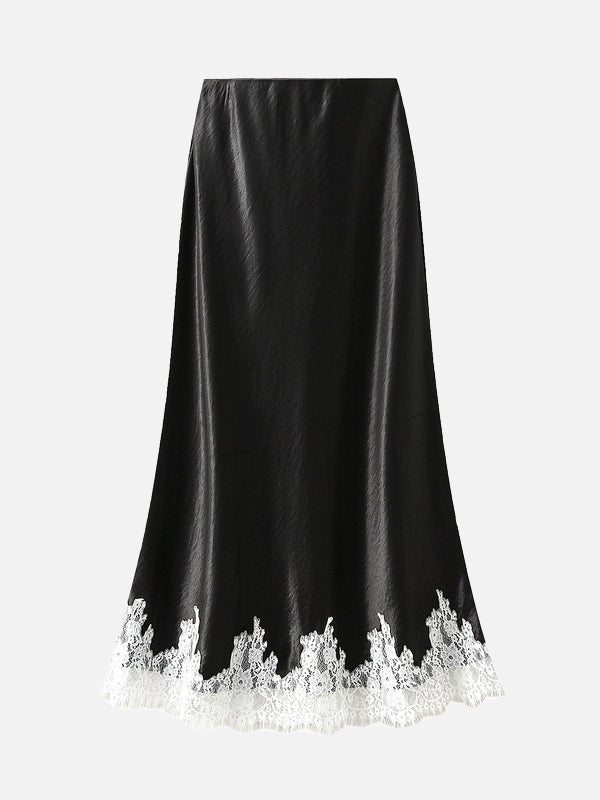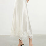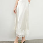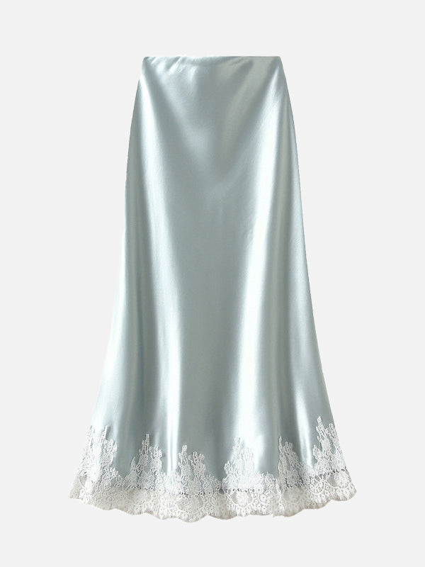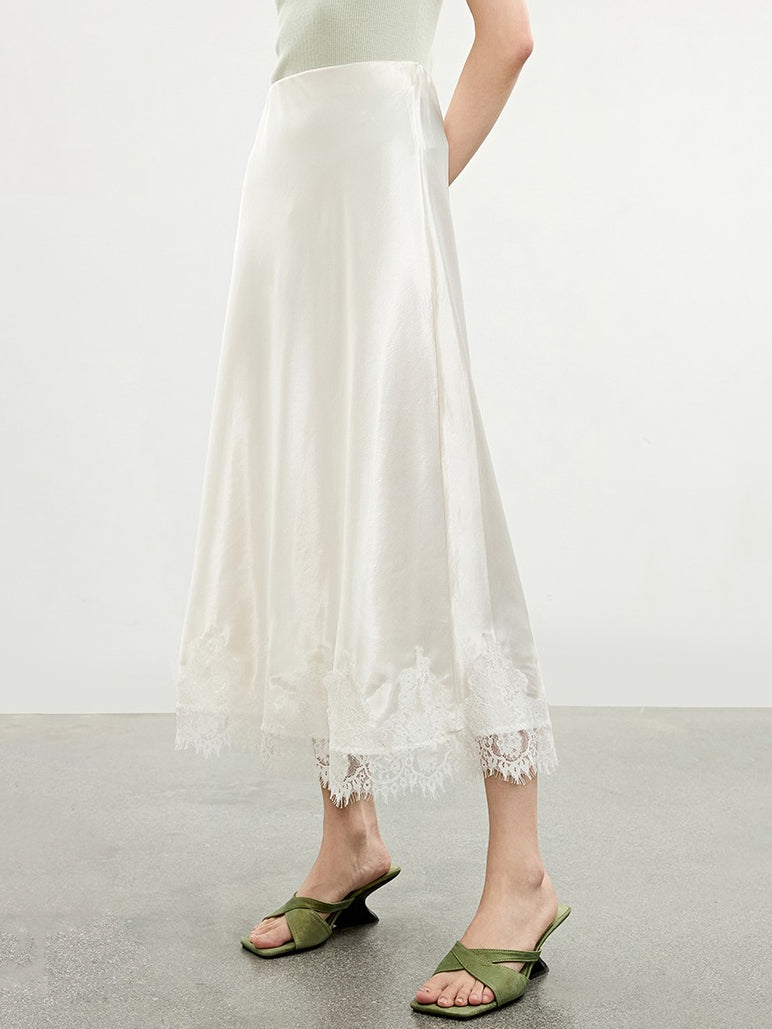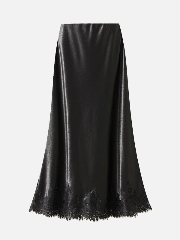 上品なサテン生地でアップデート、繊細なレースと組み合わせたロングスカート。
