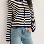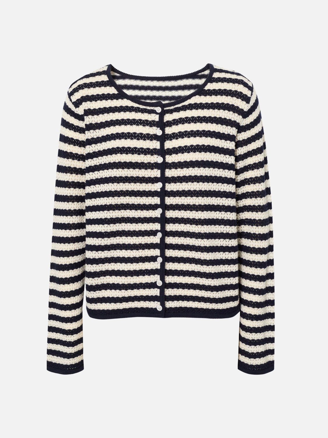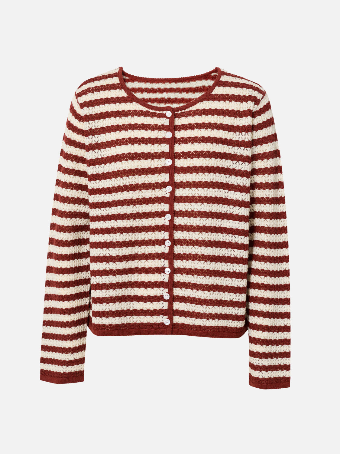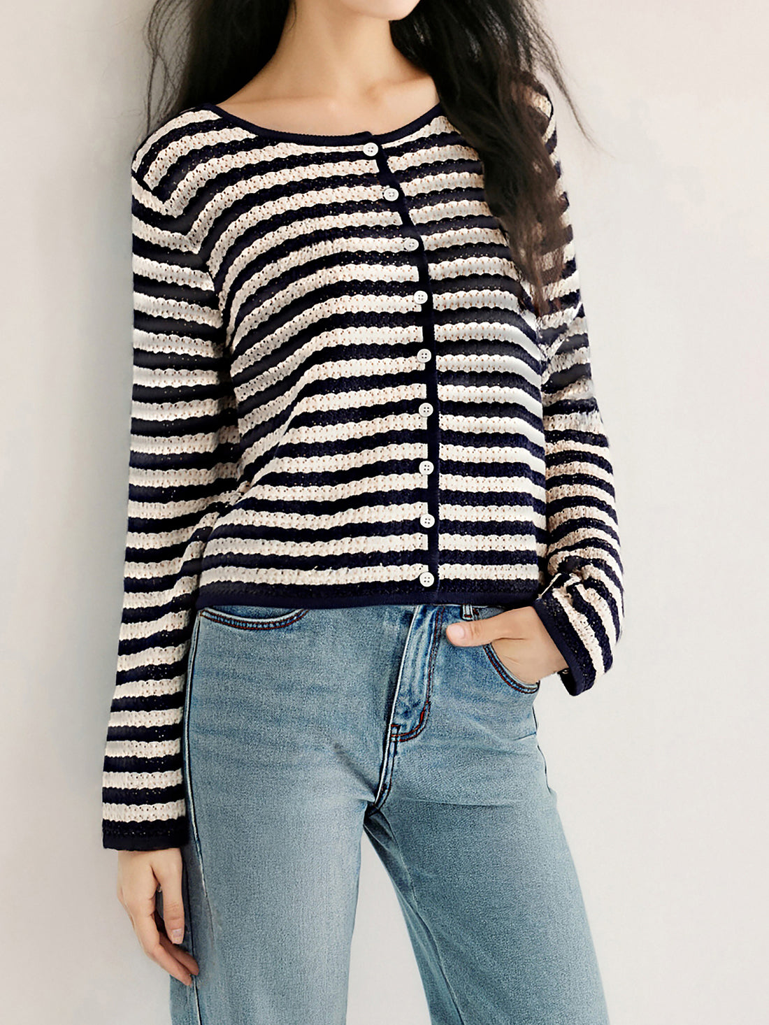 ボーダーデザインがアクセントのクルーネックカーディガン。