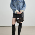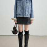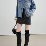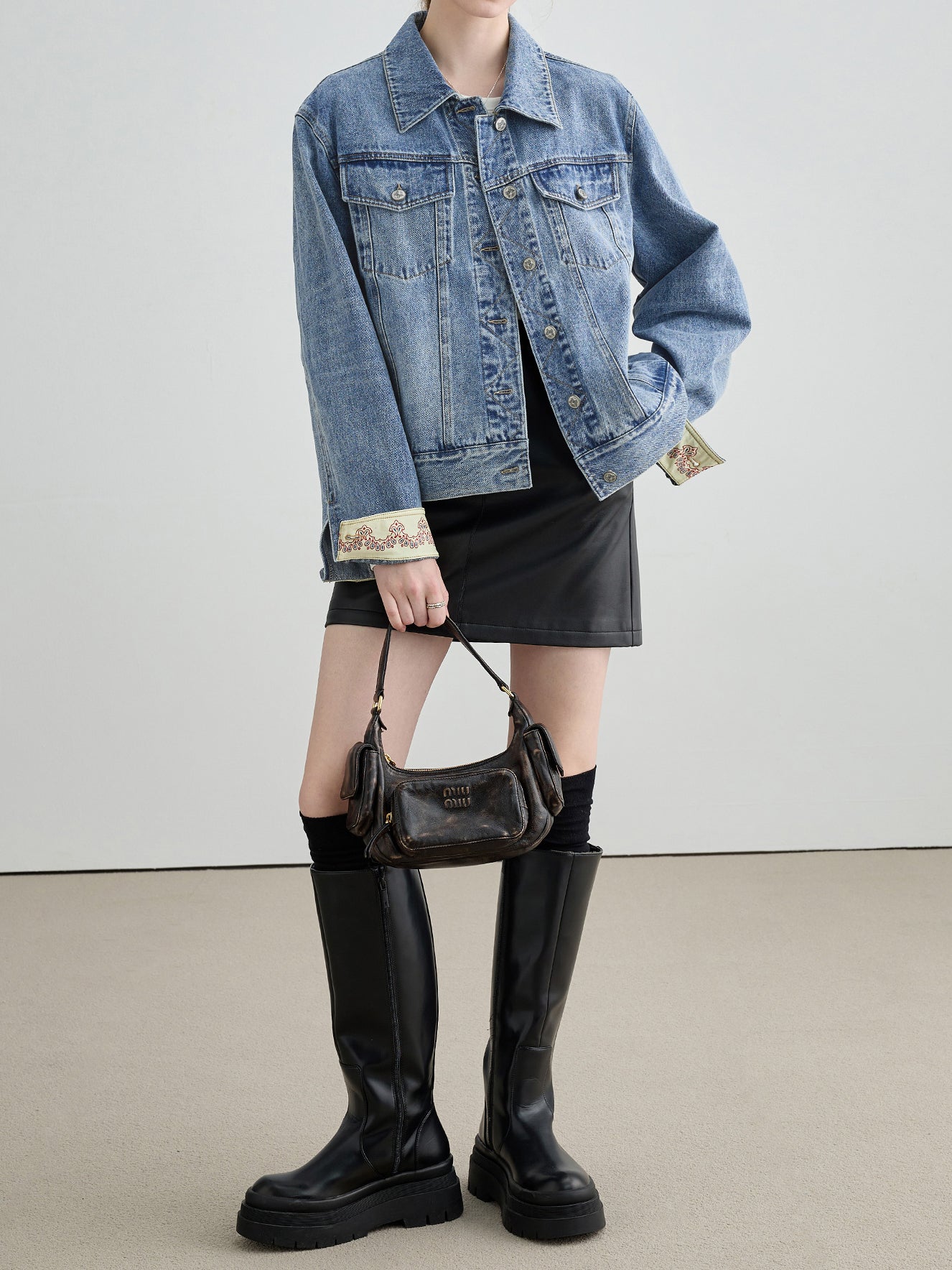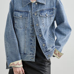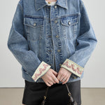 きれいなフラワープリントがカフスで大胆にほどこしたデニムジャケット。