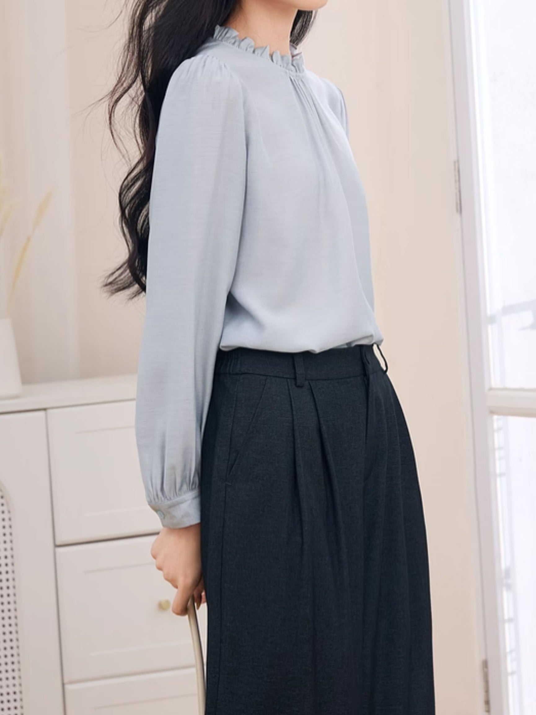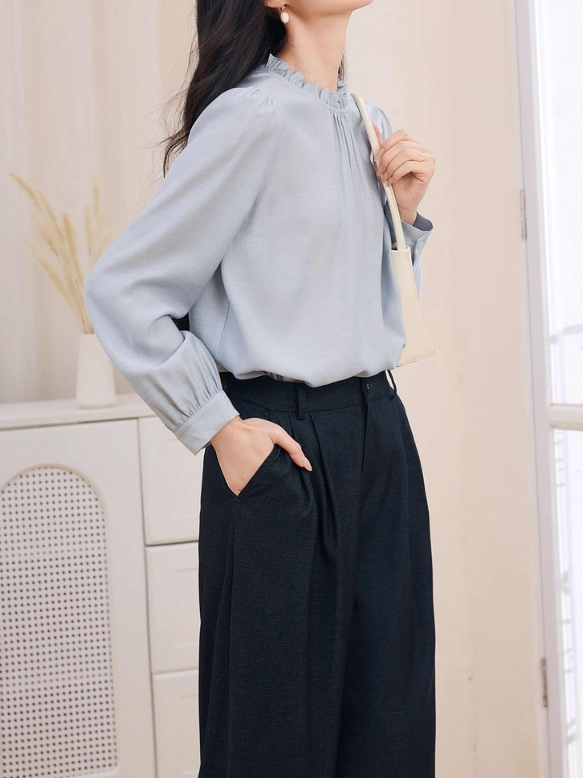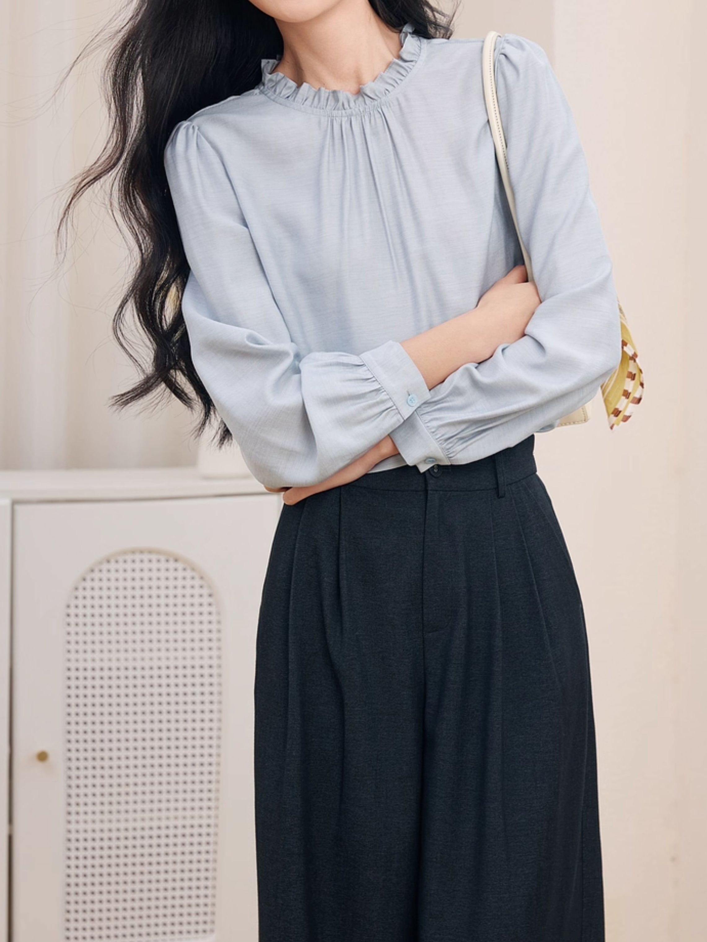 大人上品な印象を演出し、フリルネックでスッキリ綺麗めに仕上げました。