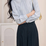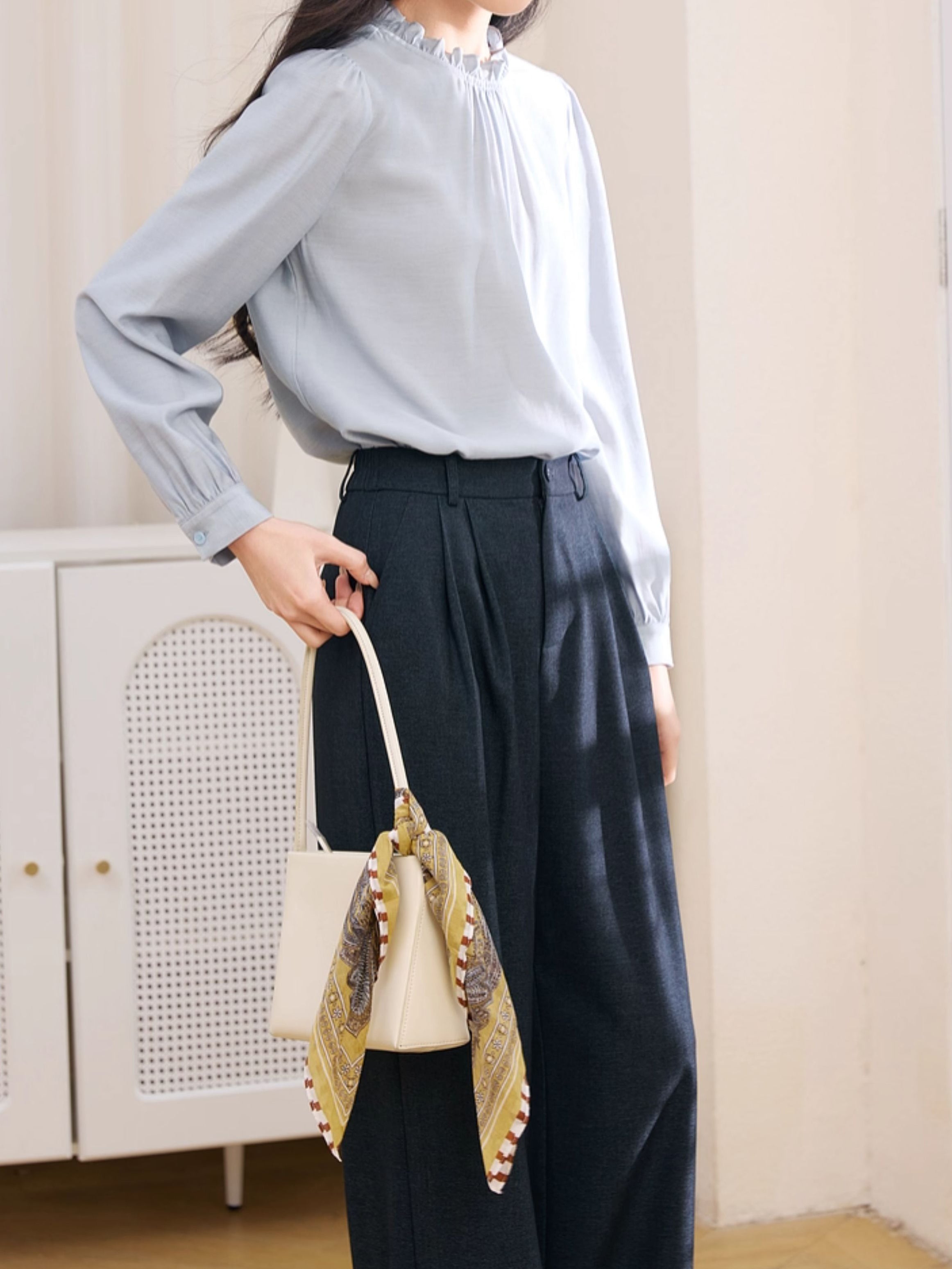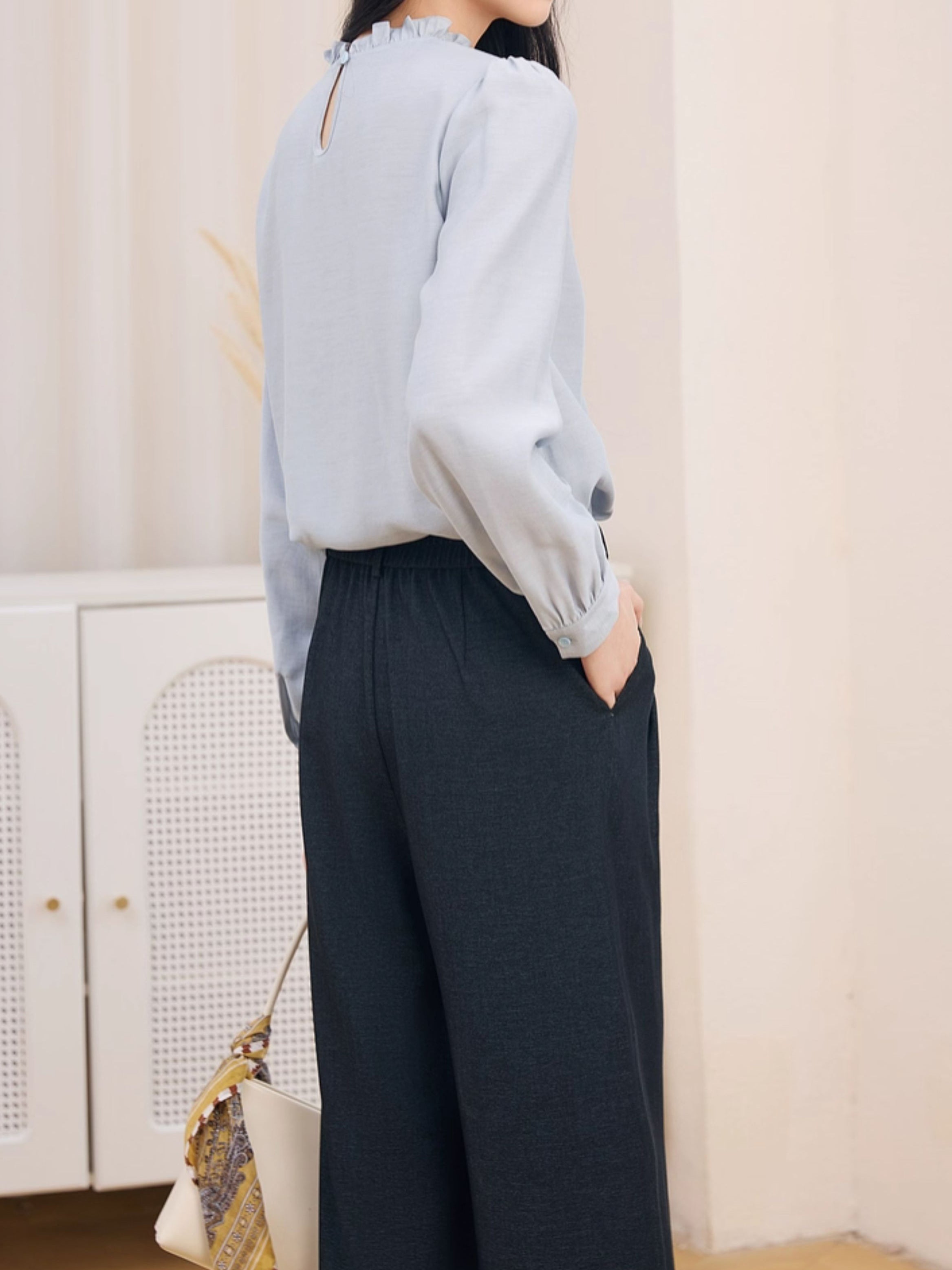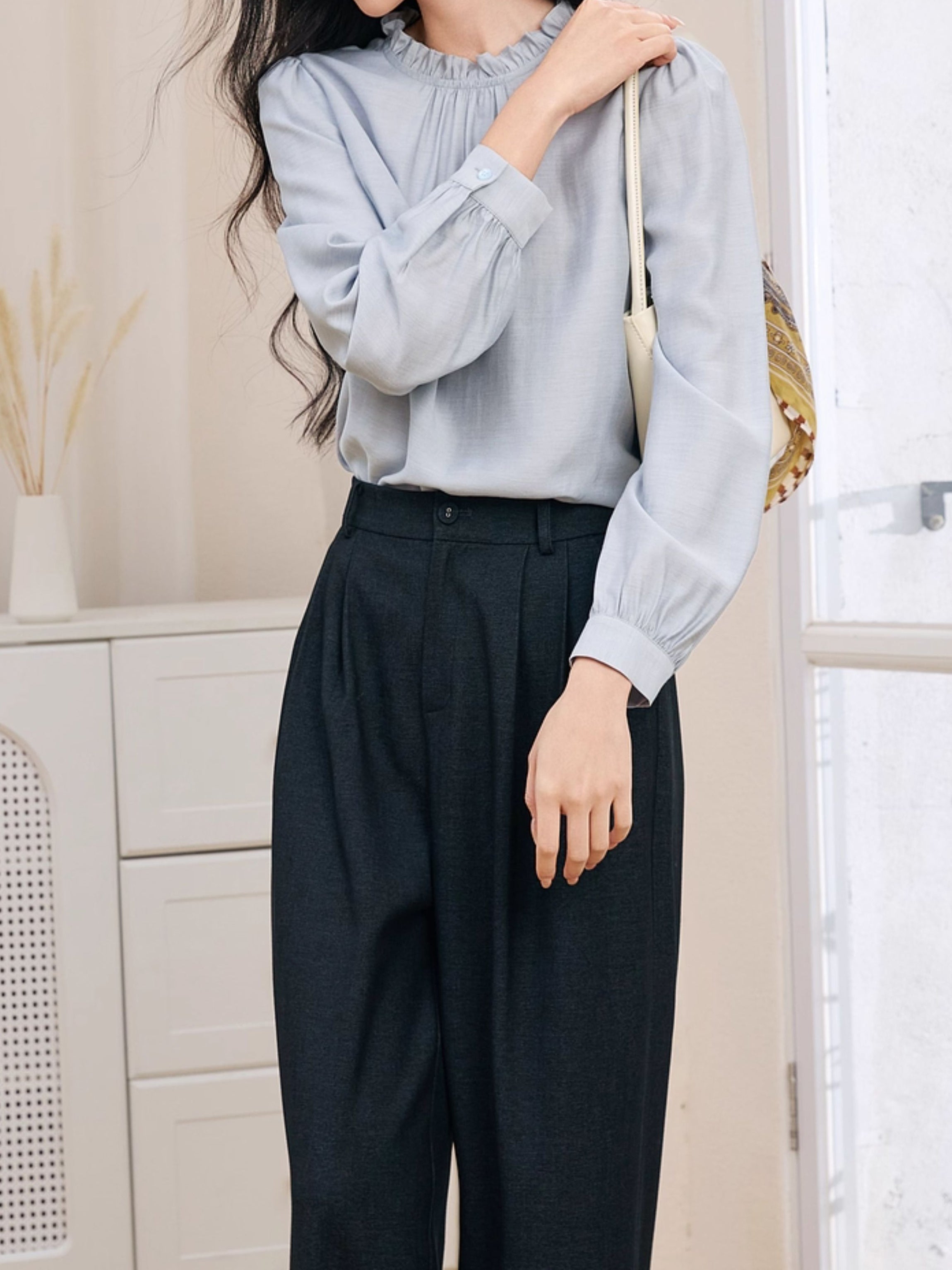 大人上品な印象を演出し、フリルネックでスッキリ綺麗めに仕上げました。
