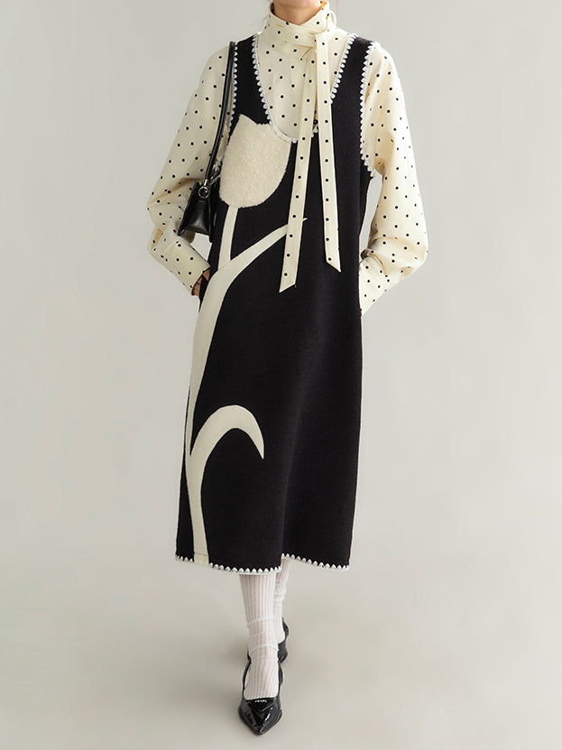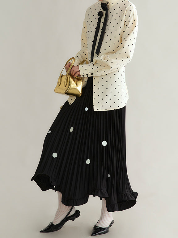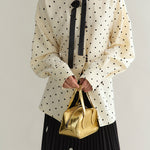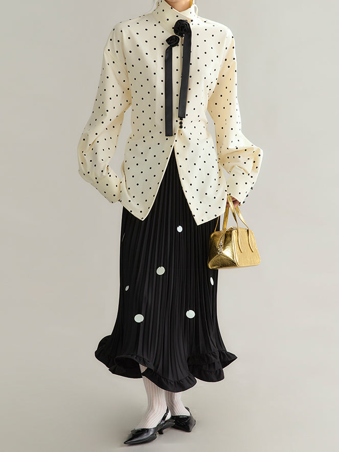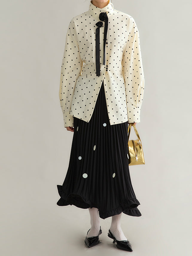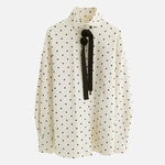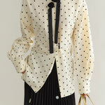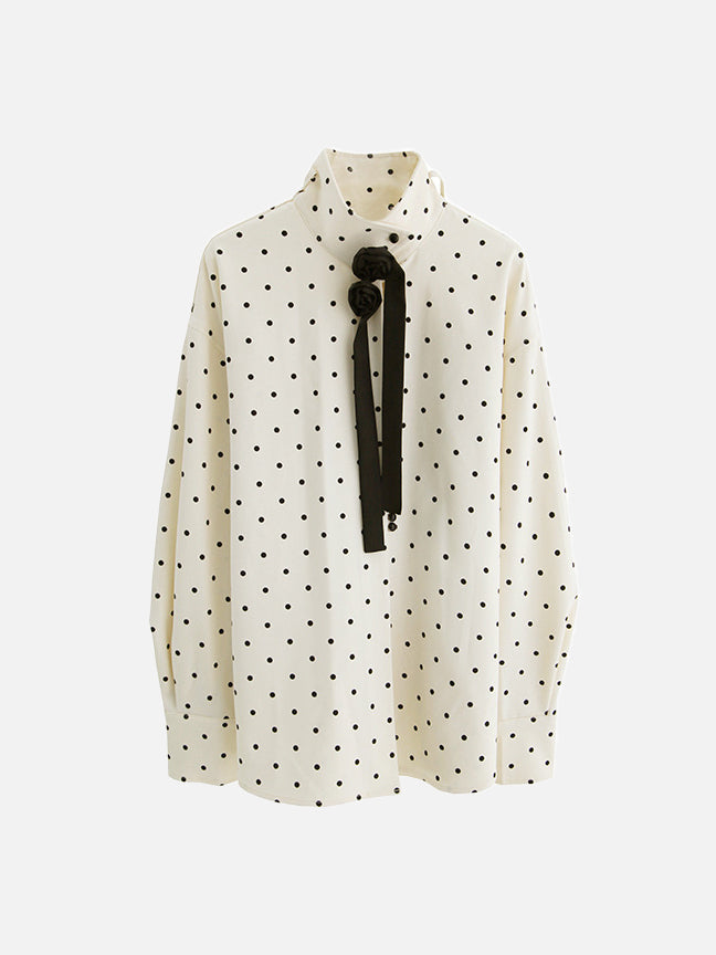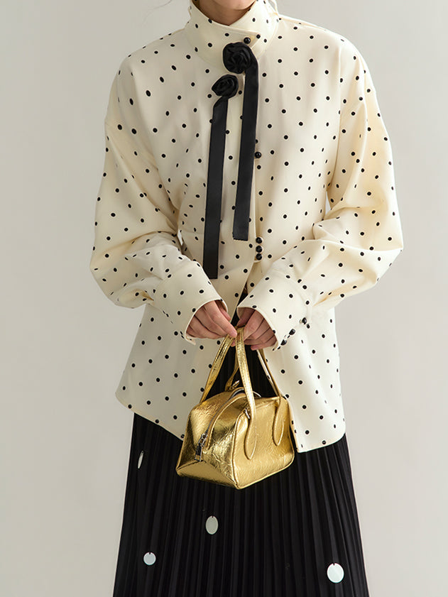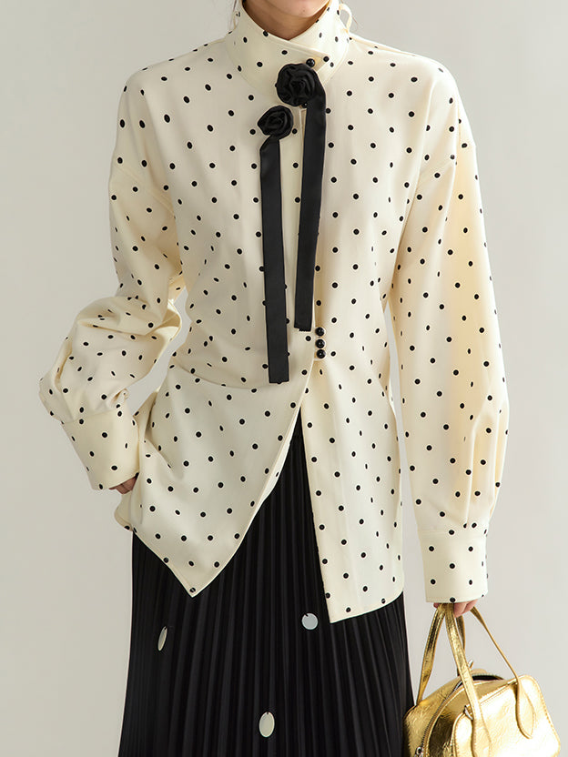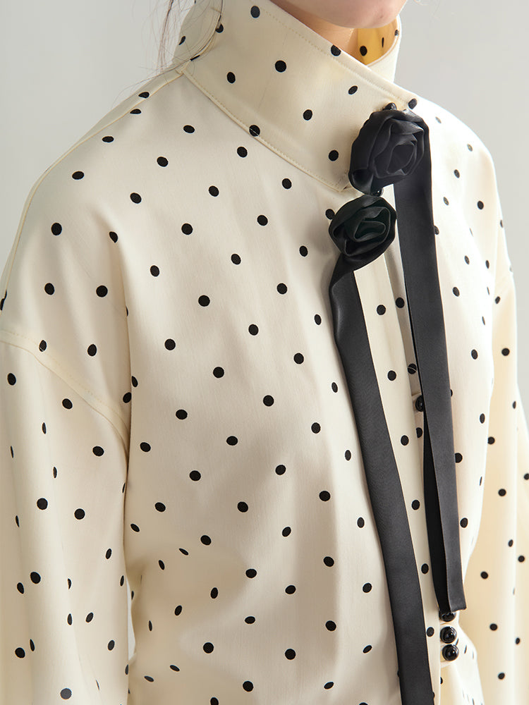 襟ぐりにローズデザイン装飾し、キレイめレディで気品度アップなドットブラウス。