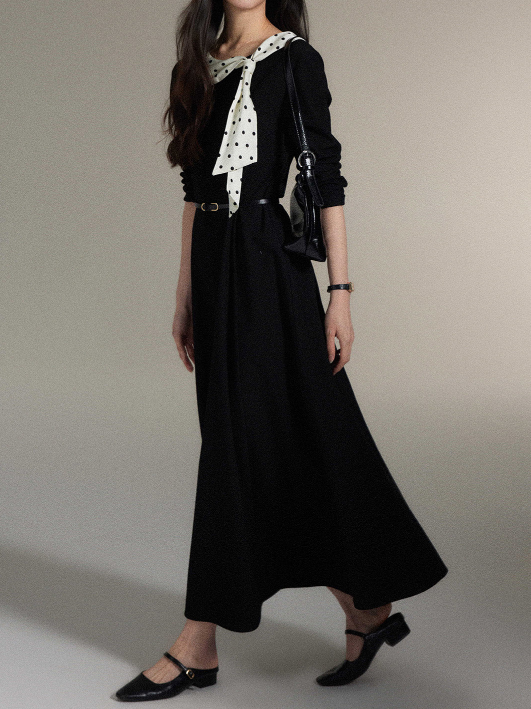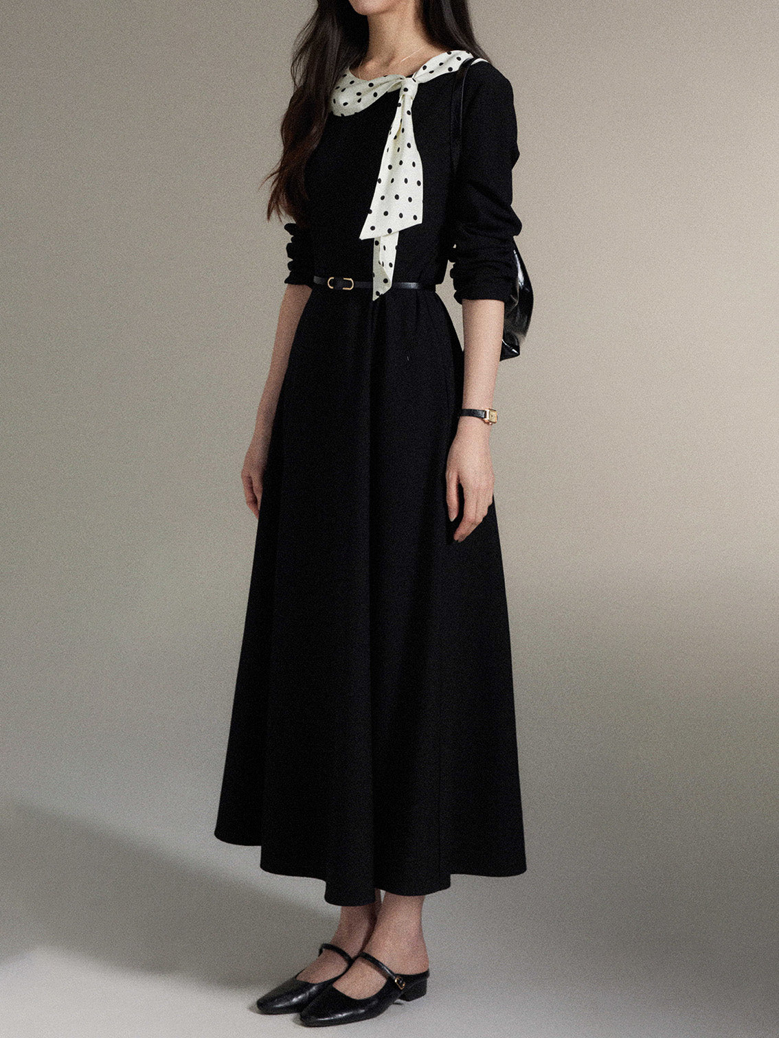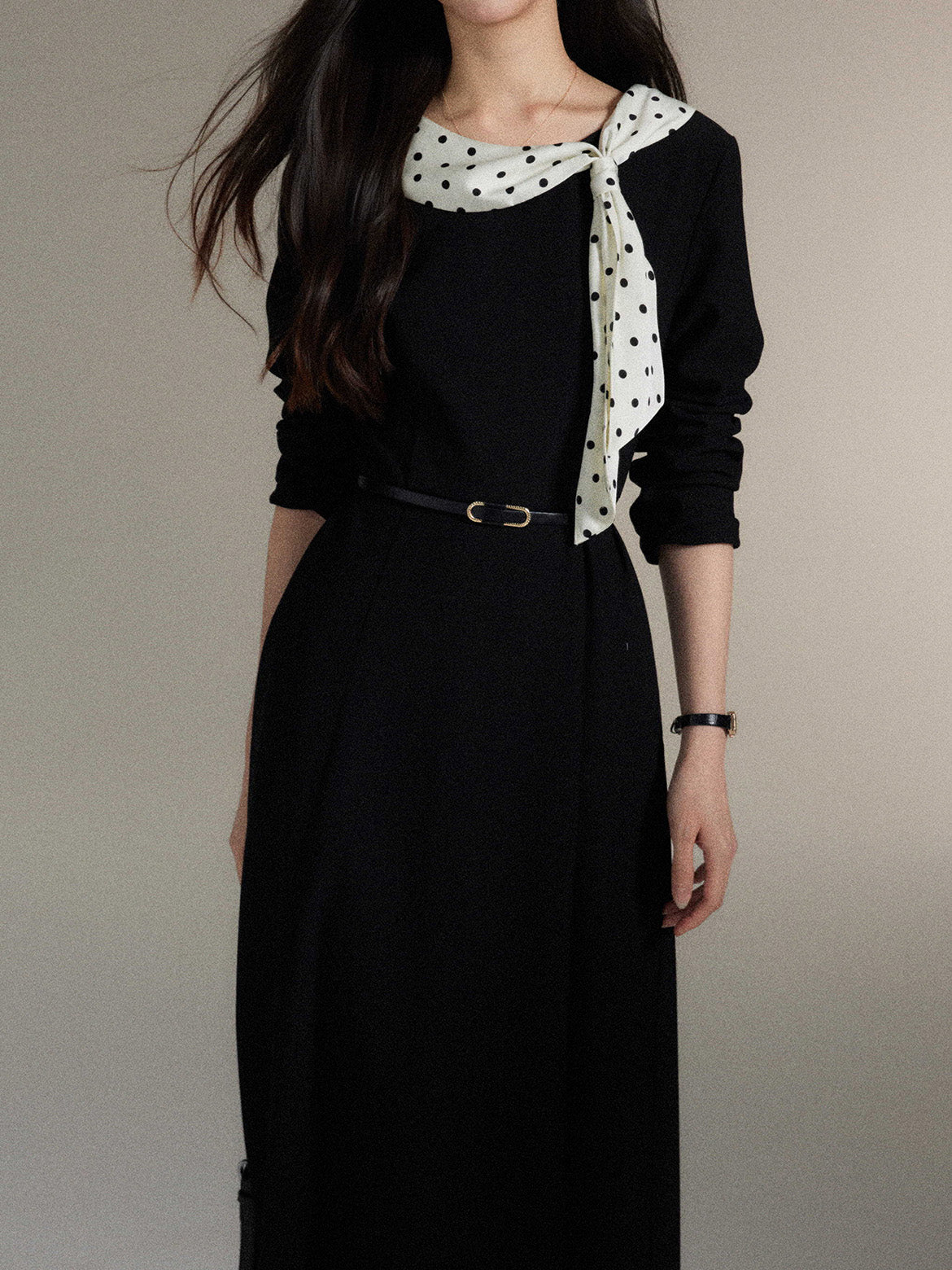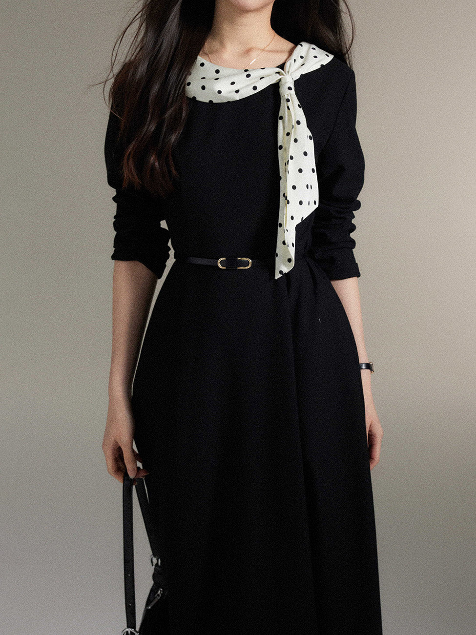 存在感のあるドットスカーフが付いていて、キチンとした印象のワンピース。