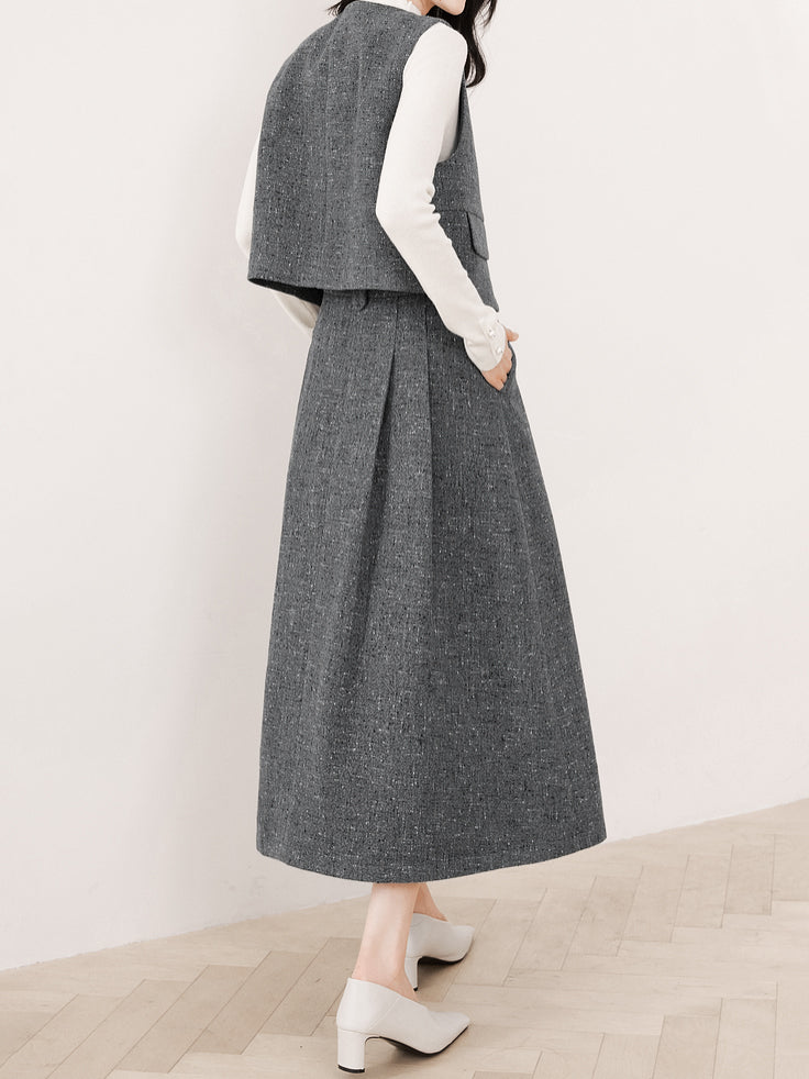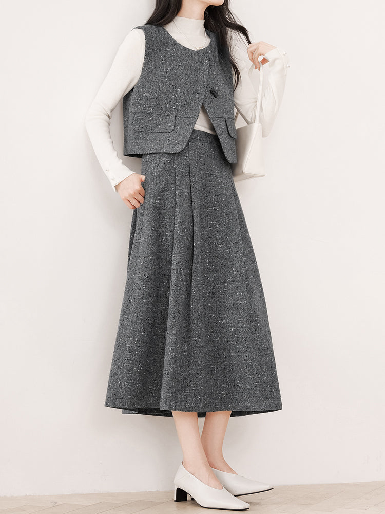 厚みのあるツイードの質感が、コーデに一気に華やかさを与えるショートジレ