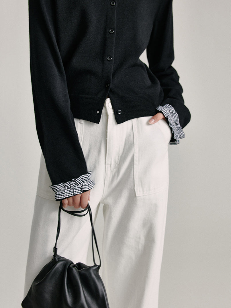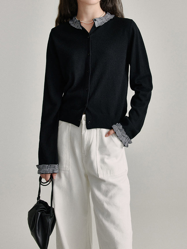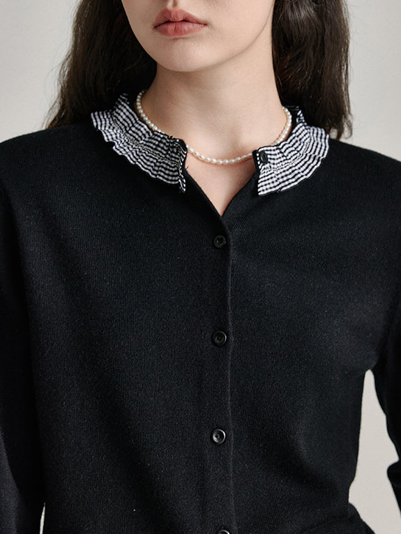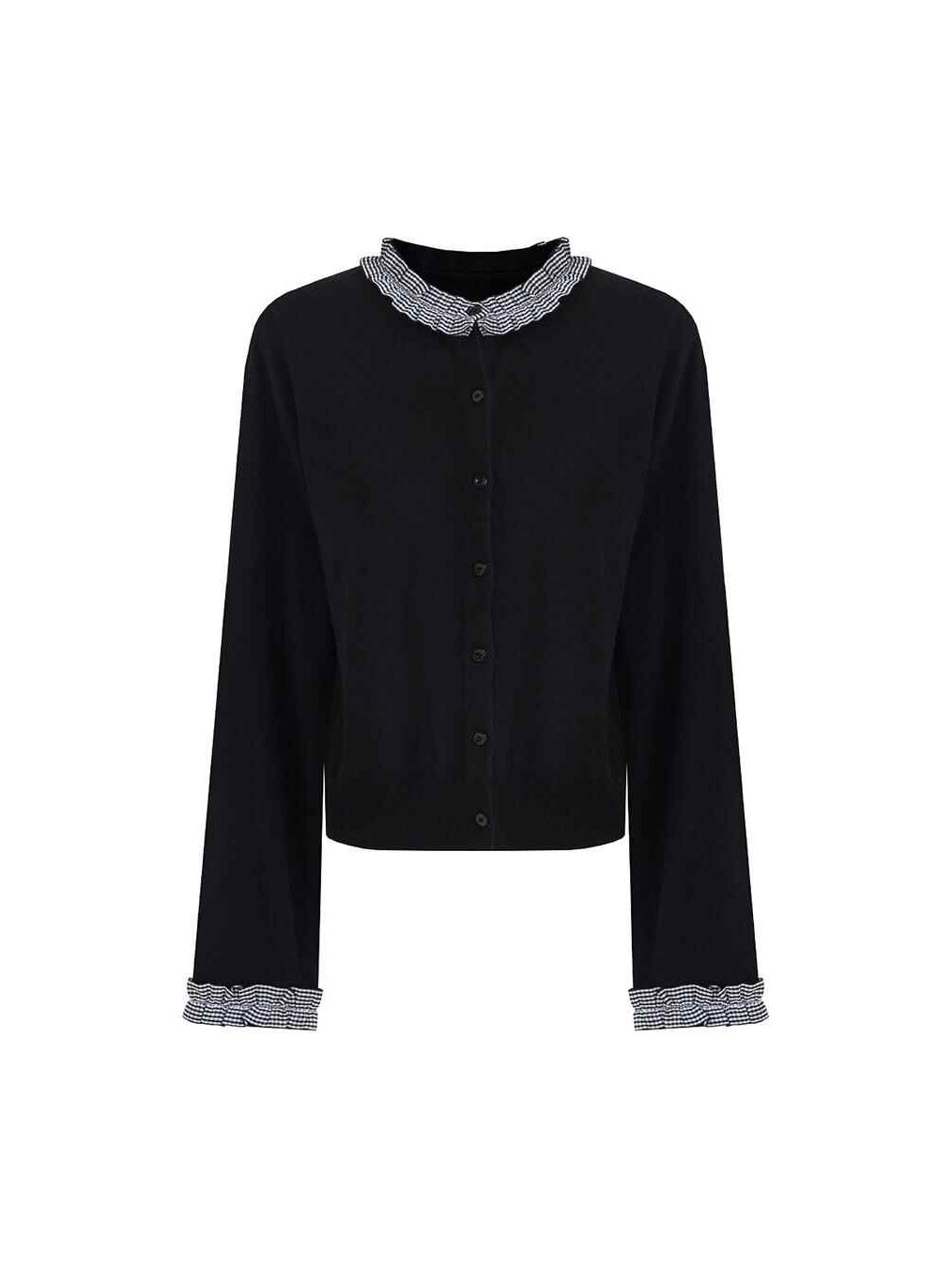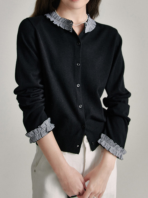 【レトロでな雰囲気のギンガムチェックフリルデザインがフレンチガーリーを演出するニットカーディガン】
