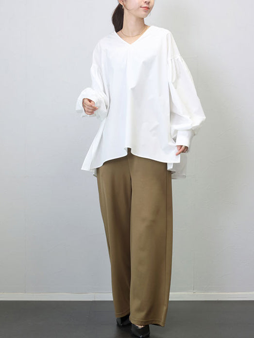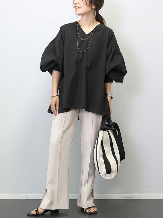 シャープなVネックがデコルテを綺麗に見せてくれるバックペプラムトップス。