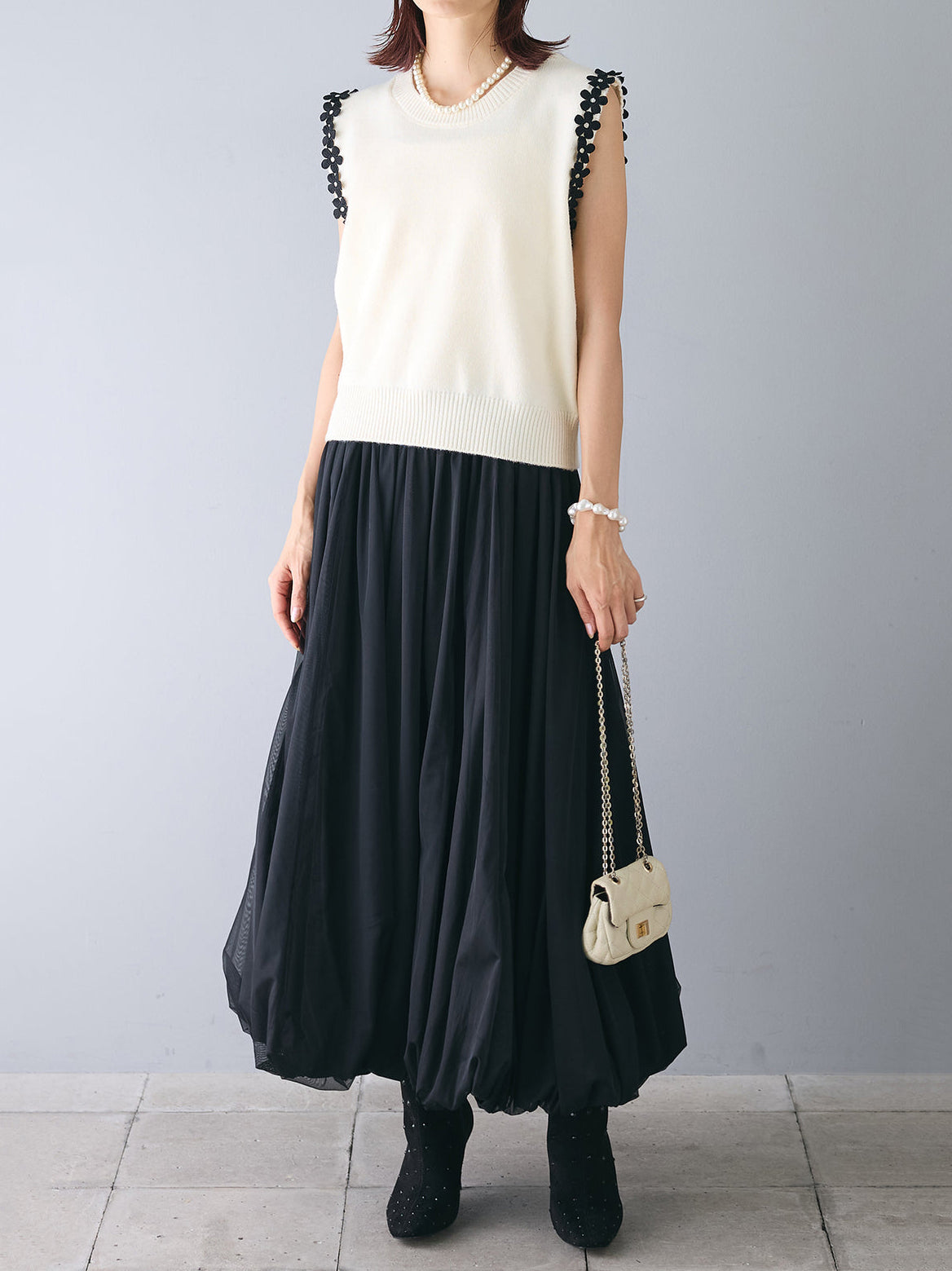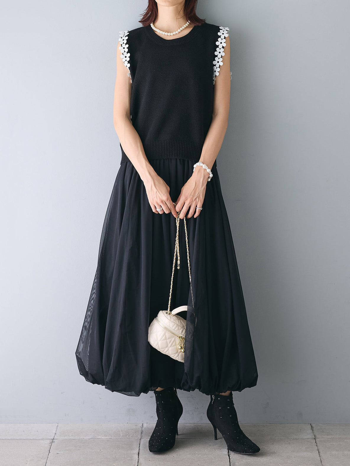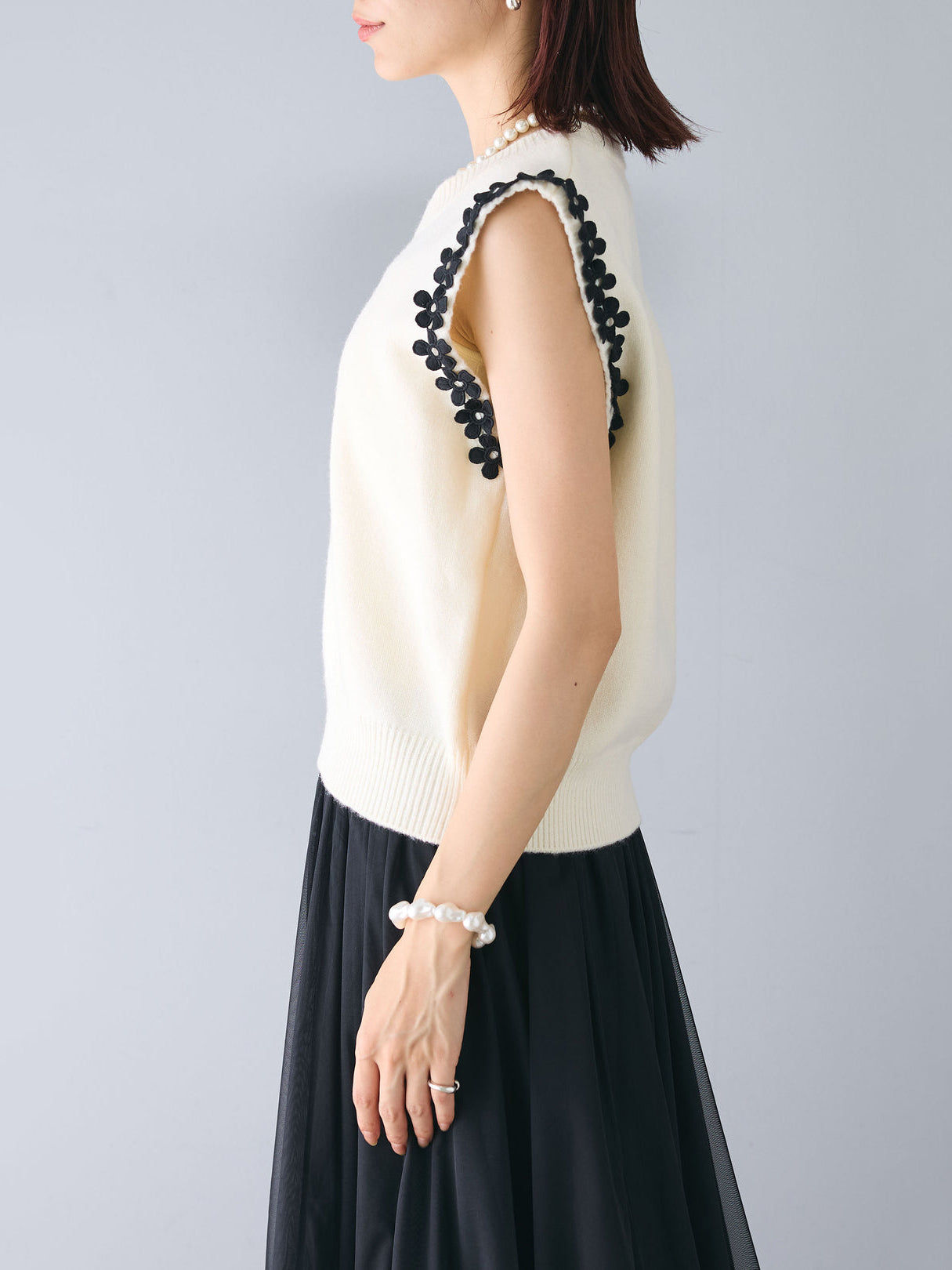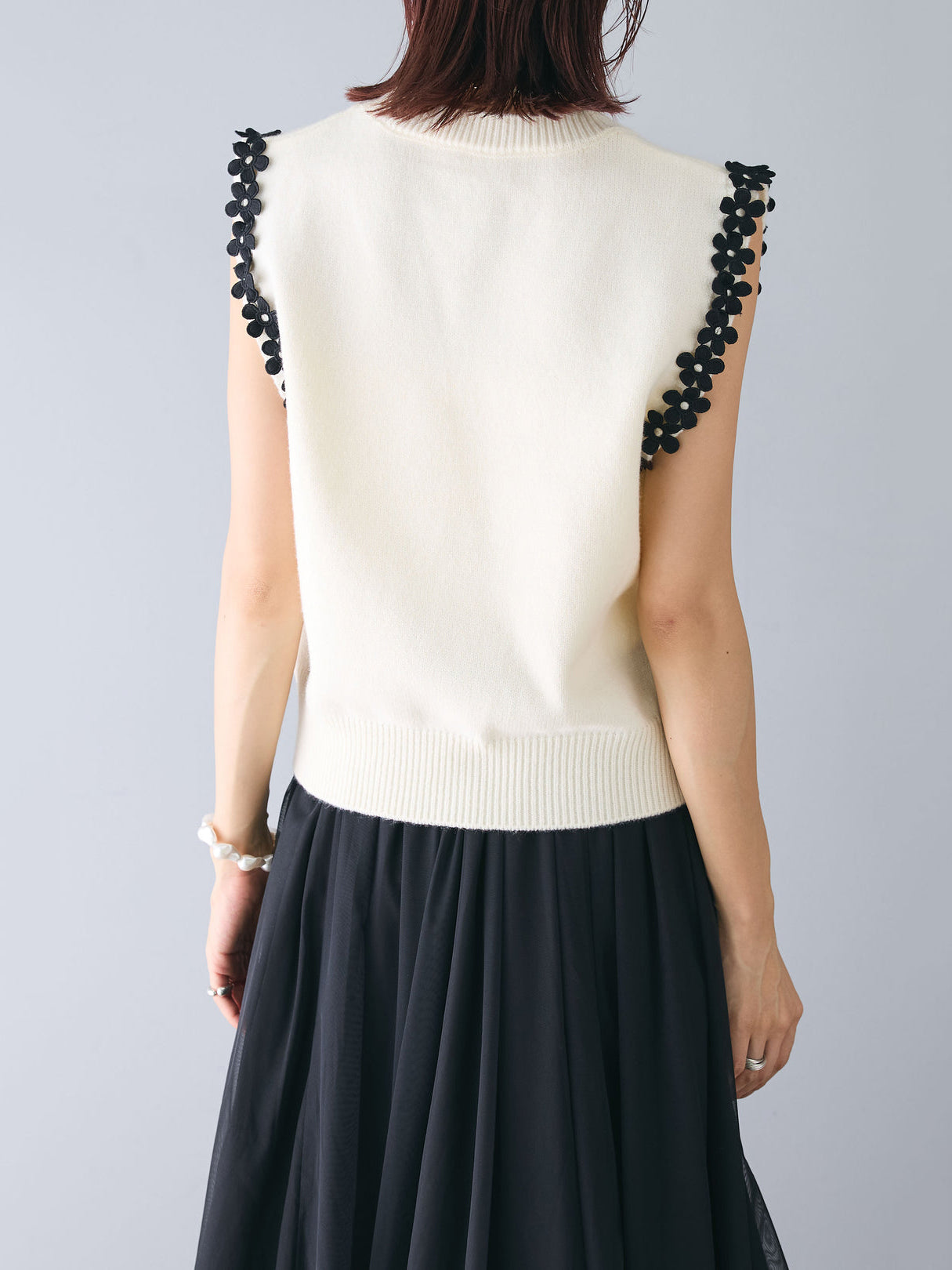 【花の装飾をちりばめたベストにもなるノースリブニット】