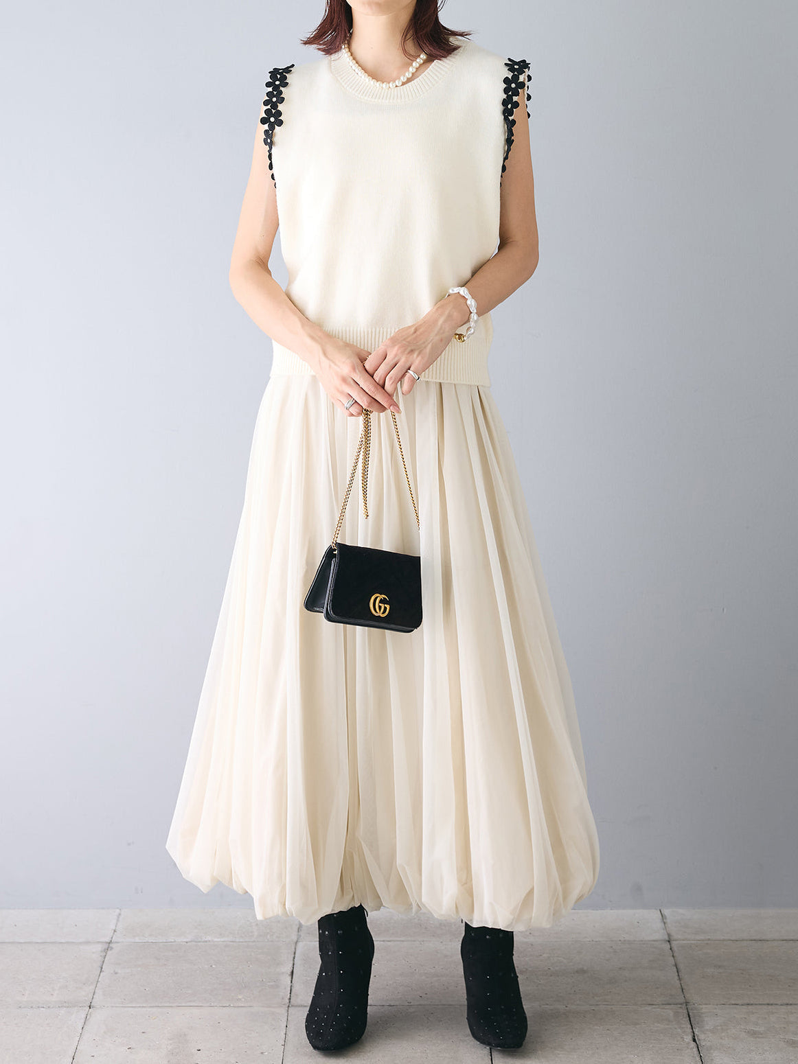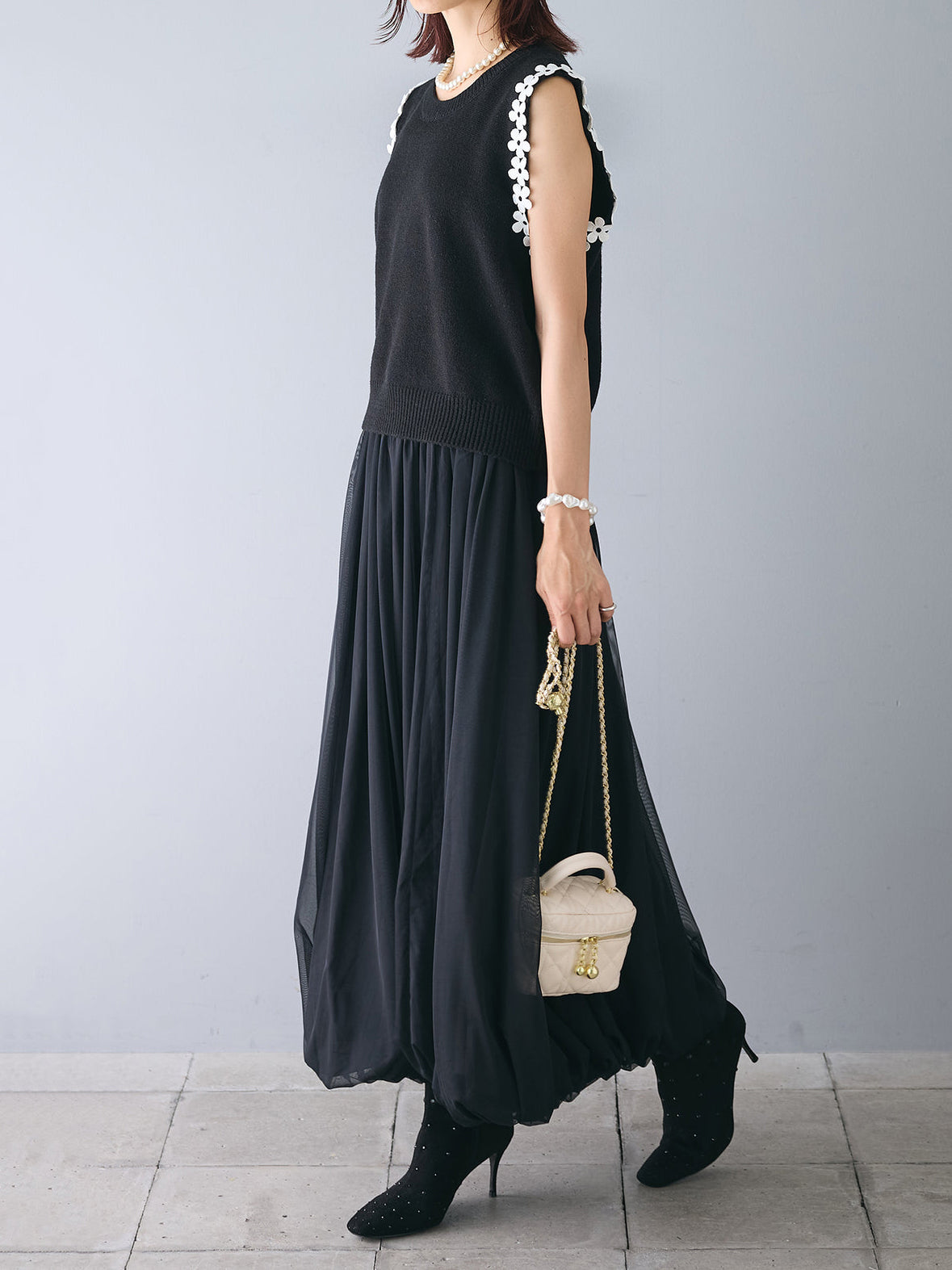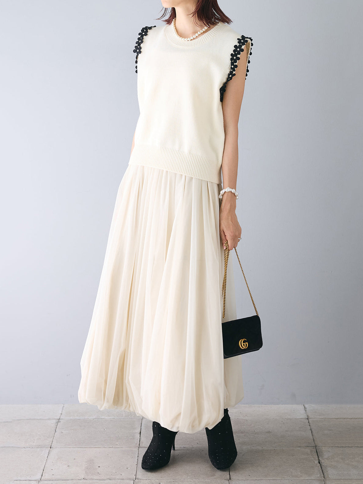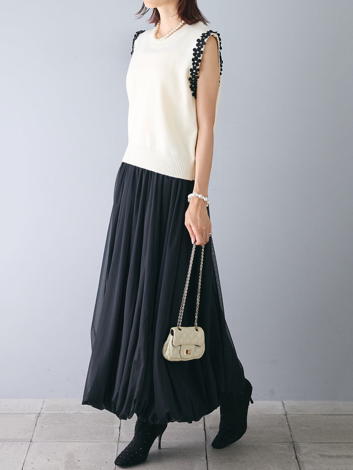 【花の装飾をちりばめたベストにもなるノースリブニット】