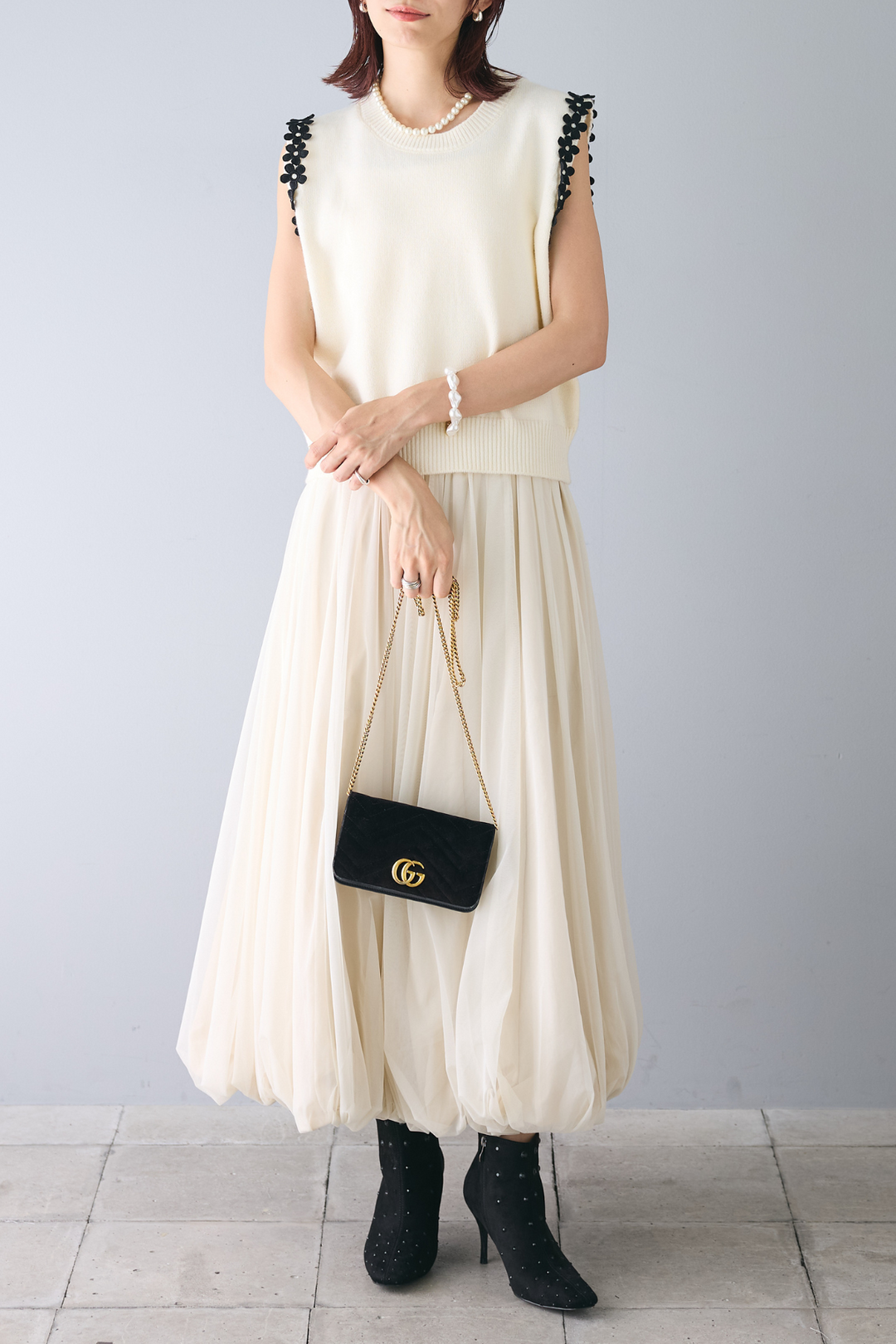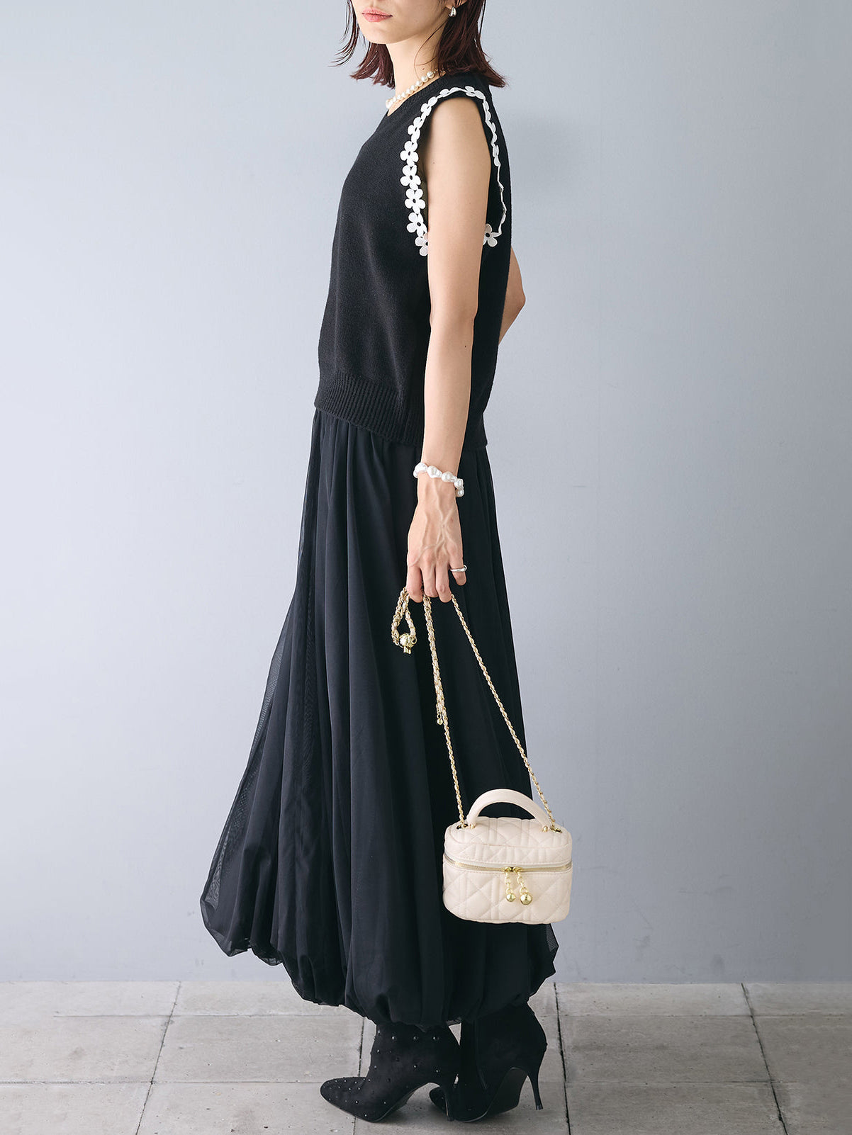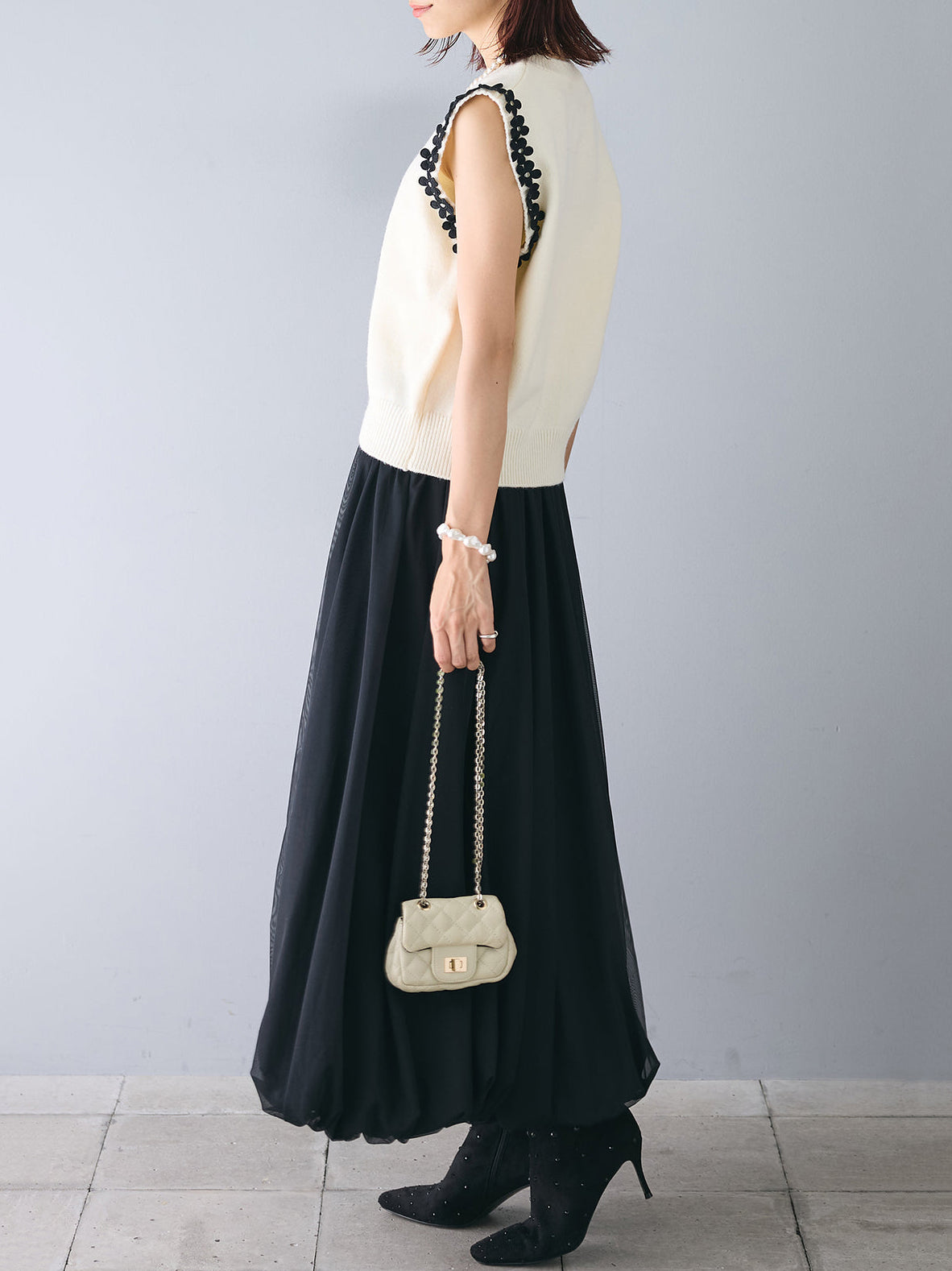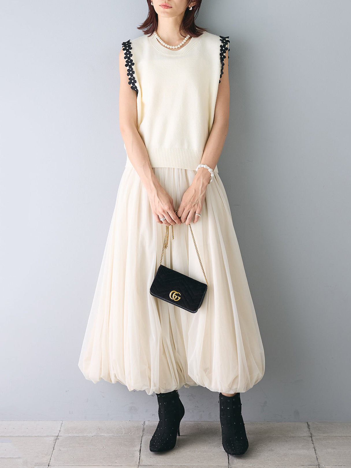 【花の装飾をちりばめたベストにもなるノースリブニット】