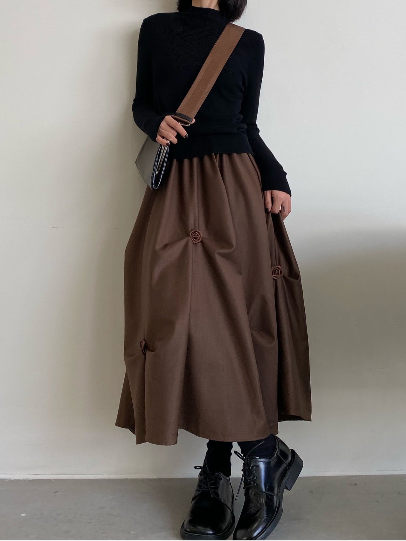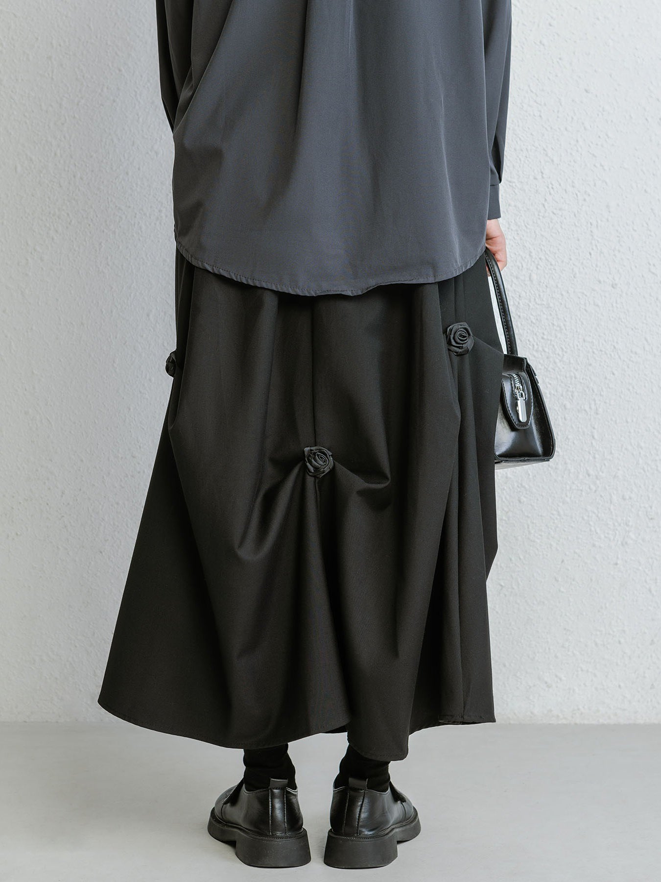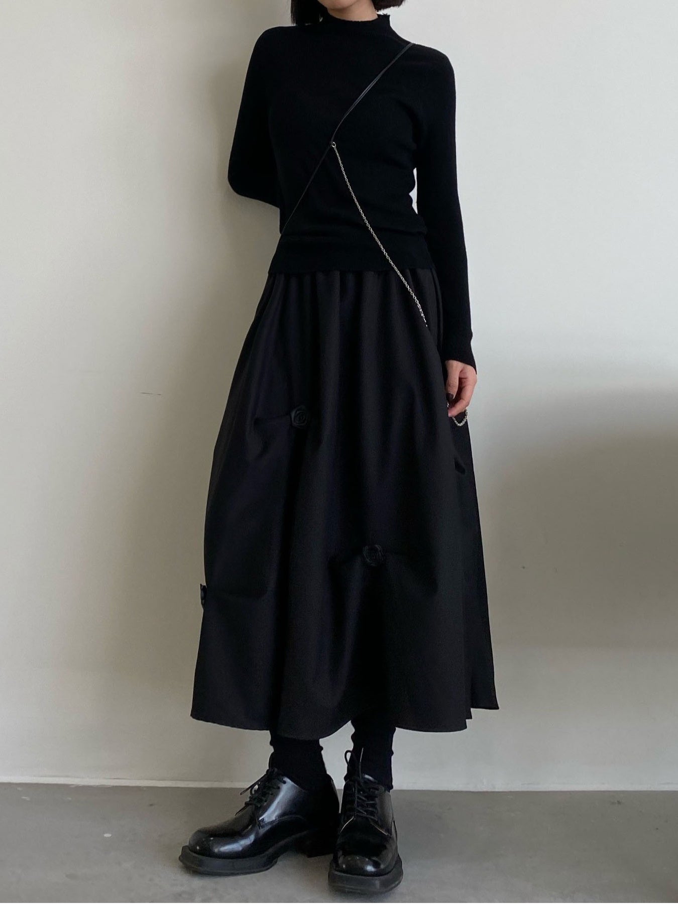 ハイウエスト仕様で脚長効果があり、Aラインシルエットが動きに優雅さをプラス。