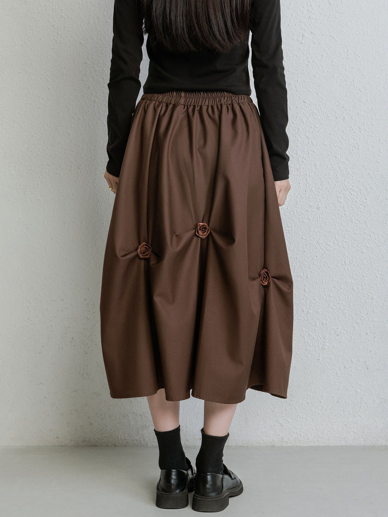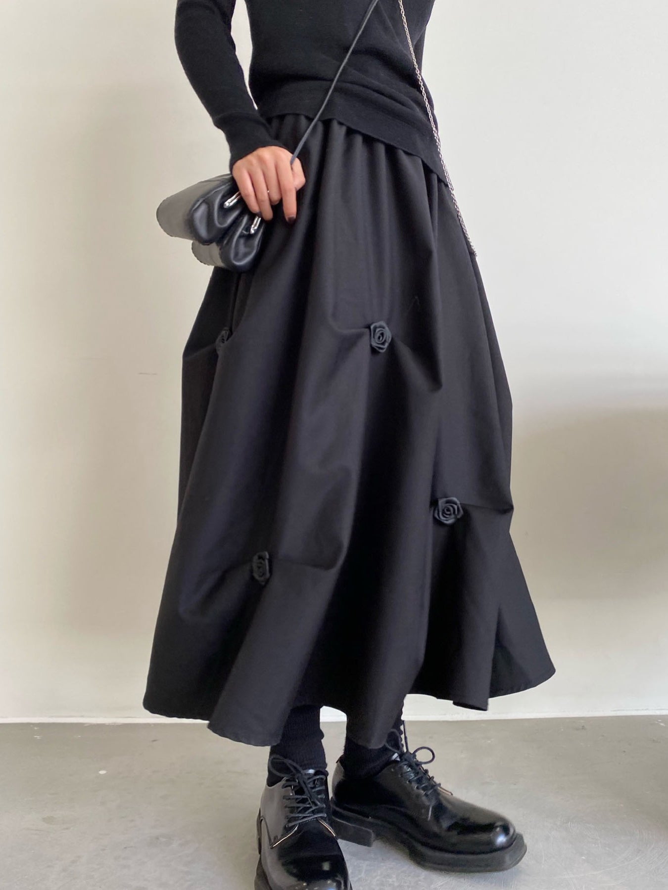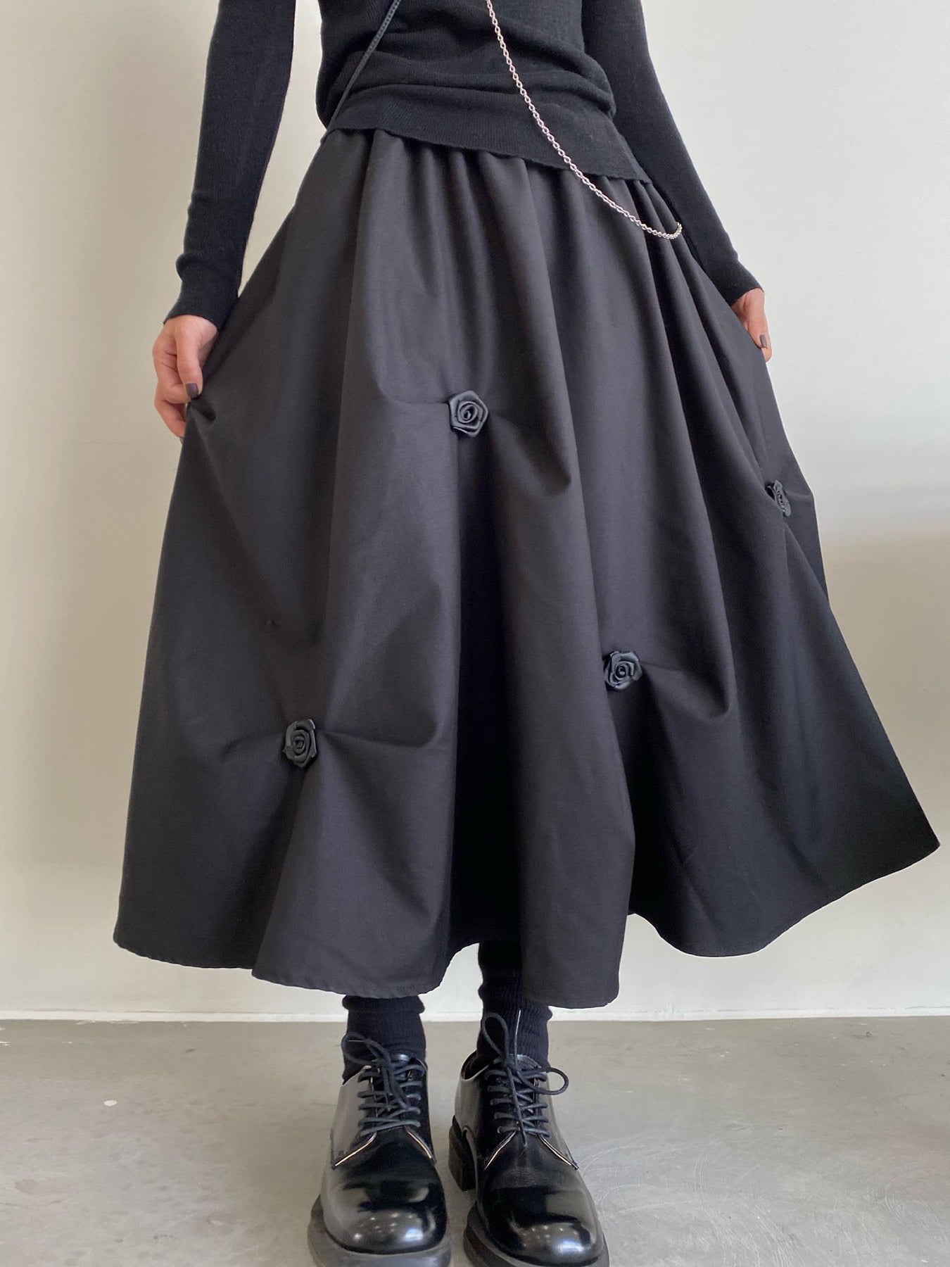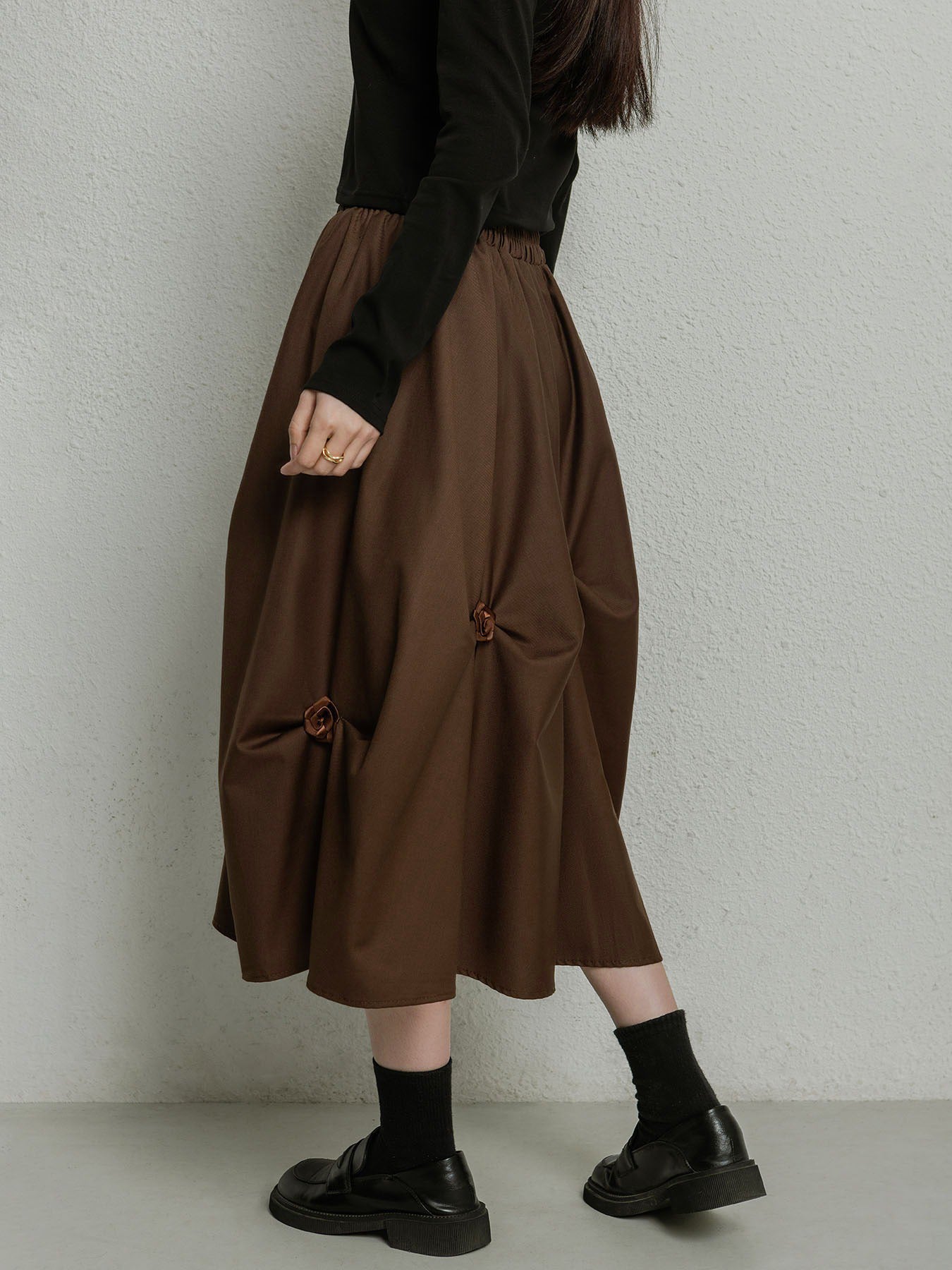 【ハイウエストプリーツ花Aラインミディアムスカート】