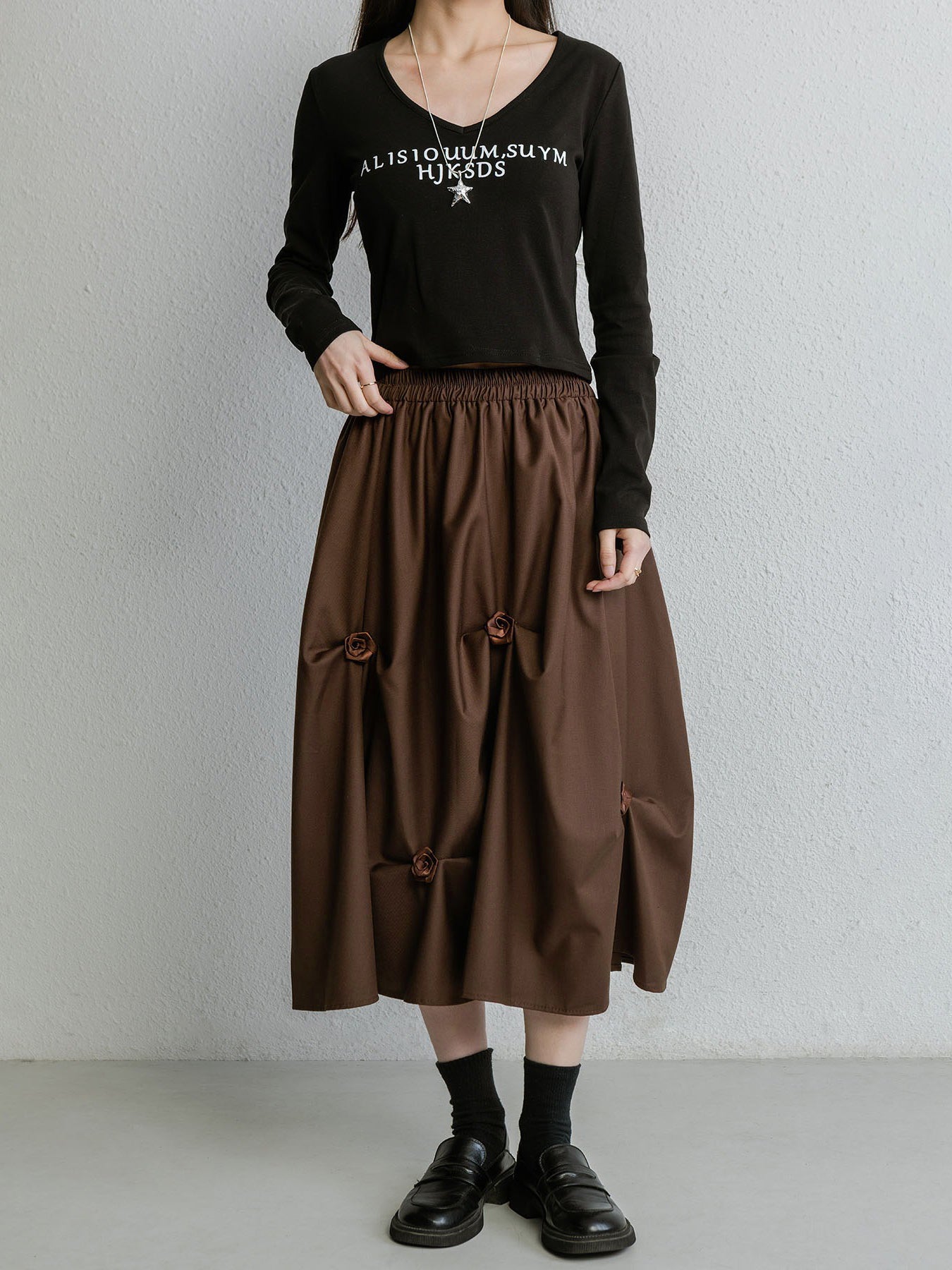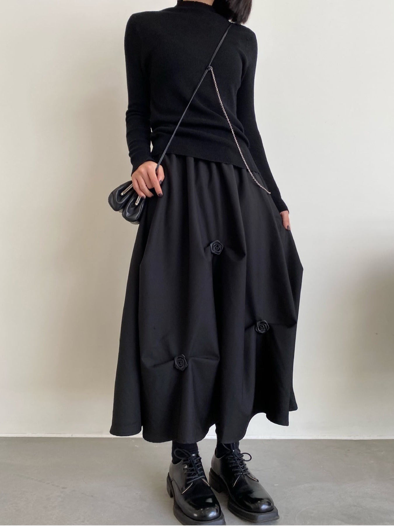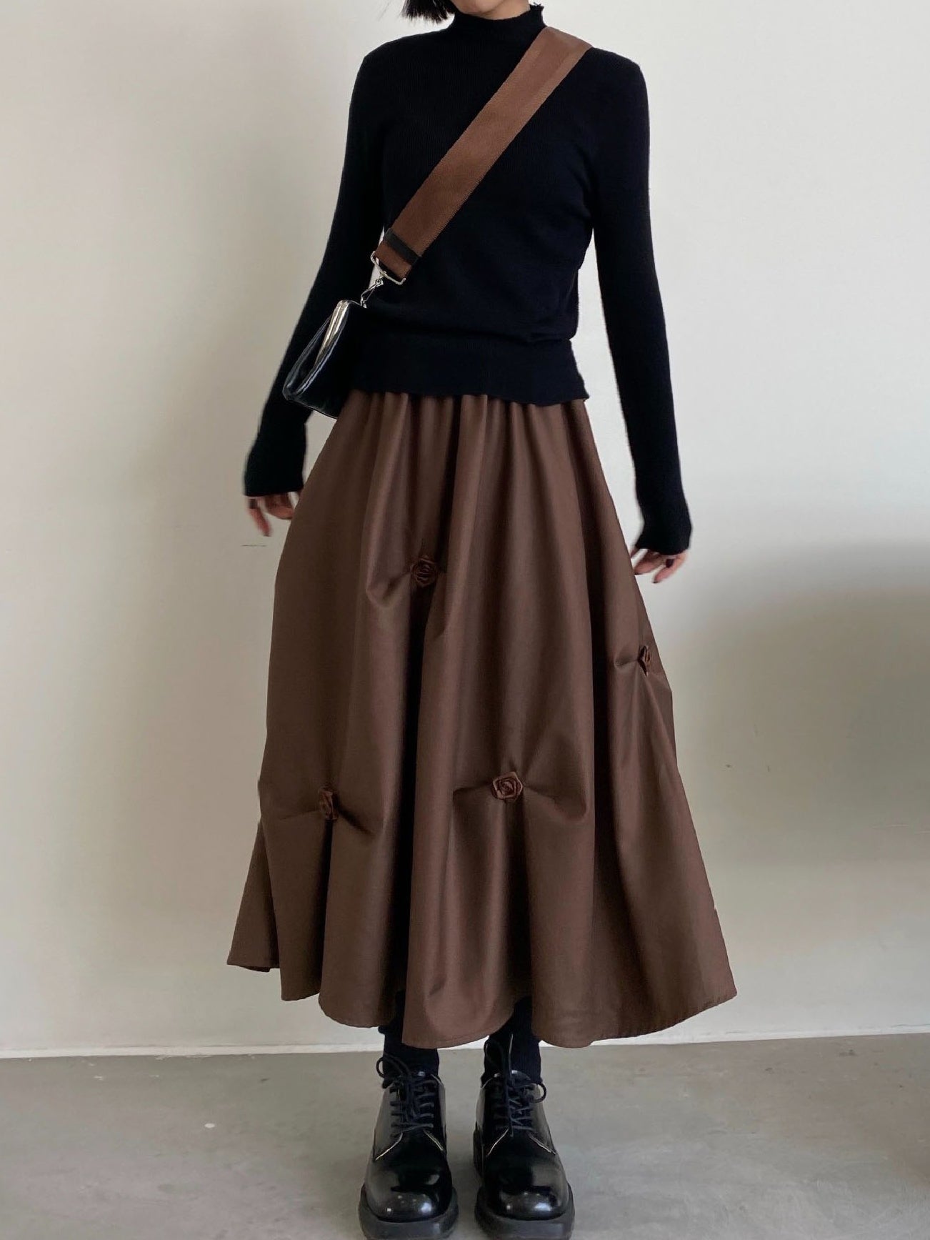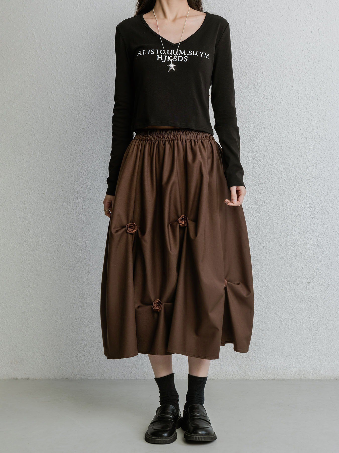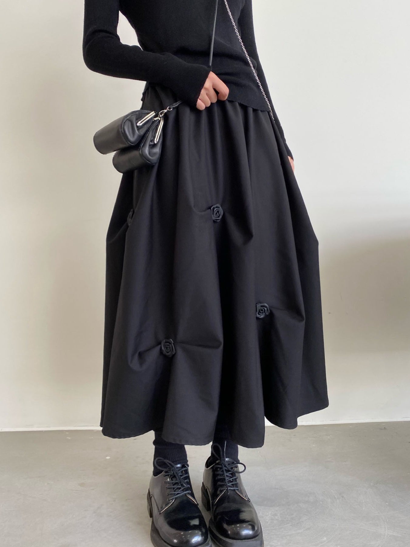 【ハイウエストプリーツ花Aラインミディアムスカート】
